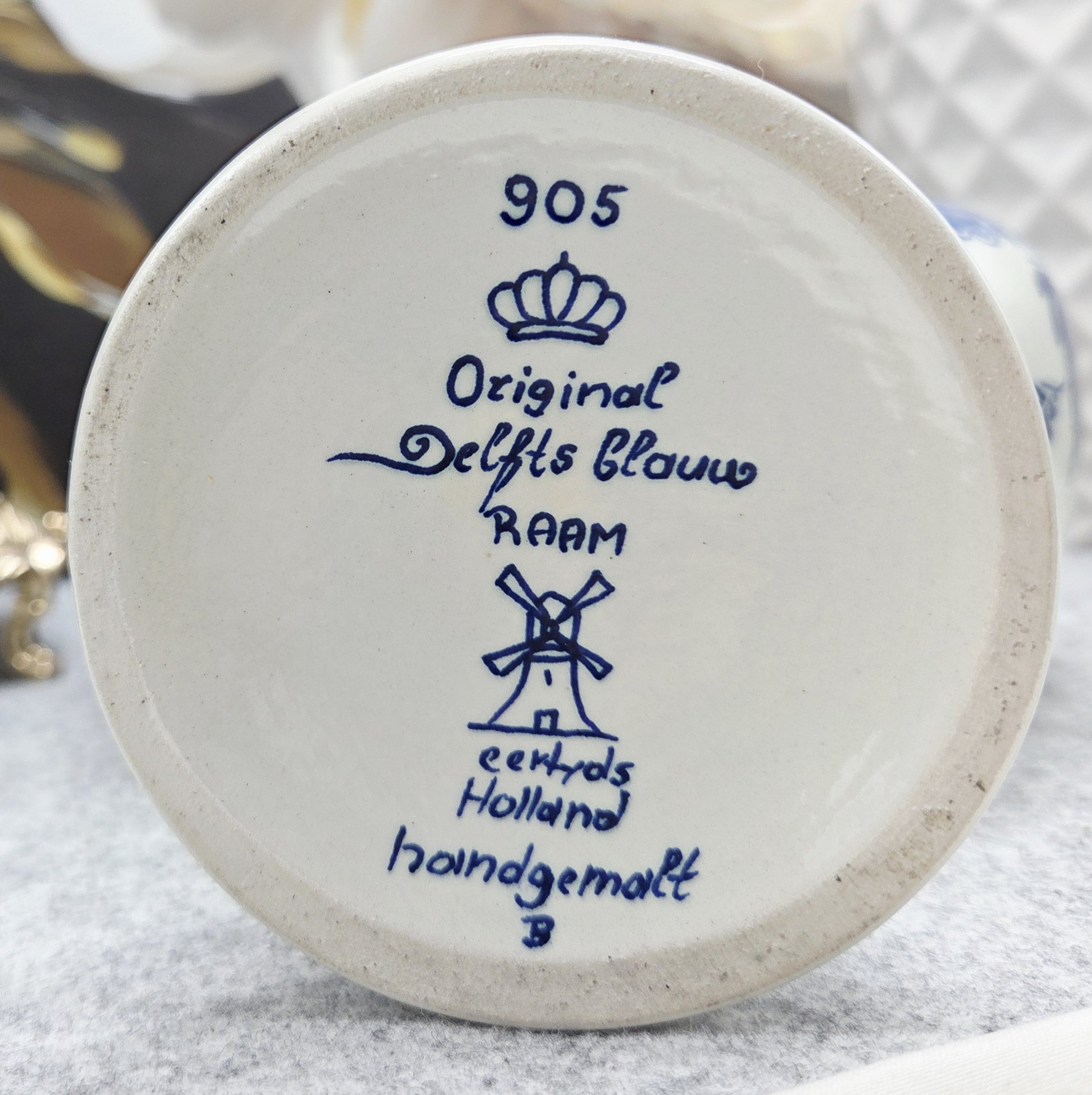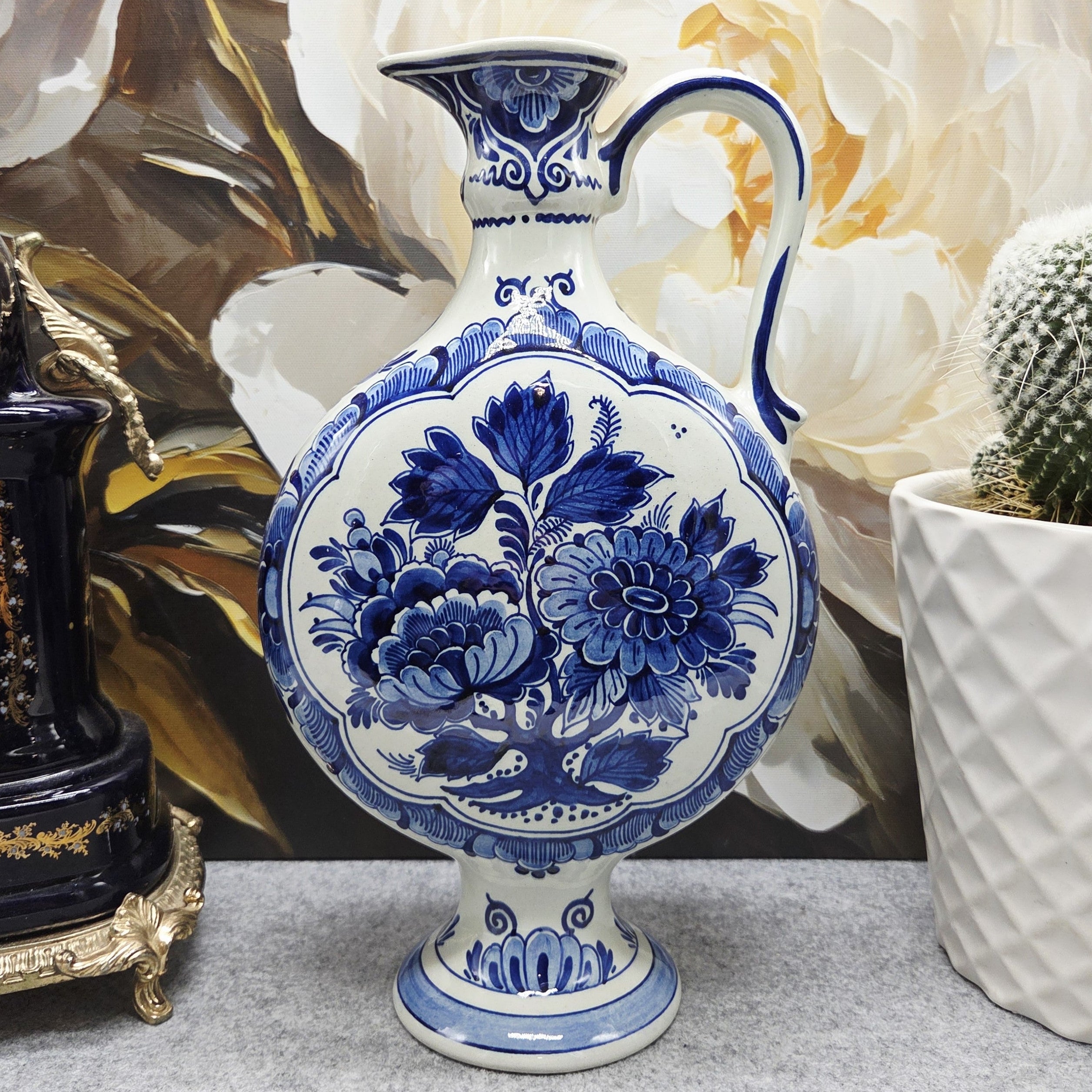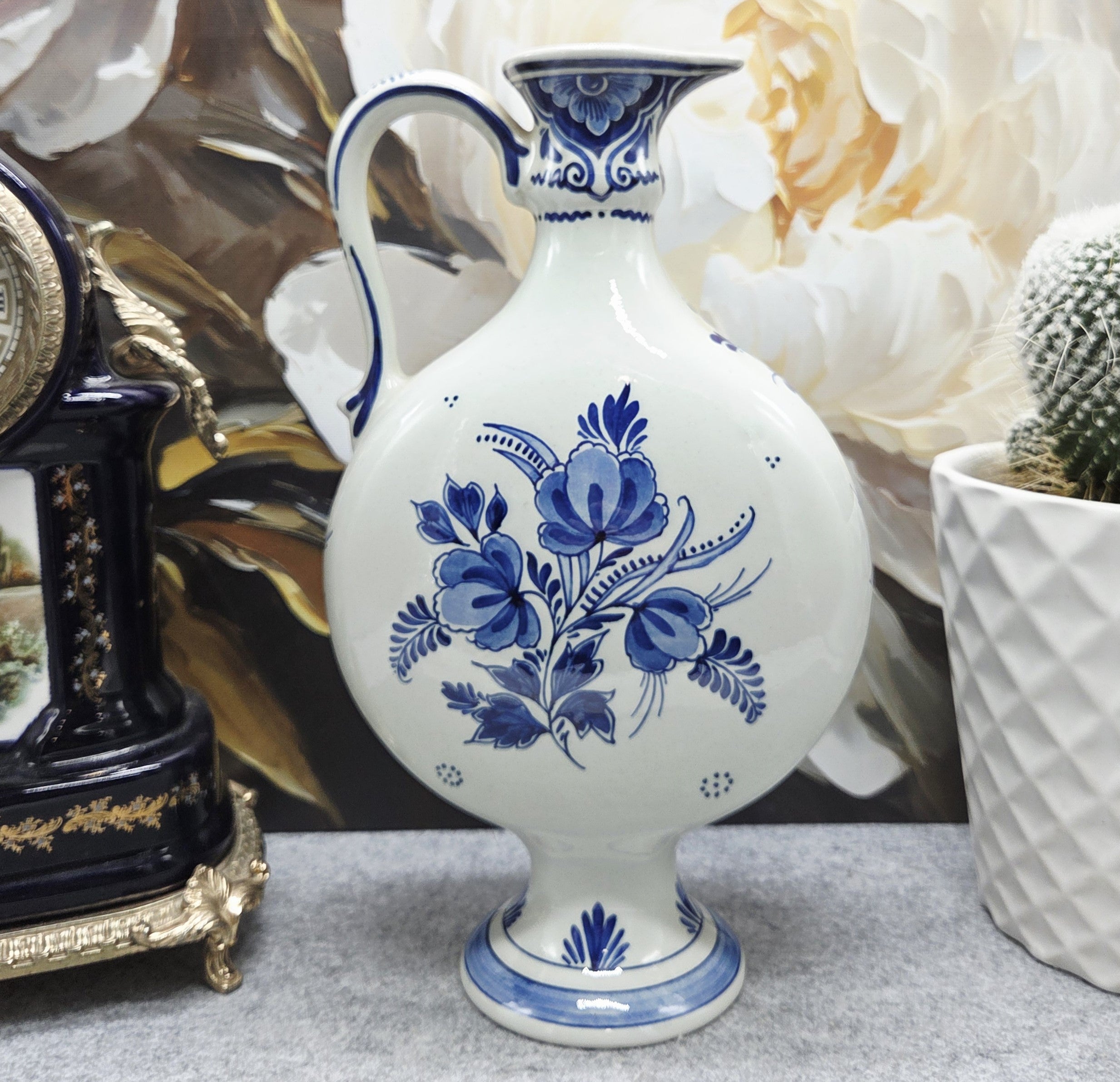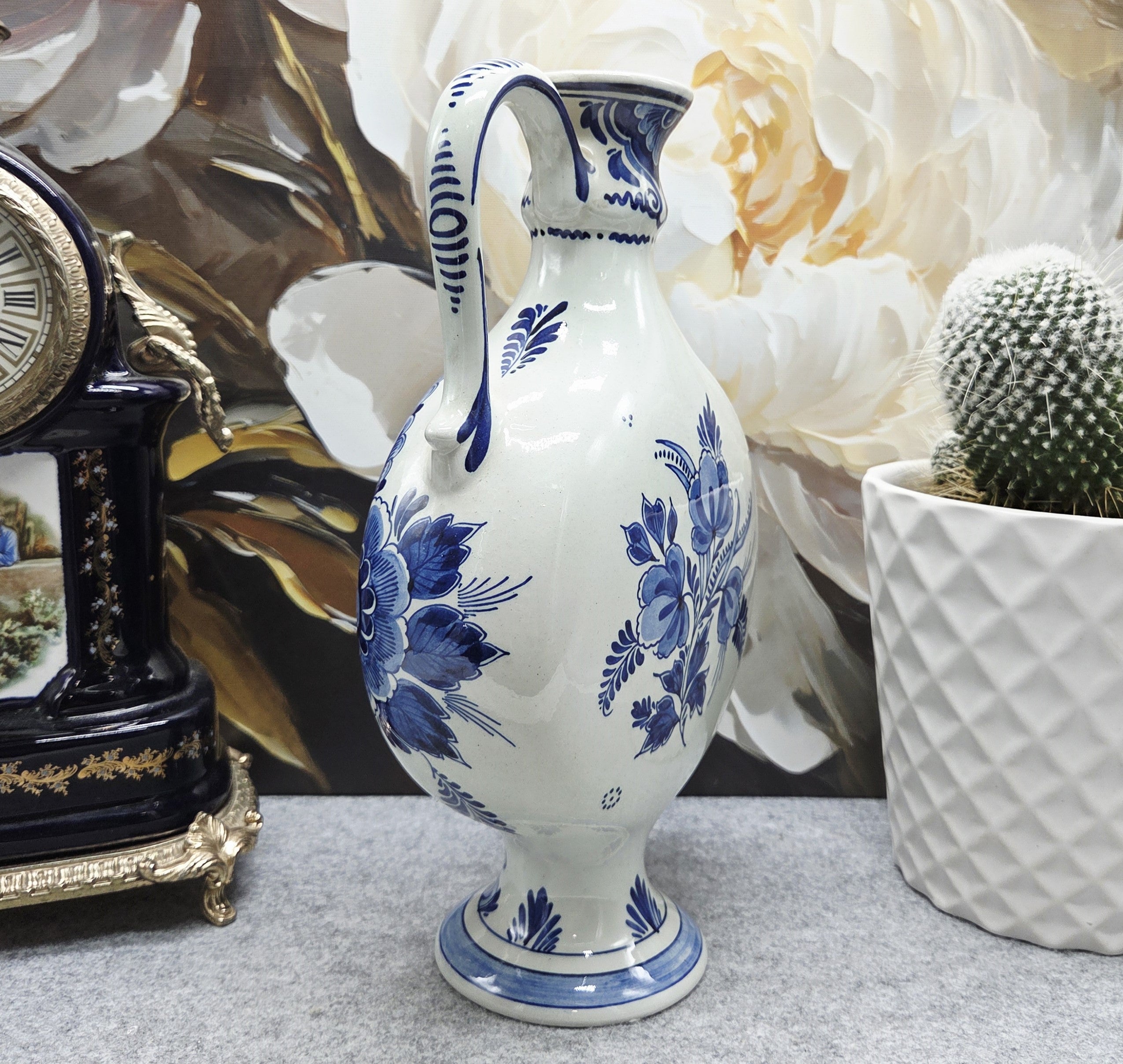 Dirbinys pažymėtas „Original Delfts Blauw – Handgemalt“, todėl tai rankomis dekoruotas olandiškas fajanso gaminys, vertinamas kolekcininkų ir interjero estetikos mėgėjų. Grakšti forma su elegantiška rankena leidžia jį naudoti tiek kaip dekoratyvinę vazą, tiek kaip nuostabų namų akcentą.