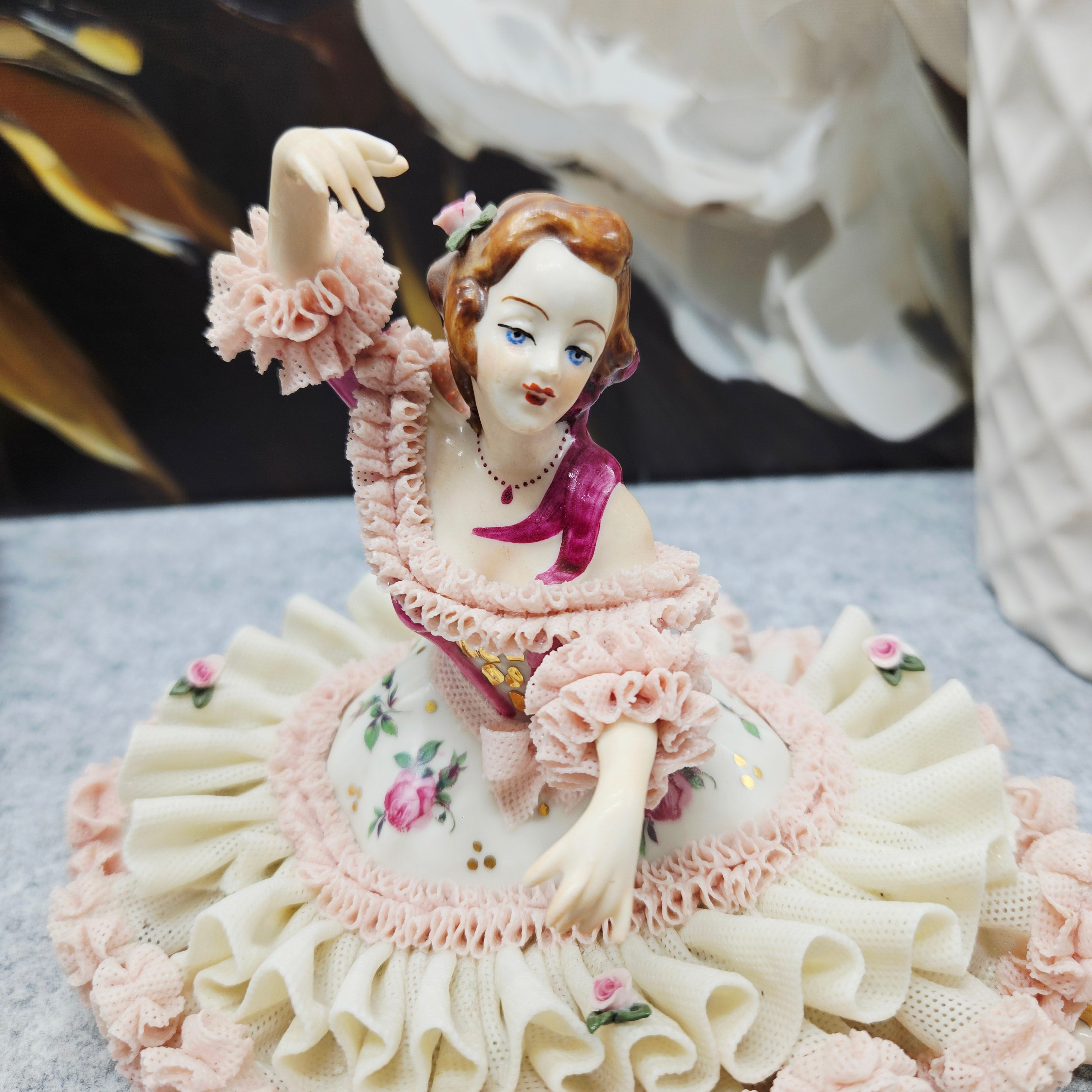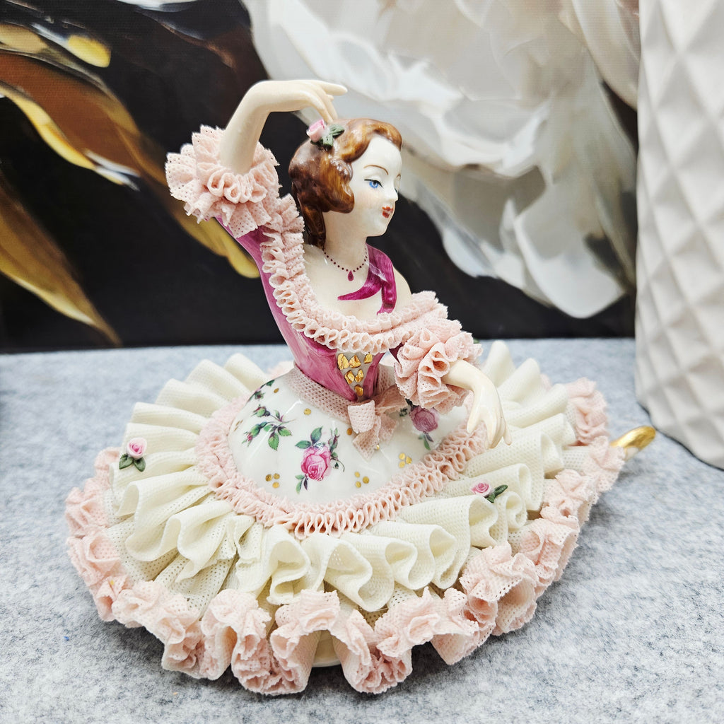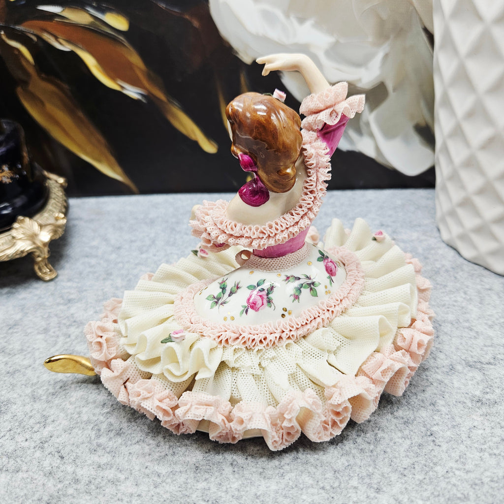 Gisela Keilhauer manufaktūra – tai istoriškai svarbi Bavarijos porceliano dirbtuvė, garsėjusi išskirtinėmis, rankomis formuotomis porceliano figūrėlėmis. Kiekviena figūrėlė buvo gaminama rankiniu būdu, ypatingai kruopščiai formuojant ažūrinius nėrinius iš porceliano masės, todėl jų vertė ir kolekcinis išskirtinumas išlieka labai aukštas iki šiol. Ši elegantiška statulėlė puikiai atspindi manufaktūros meistrystę – subtiliai modeliuota dama su gausiai klostuotu nėrinių sijonu, dekoruotu švelnių pastelinių tonų raukiniais ir rankomis tapytais rožių akcentais. Grakšti poza, išraiškingos detalės, sodrios spalvos ir aukso akcentai kuria prabangų bei romantišką vizualinį įspūdį. Tai ne tik dekoratyvinė interjero detalė, bet ir aukštosios porceliano kultūros istorijos fragmentas, vertinamas kolekcionierių visame pasaulyje.