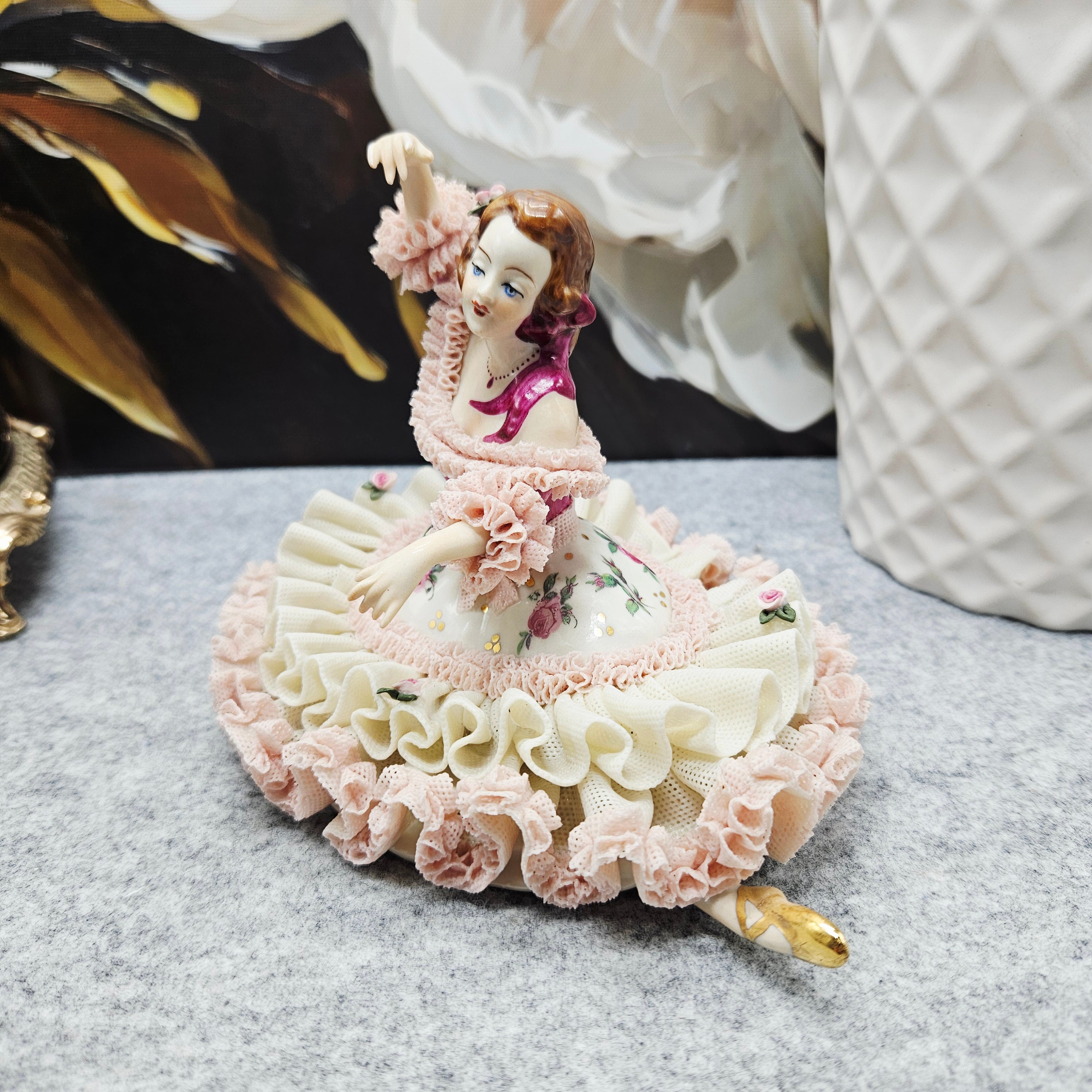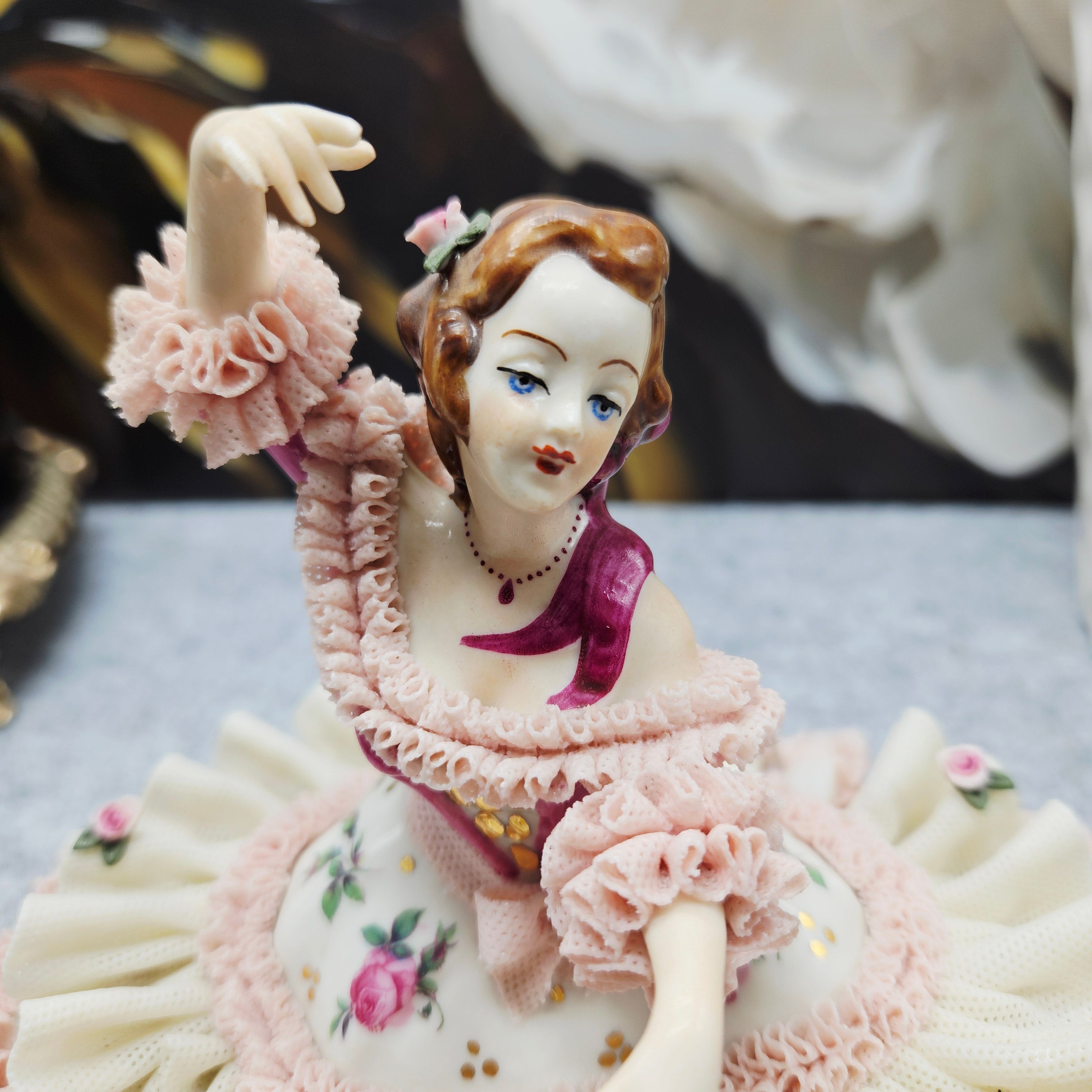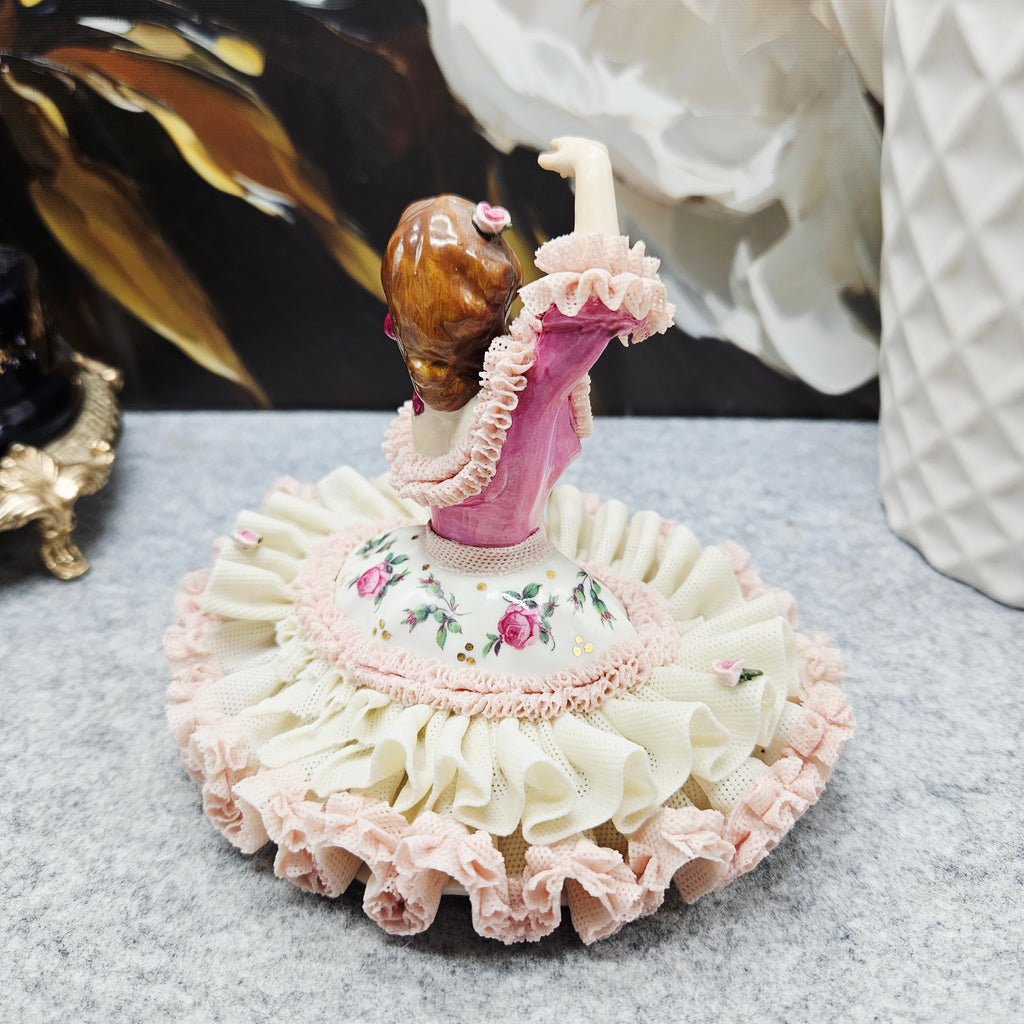 Gisela Keilhauer manufaktūra – tai istoriškai svarbi Bavarijos porceliano dirbtuvė, garsėjusi išskirtinėmis, rankomis formuotomis porceliano figūrėlėmis. Kiekviena figūrėlė buvo gaminama rankiniu būdu, ypatingai kruopščiai formuojant ažūrinius nėrinius iš porceliano masės, todėl jų vertė ir kolekcinis išskirtinumas išlieka labai aukštas iki šiol. Ši elegantiška statulėlė puikiai atspindi manufaktūros meistrystę – subtiliai modeliuota dama su gausiai klostuotu nėrinių sijonu, dekoruotu švelnių pastelinių tonų raukiniais ir rankomis tapytais rožių akcentais. Grakšti poza, išraiškingos detalės, sodrios spalvos ir aukso akcentai kuria prabangų bei romantišką vizualinį įspūdį. Tai ne tik dekoratyvinė interjero detalė, bet ir aukštosios porceliano kultūros istorijos fragmentas, vertinamas kolekcionierių visame pasaulyje.
