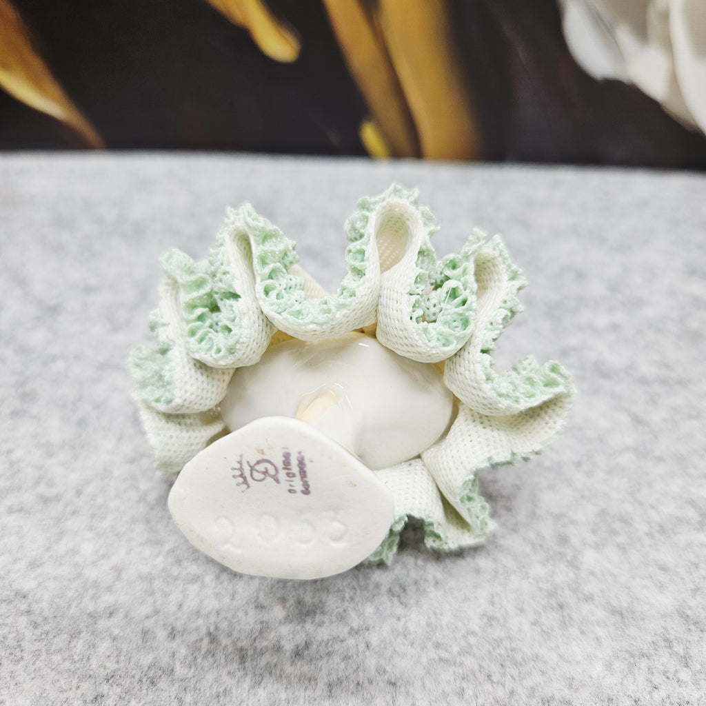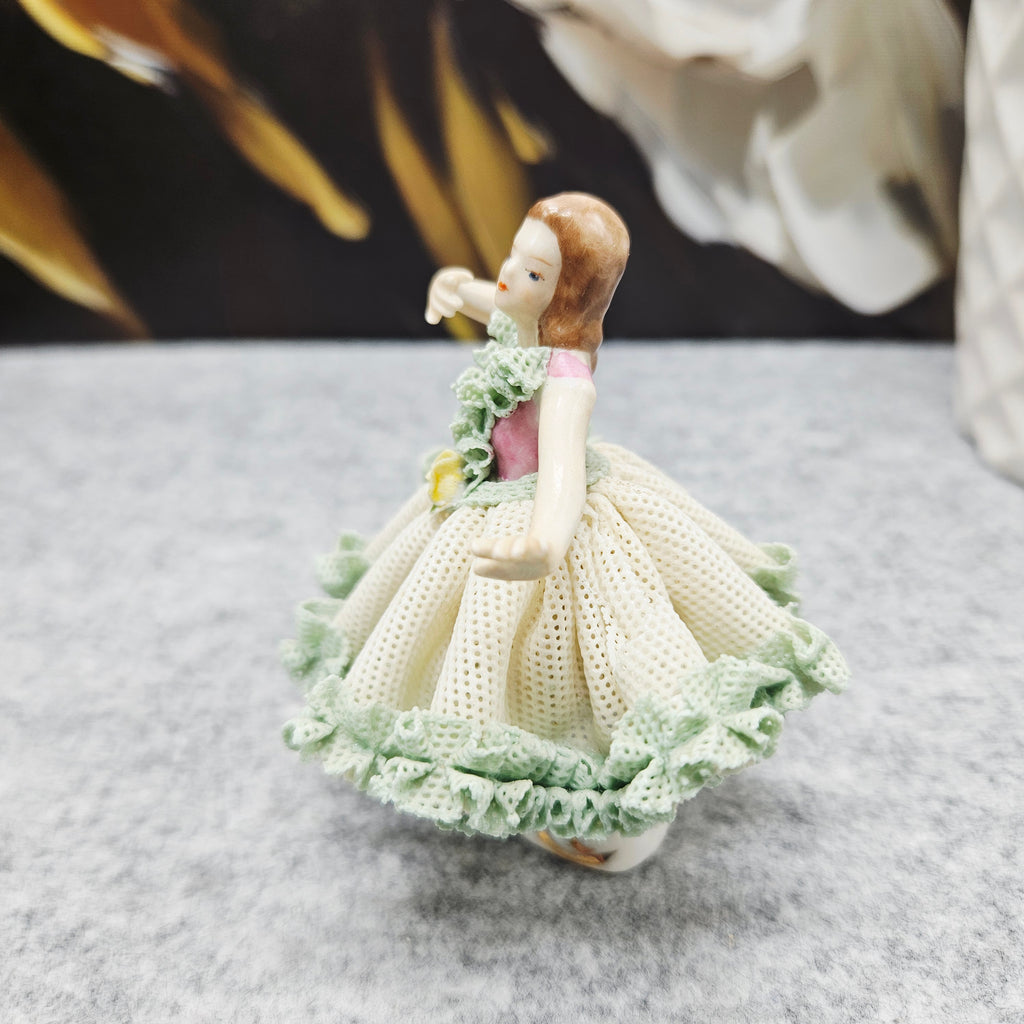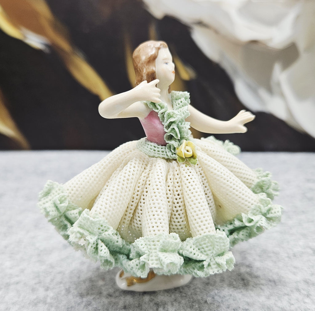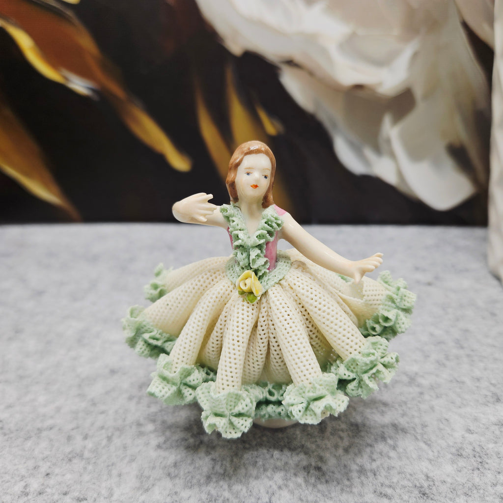 Ši grakšti porceliano statulėlė vaizduoja elegantišką damą, pasipuošusią puošnia, rankų darbo ažūrine suknele. Kiekvienas silueto lankas, rankų linija ir raukšlėtas sijono dekoras atkartoja kruopščiai išdirbtą meistrystę ir subtilumą. Švelnus pastelinis spalvų derinys suteikia figūrėlei romantiškos lengvumo atmosferos ir rafinuotos prabangos įspūdį. Tai ne tik dekoratyvinis elementas interjerui, bet ir mažas meno kūrinys, kuris taps ypatingu akcentu kolekcijoje arba dovanų idėja ypatingai progai.