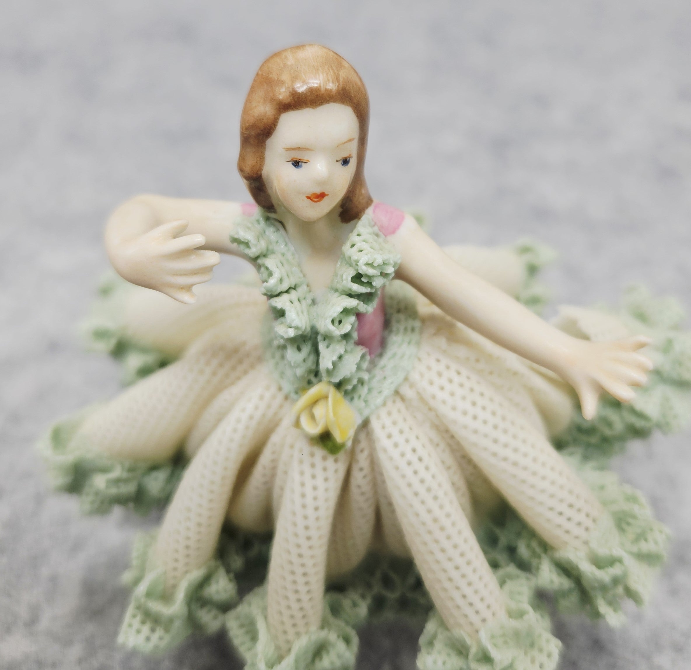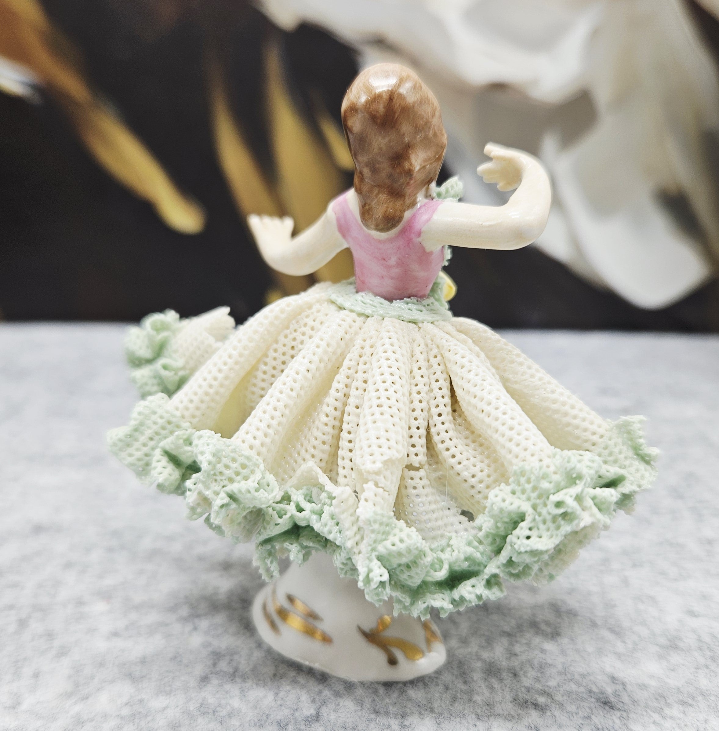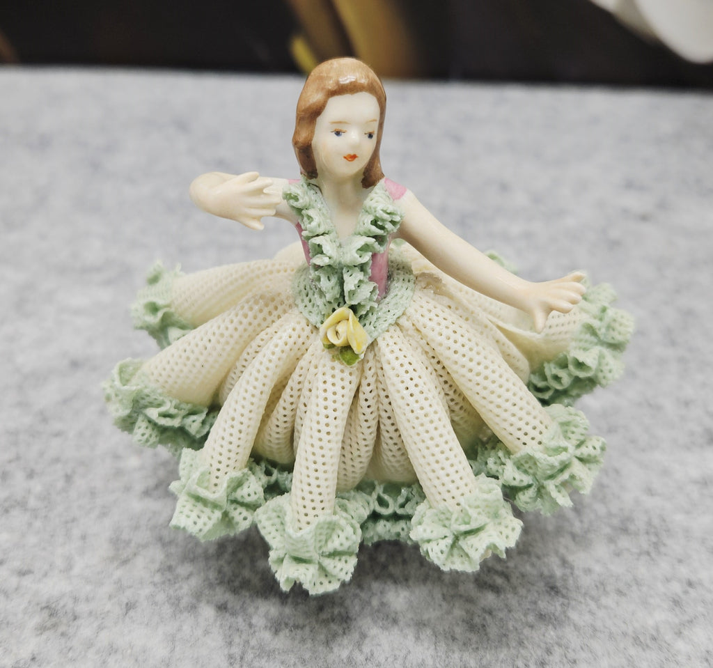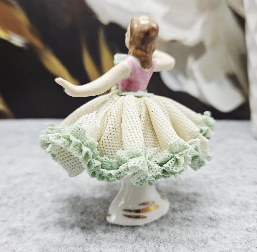 Ši grakšti porceliano statulėlė vaizduoja elegantišką damą, pasipuošusią puošnia, rankų darbo ažūrine suknele. Kiekvienas silueto lankas, rankų linija ir raukšlėtas sijono dekoras atkartoja kruopščiai išdirbtą meistrystę ir subtilumą. Švelnus pastelinis spalvų derinys suteikia figūrėlei romantiškos lengvumo atmosferos ir rafinuotos prabangos įspūdį. Tai ne tik dekoratyvinis elementas interjerui, bet ir mažas meno kūrinys, kuris taps ypatingu akcentu kolekcijoje arba dovanų idėja ypatingai progai.