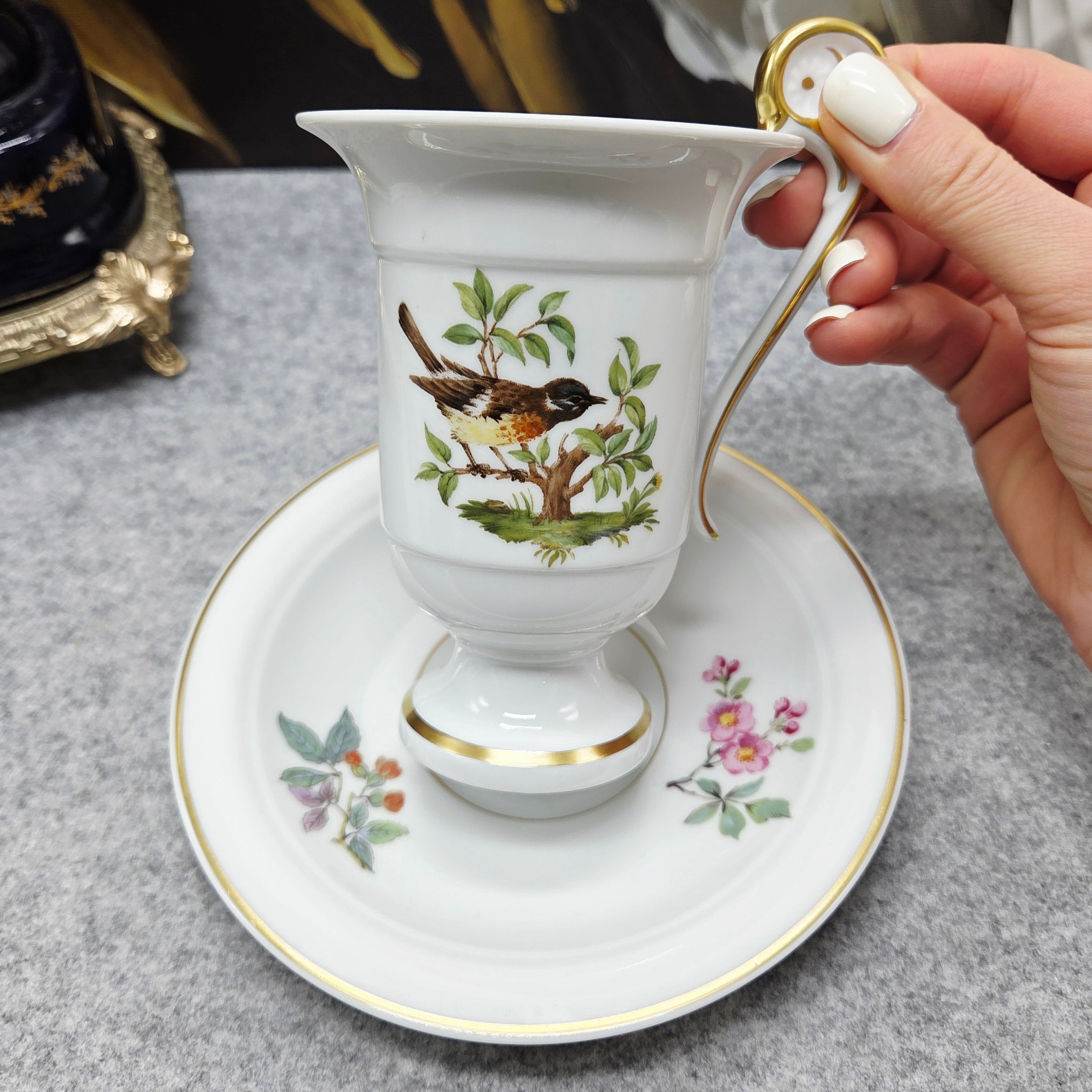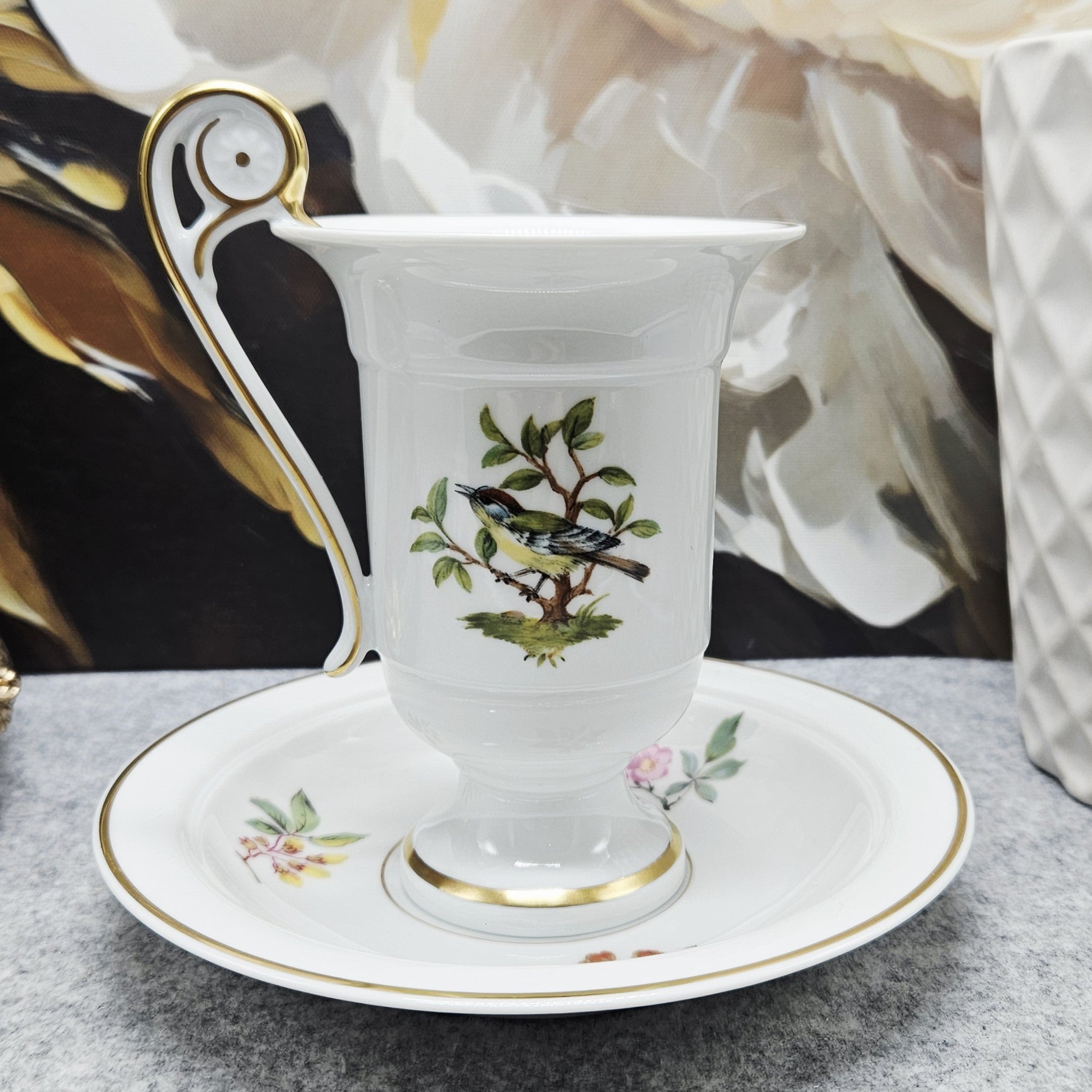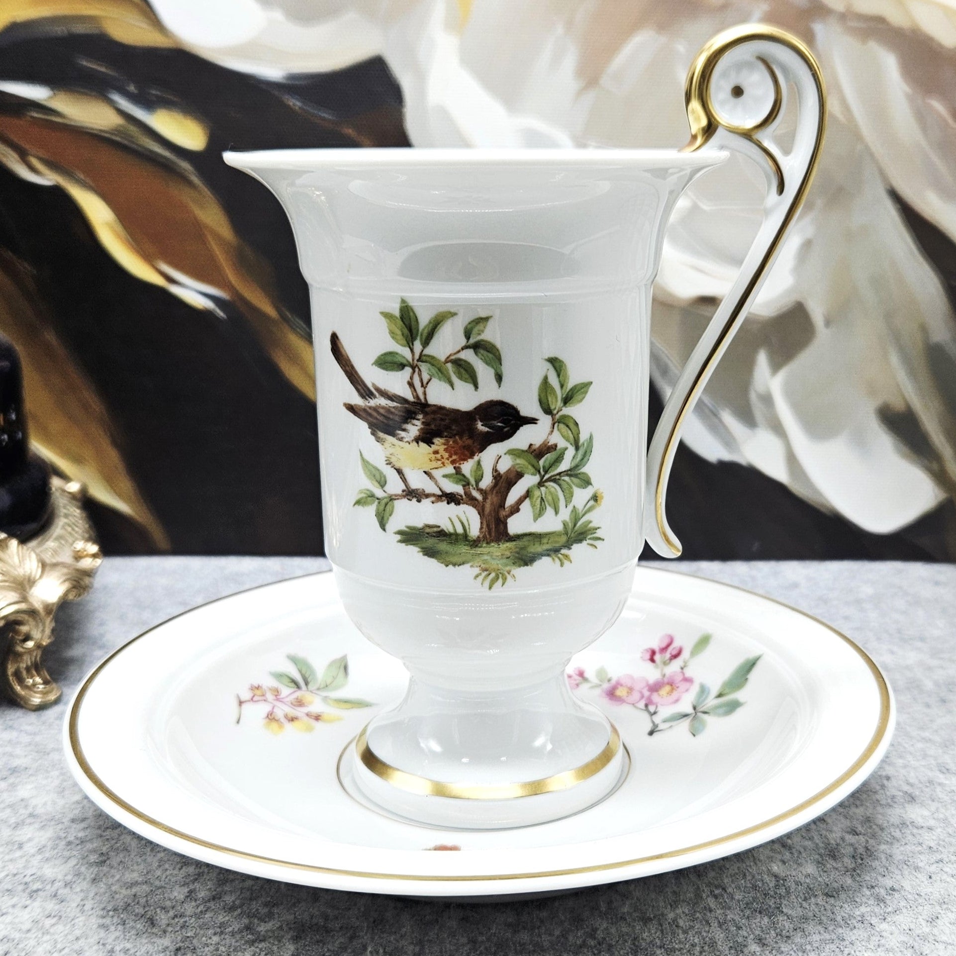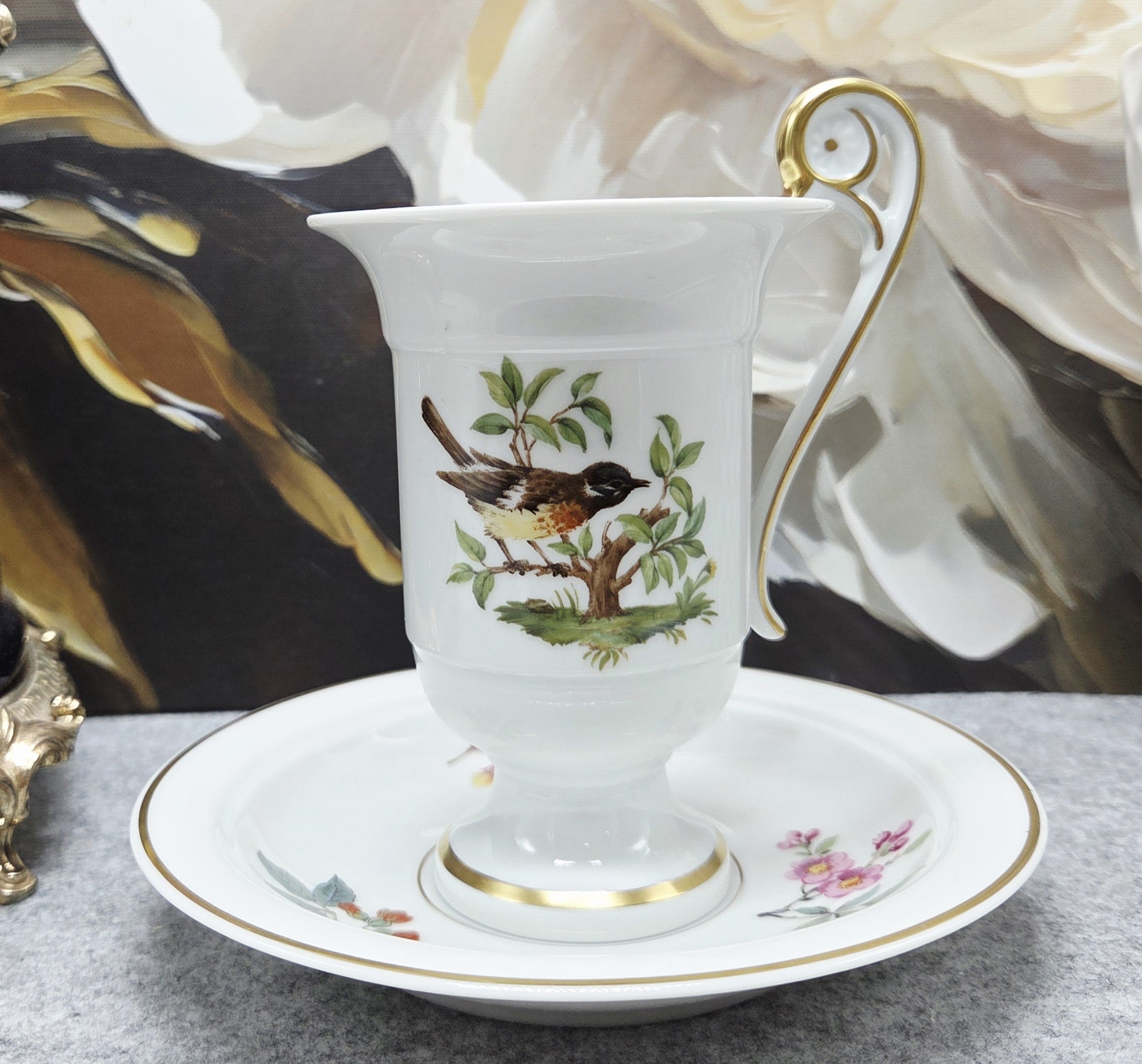 Šis balto porceliano puodelis „Ak Kaiser W Germany“, dekoruotas paukštelių, tupinčių ant medžių šalkų iliustracijomis ir jas įreminančiomis auksinėmis linijomis. Šis dizainas išsiskiria itin puošnia rankenėle, kuri primena gulbės kaklą. Lėkštelė dekoruota gėlių, gilių ir miško uogų kompozicijomis.