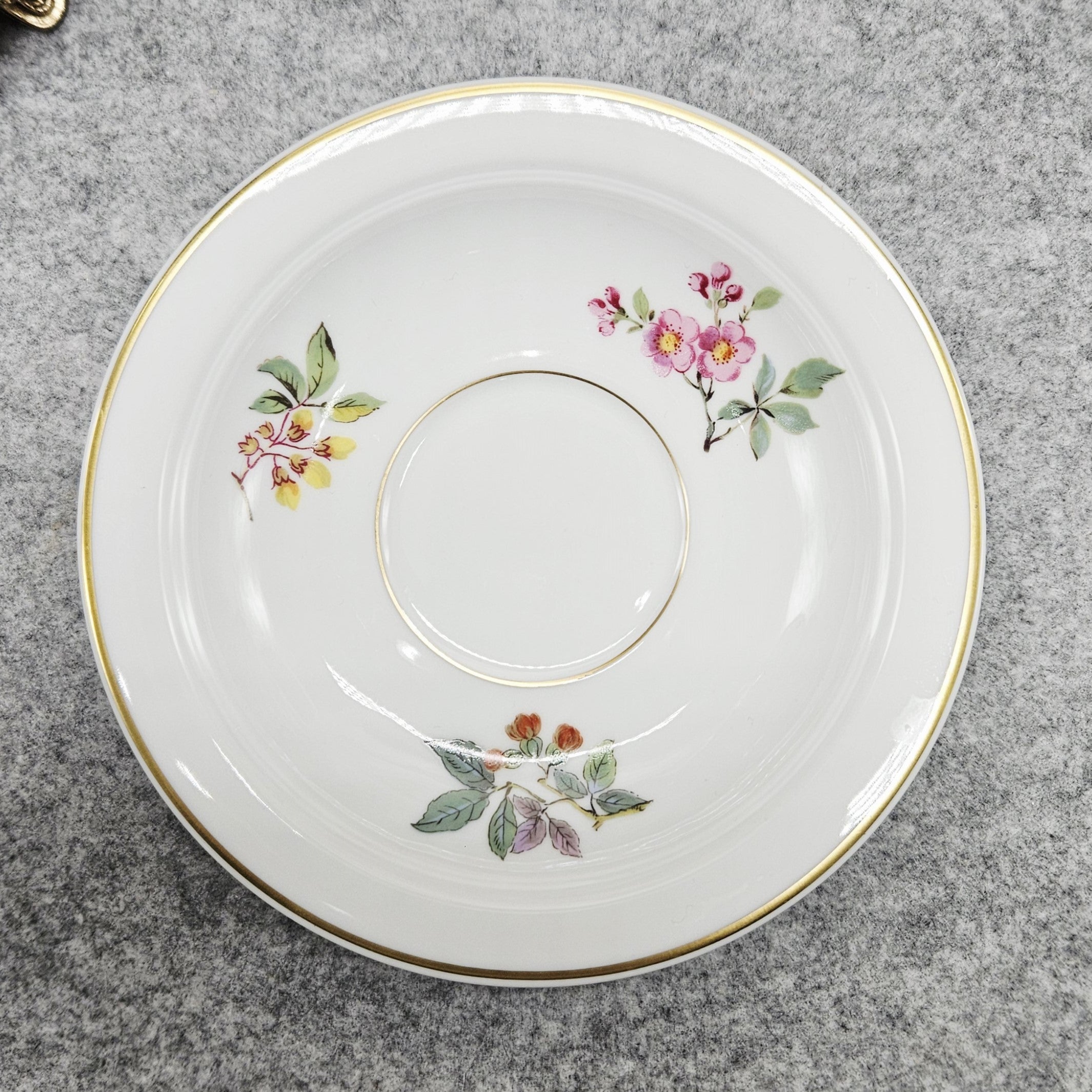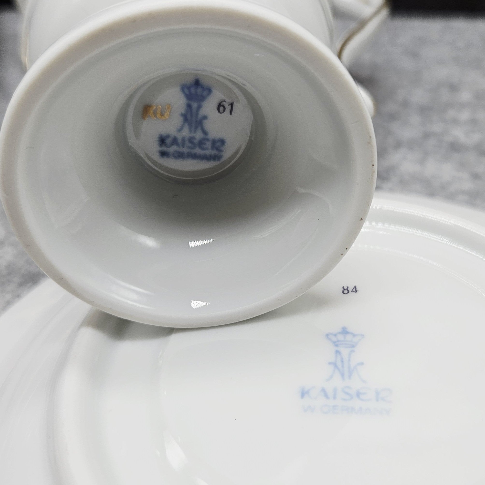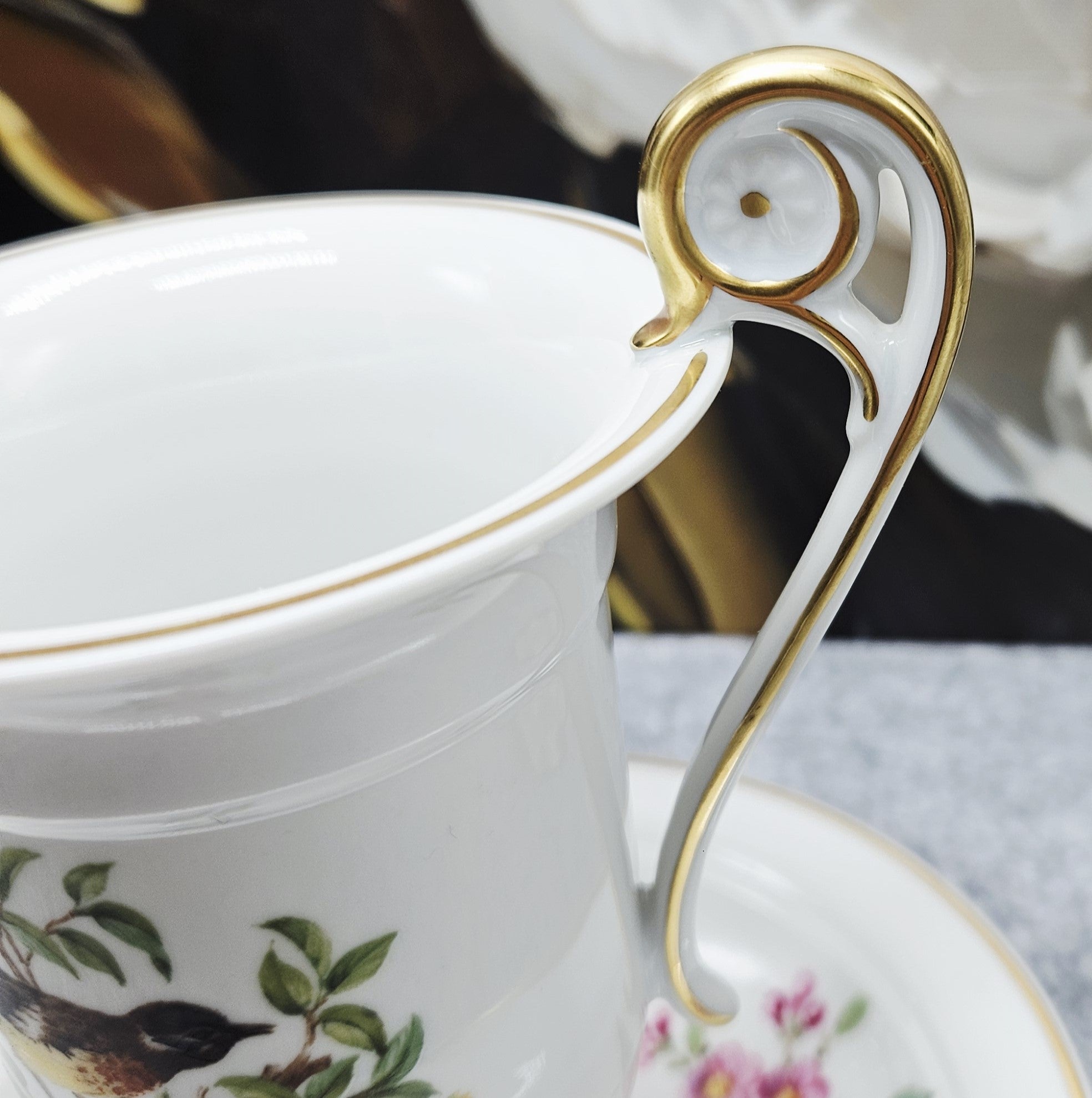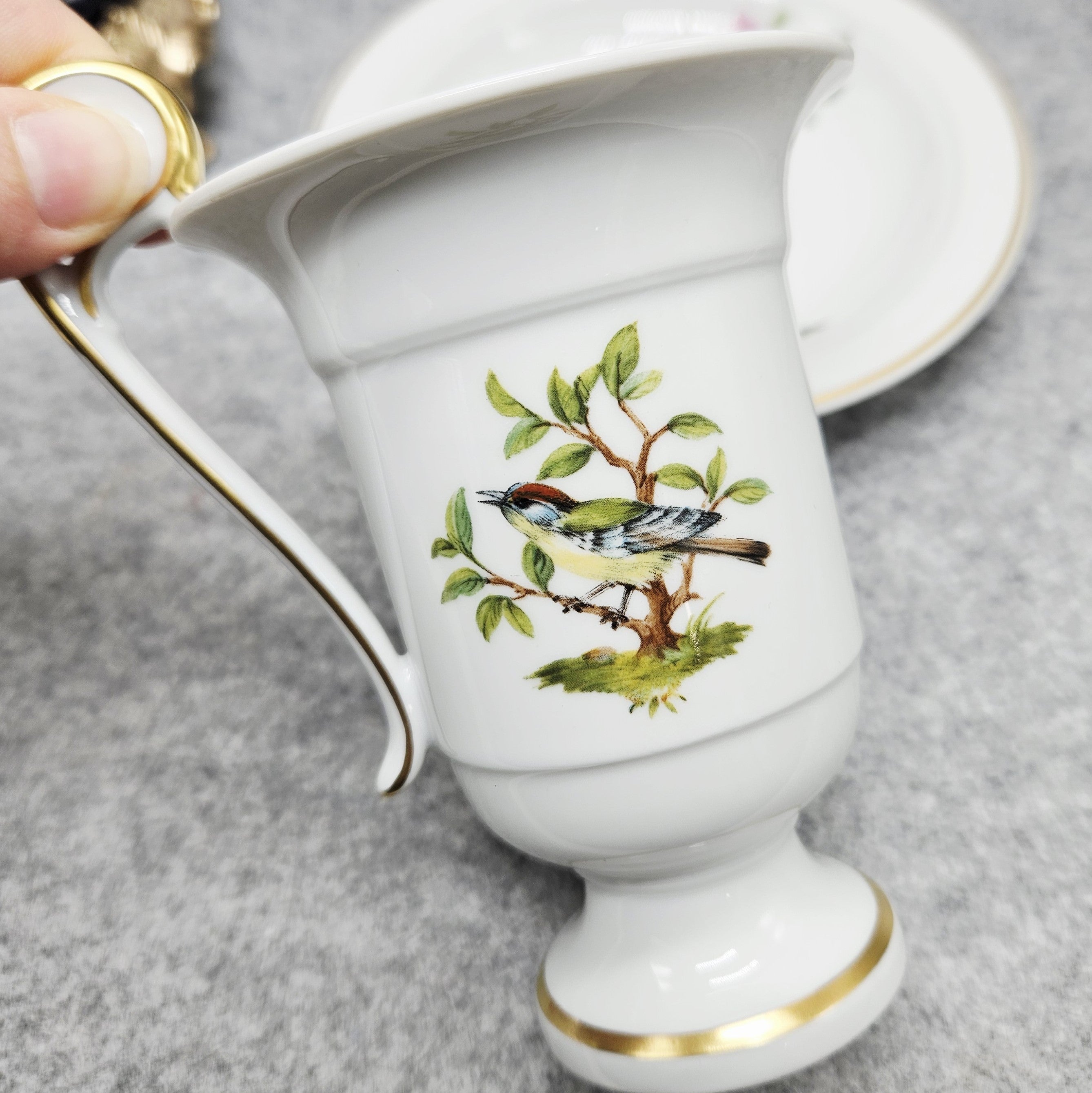 Šis balto porceliano puodelis „Ak Kaiser W Germany“, dekoruotas paukštelių, tupinčių ant medžių šalkų iliustracijomis ir jas įreminančiomis auksinėmis linijomis. Šis dizainas išsiskiria itin puošnia rankenėle, kuri primena gulbės kaklą. Lėkštelė dekoruota gėlių, gilių ir miško uogų kompozicijomis.