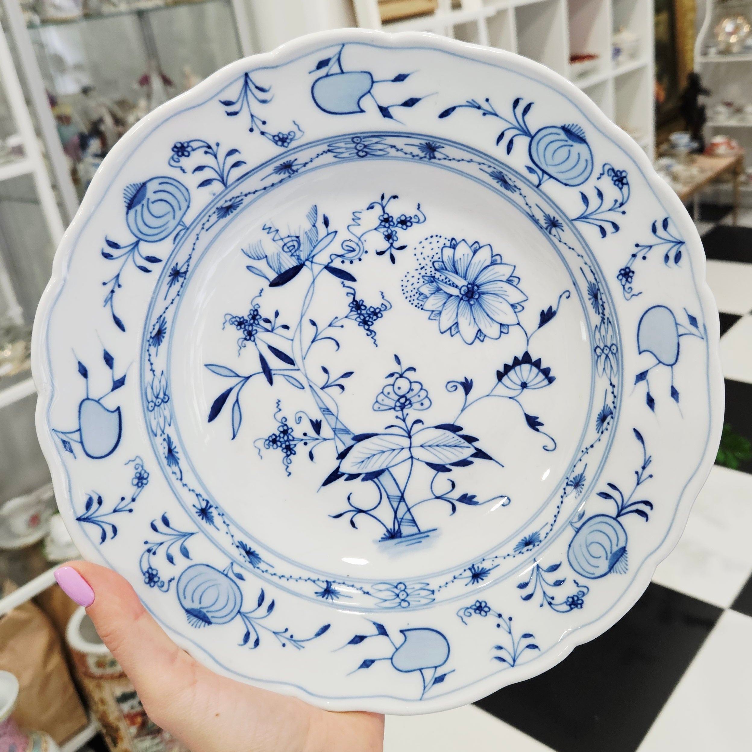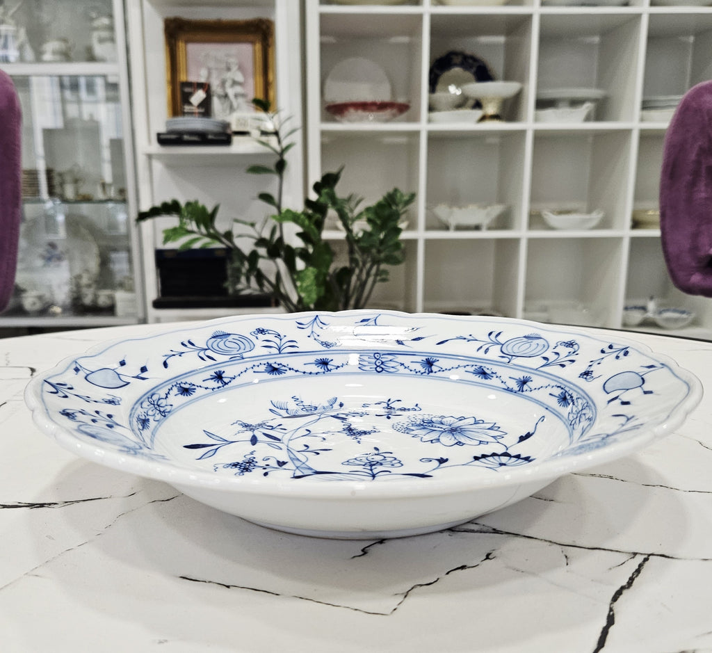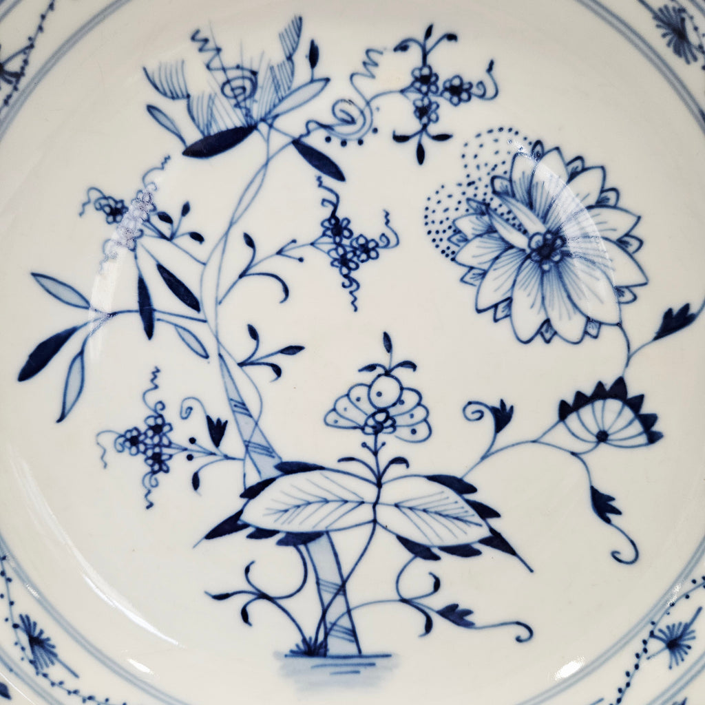 Autentiška Meissen manufaktūros laikotarpio, Carl Teichert (1870–1900) gamybos gilioji pietų lėkštė su klasikiniu mėlynu „Zwiebelmuster“ (svogūnų rašto) dekoru. Šis rankomis tapytas motyvas – vienas žymiausių Meissen porceliano simbolių, atkuriantis stilizuotus rytietiškus vaisių ir gėlių elementus – granatą, bambuką, persiką ir asters žiedus.