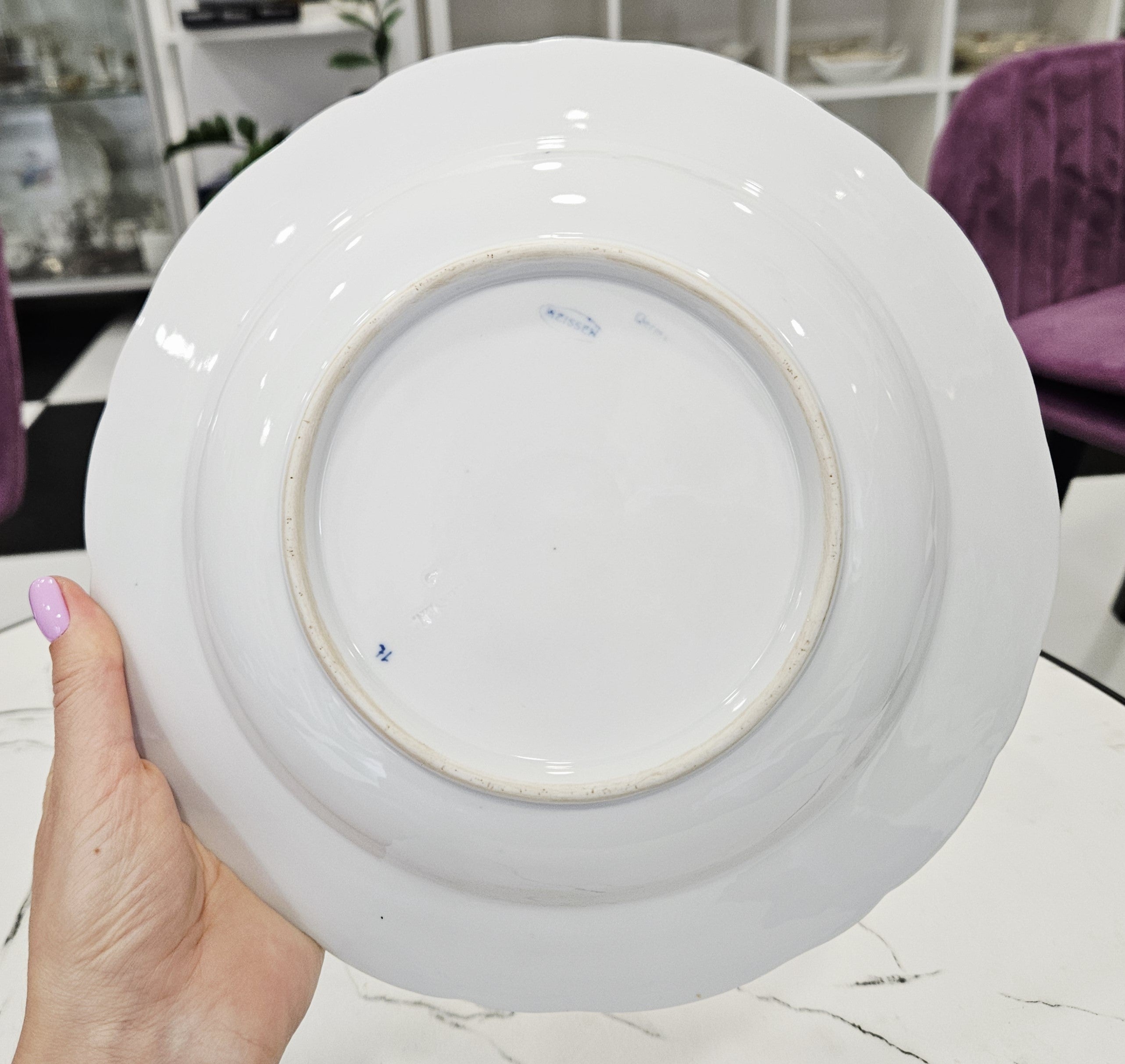 Lėkštės kraštai subtiliai banguoti, glazūra švytinti ir lygiai užtepta, dekoras išsaugotas puikios būklės. Tai kolekcinis pavyzdys, vertinamas dėl savo istorinio laikotarpio ir neblėstančios elegancijos.