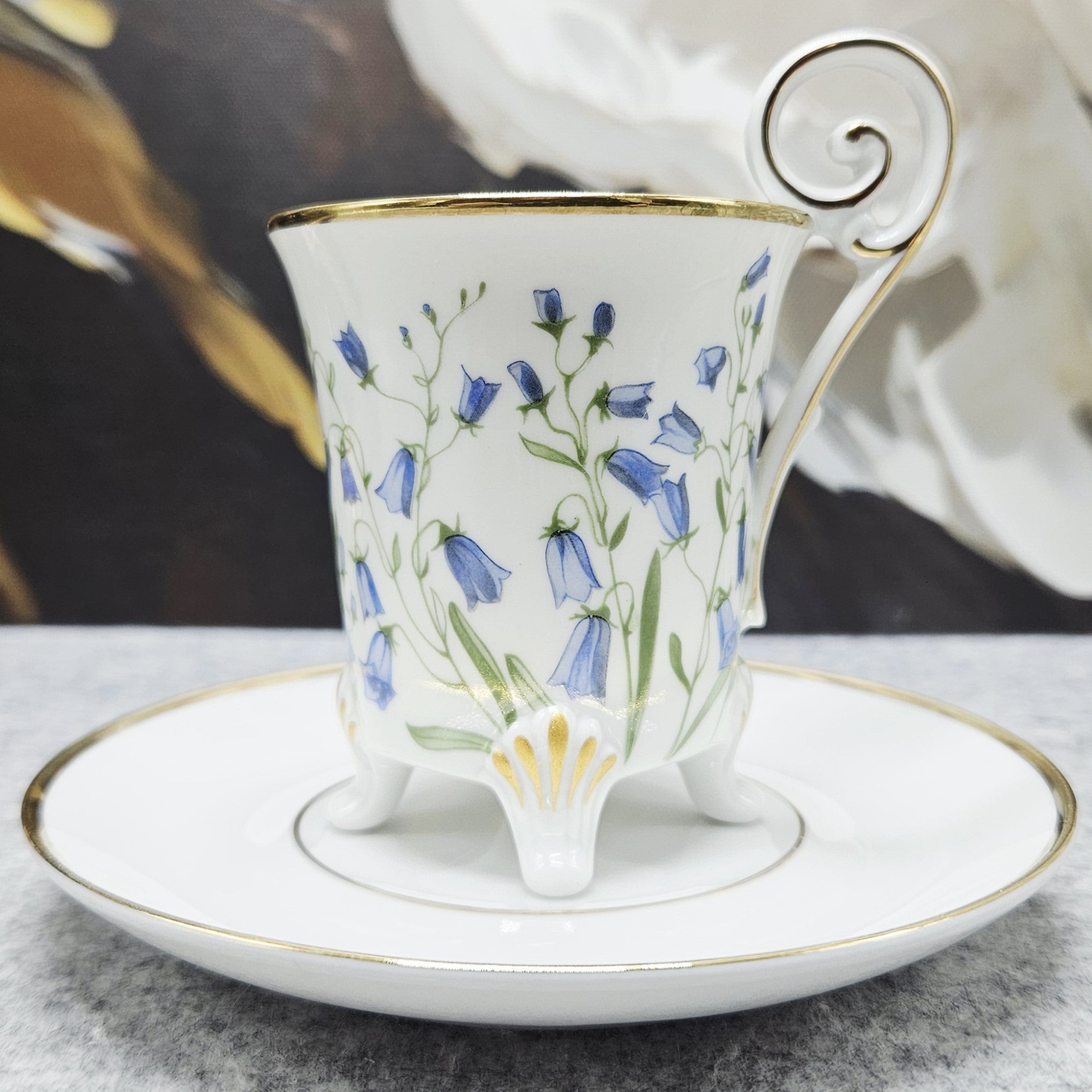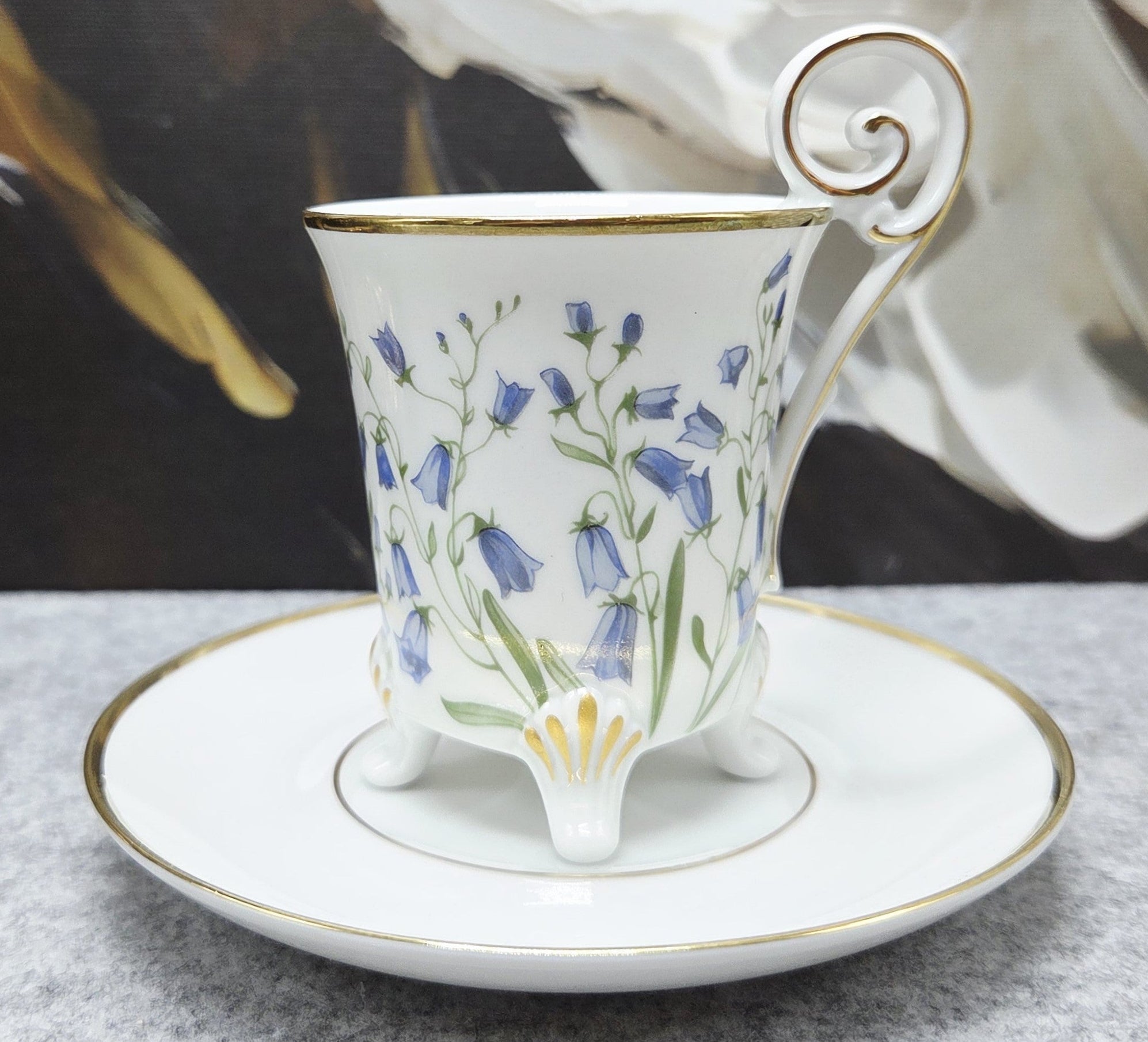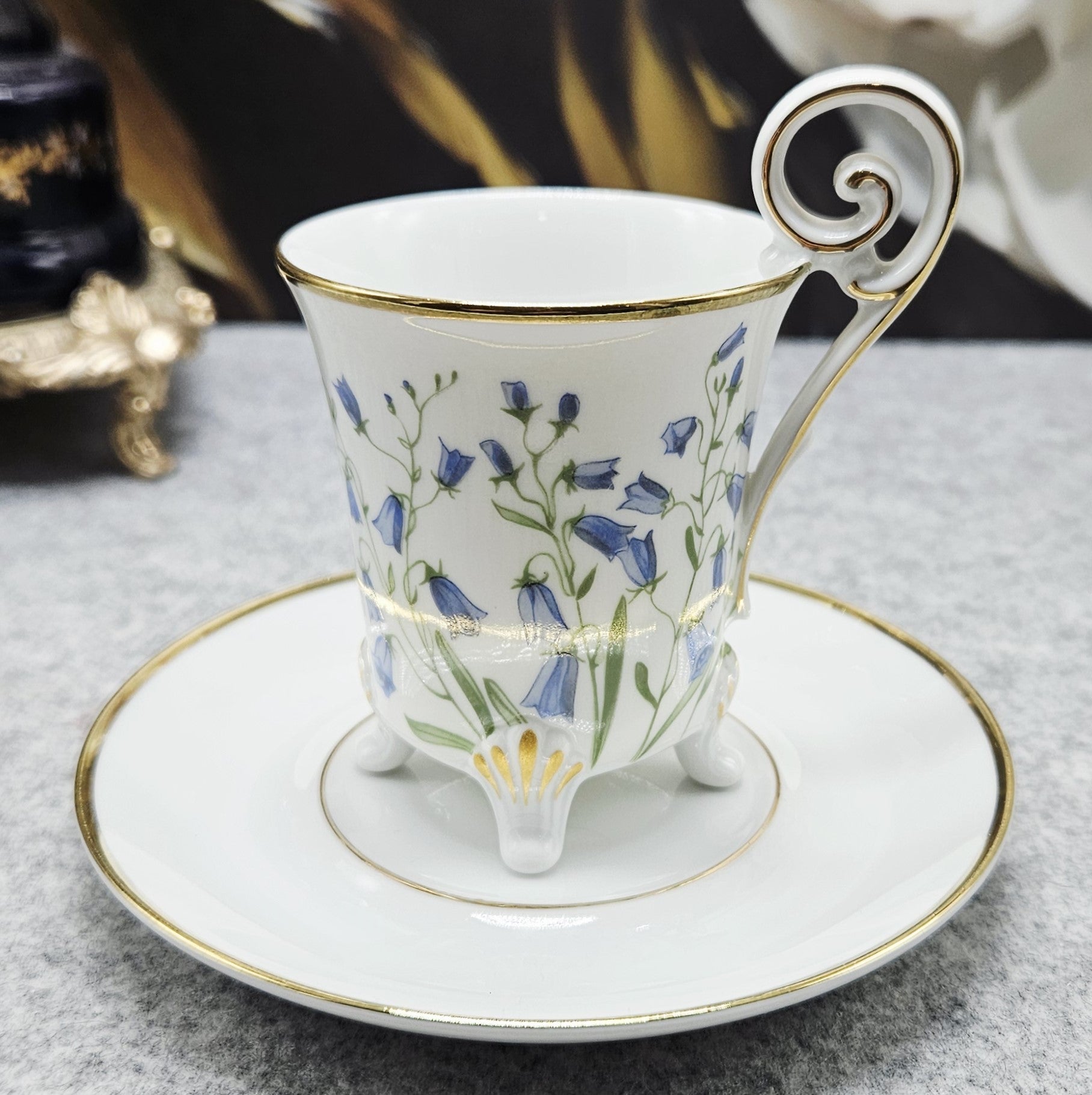 Šis „Tirschenreuth“ porceliano puodelis – tikras prabangos ir klasikinės estetikos pavyzdys. Puodelio kraštą įrėmina auksinė linija, o sienelę puošia melsvos gėlės – varpeliai. Lėkštutė puošta minimaliomis auksinėmis linijomis ir harmoningai papildo visą komplektą. Auksu dengta rankenėlė suteikia dar daugiau rafinuotumo ir išryškina meistrišką porceliano dirbinį, o komplekto akcentas – keturios kojelės, kurios suteikia grakštumo.