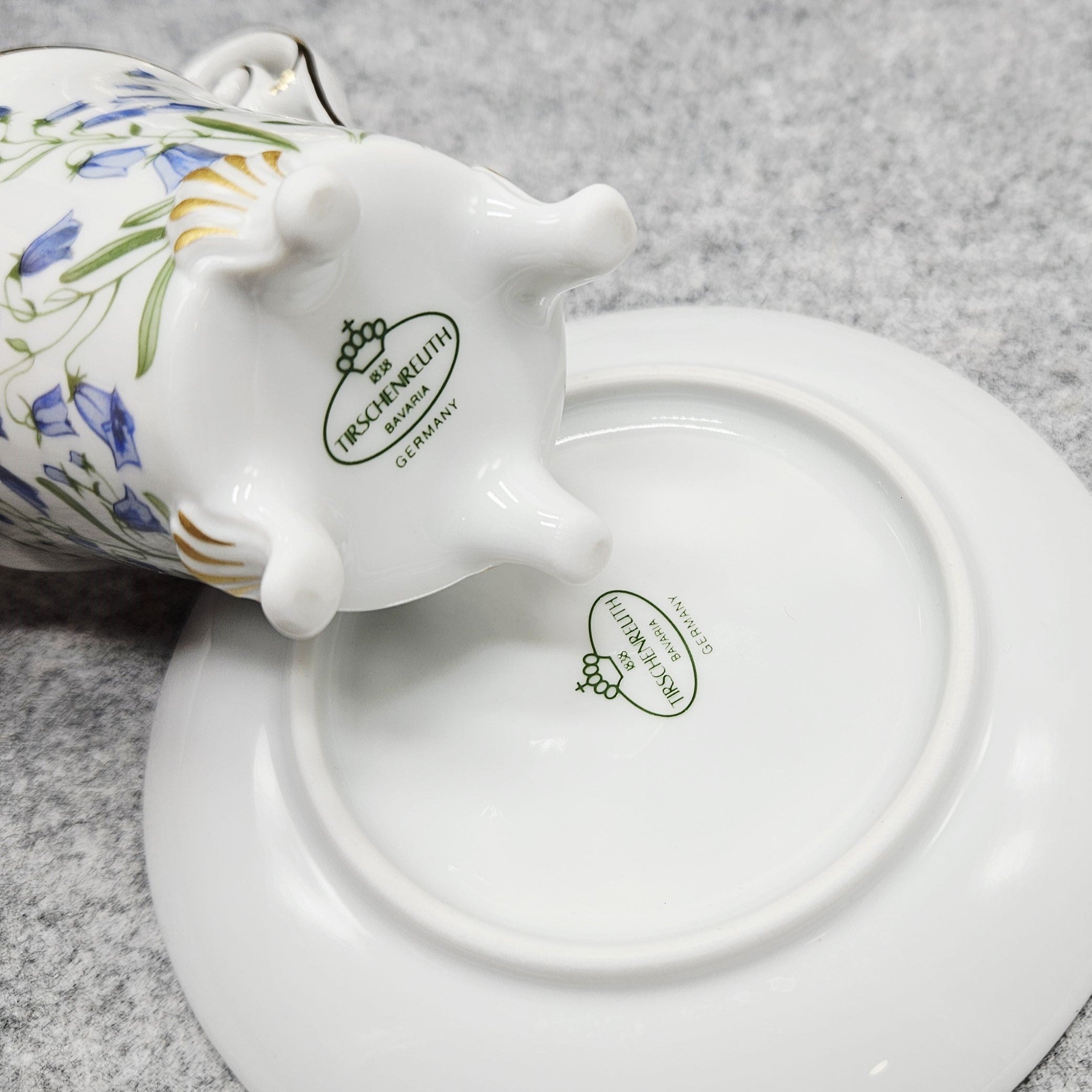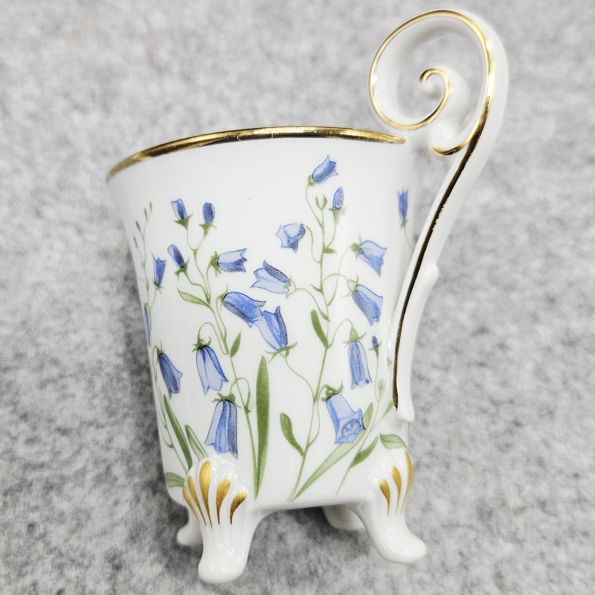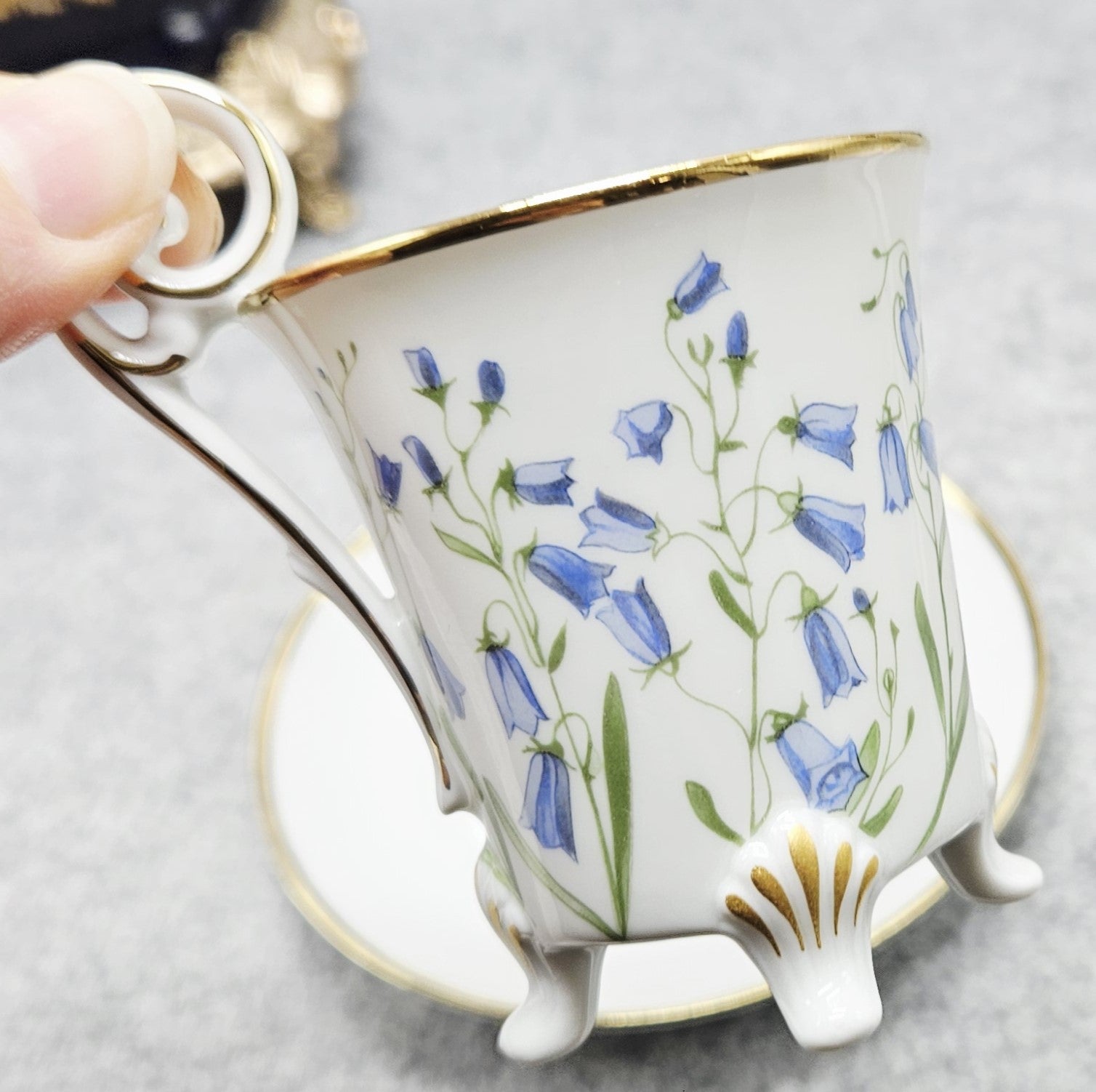 Šis „Tirschenreuth“ porceliano puodelis – tikras prabangos ir klasikinės estetikos pavyzdys. Puodelio kraštą įrėmina auksinė linija, o sienelę puošia melsvos gėlės – varpeliai. Lėkštutė puošta minimaliomis auksinėmis linijomis ir harmoningai papildo visą komplektą. Auksu dengta rankenėlė suteikia dar daugiau rafinuotumo ir išryškina meistrišką porceliano dirbinį, o komplekto akcentas – keturios kojelės, kurios suteikia grakštumo.