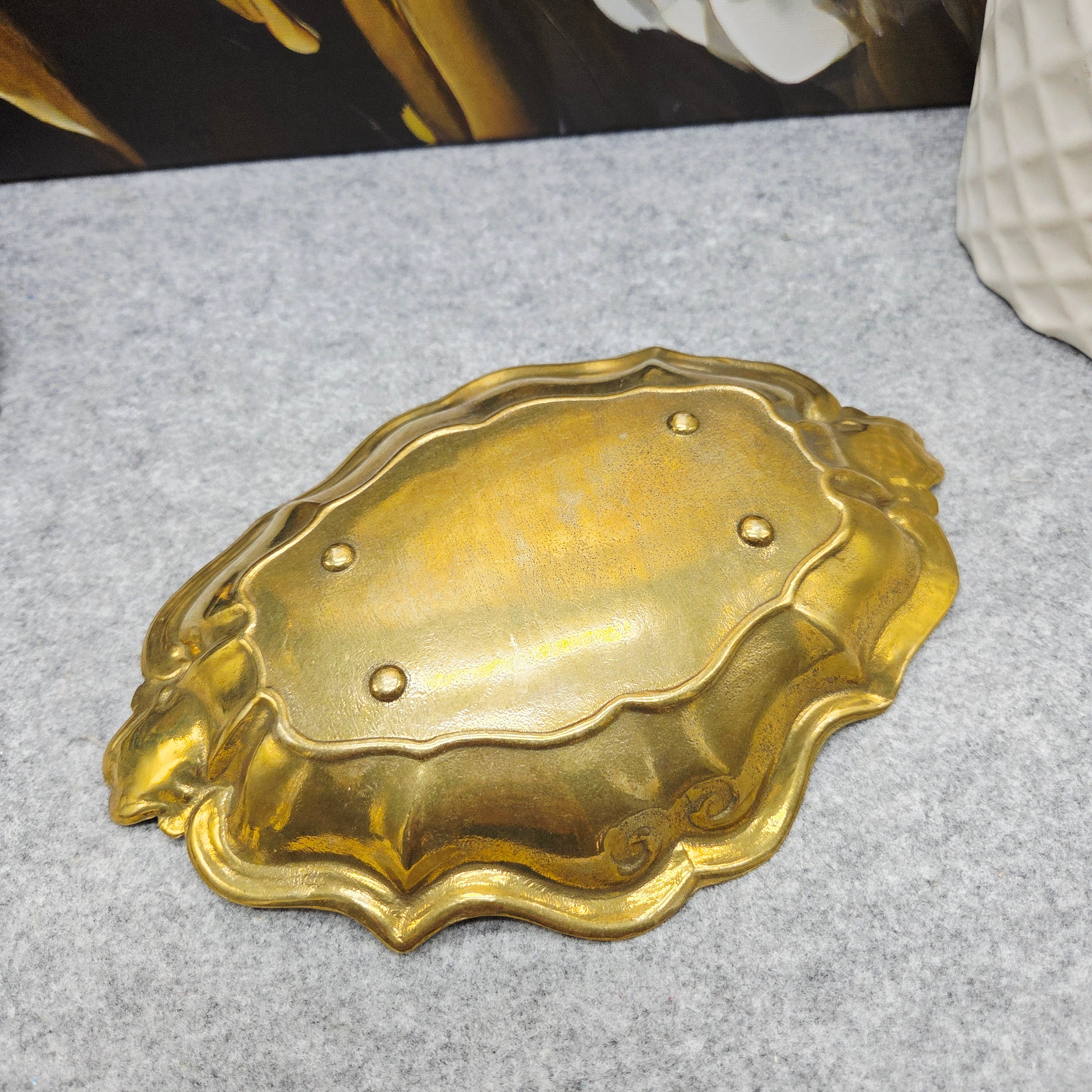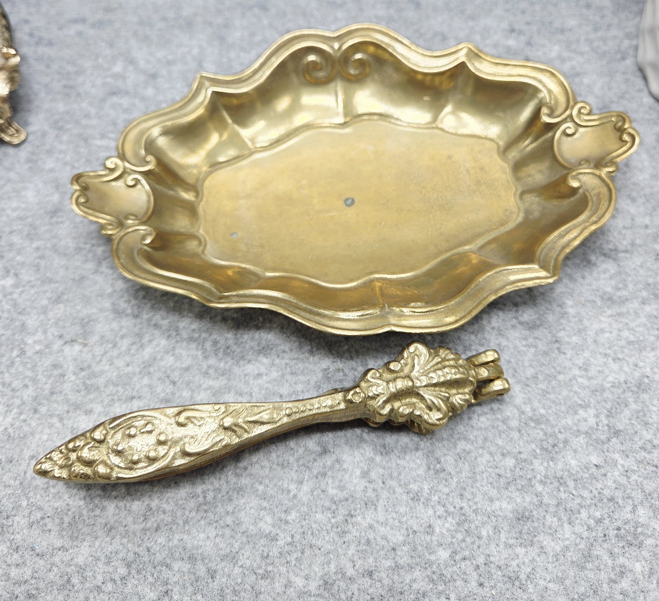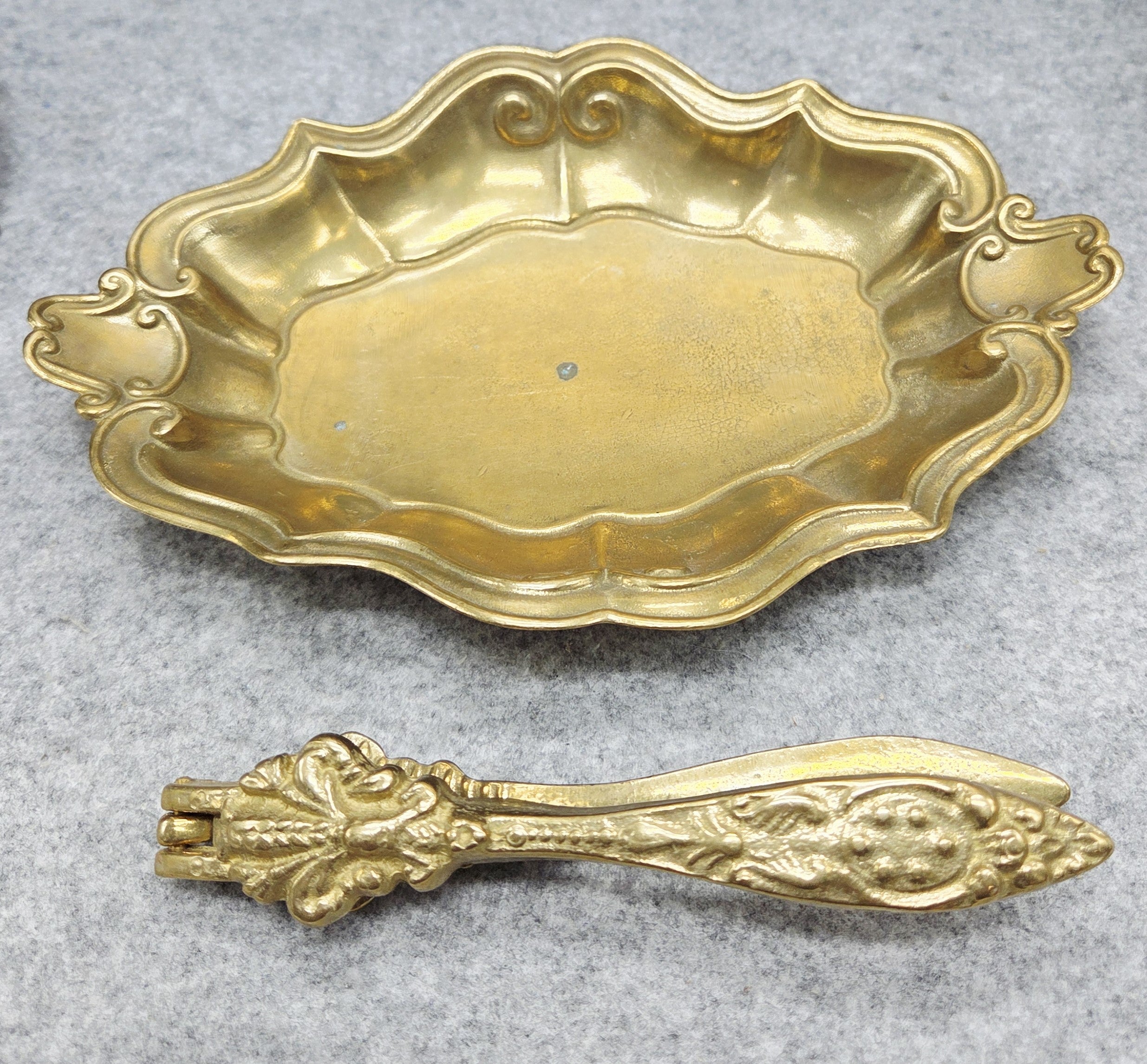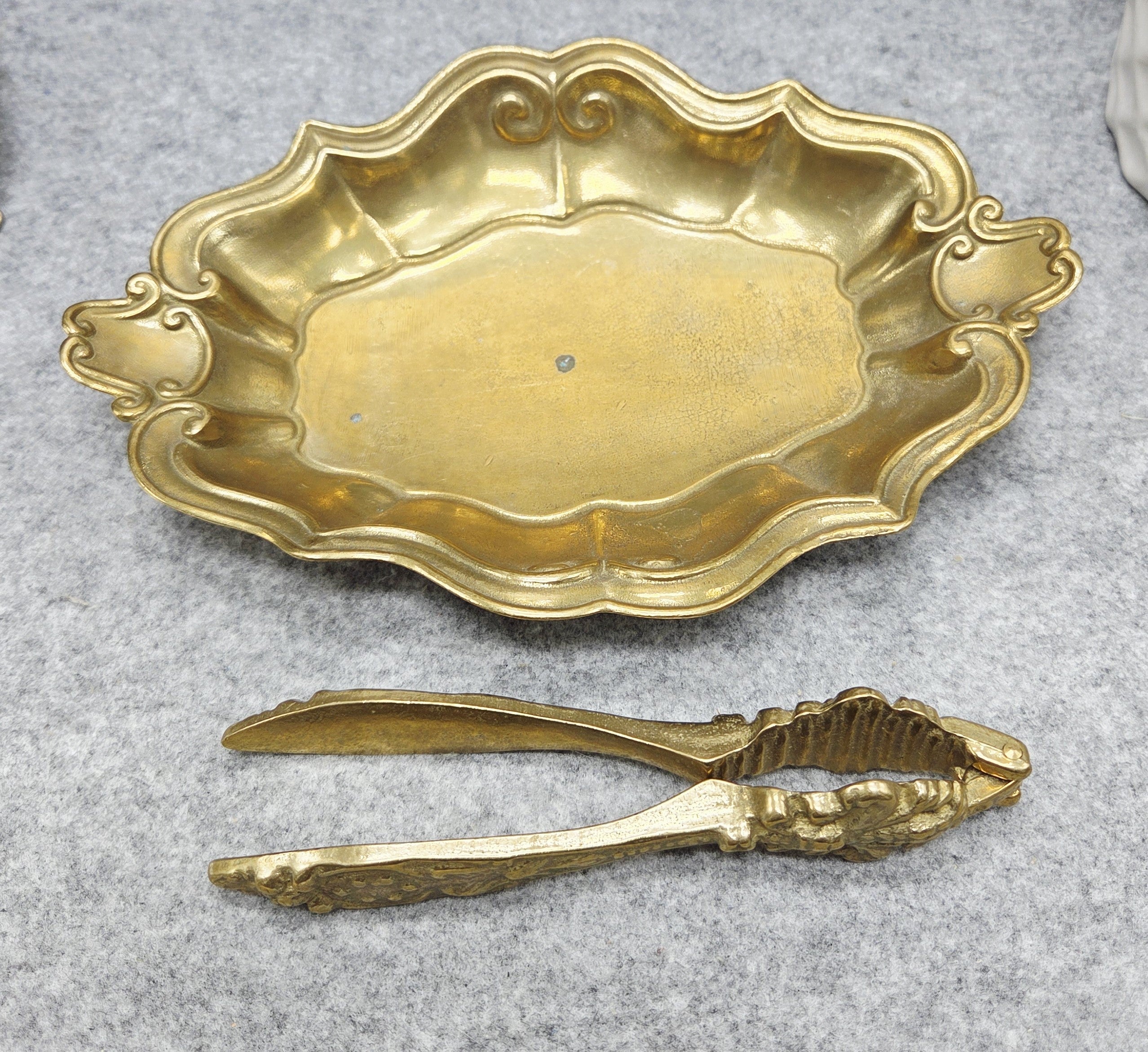 Elegantiškas vintažinis riešutų rinkinys, pagamintas iš žalvario, kurį sudaro dekoratyvus dubenėlis ir rankinis riešutų spaustukas. Dubenėlis išsiskiria banguotu, ornamentuotu kraštu ir subtiliais dekoratyviniais elementais, suteikiančiais jam klasikinio, šiek tiek rokoko įkvėpto žavesio.