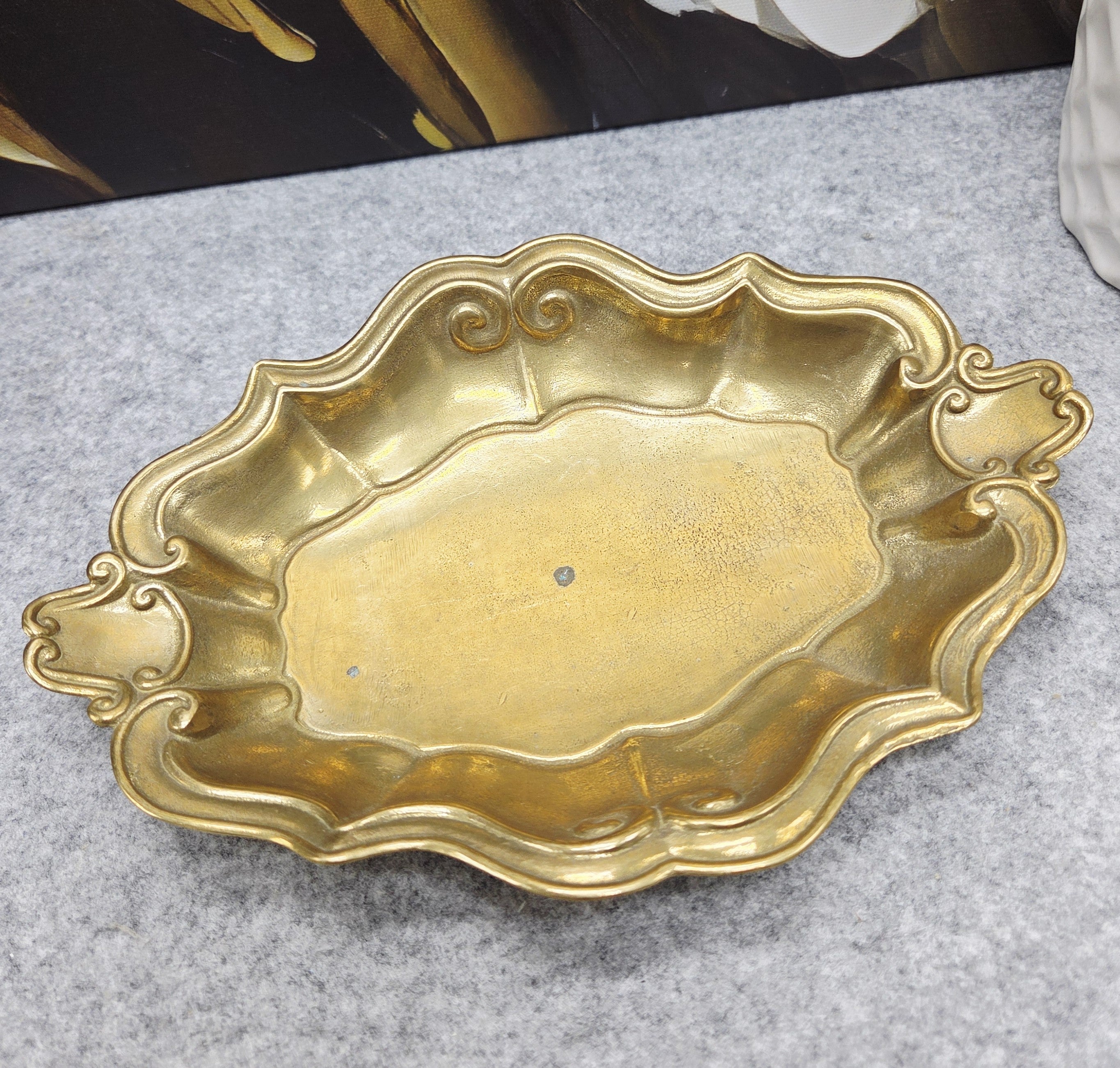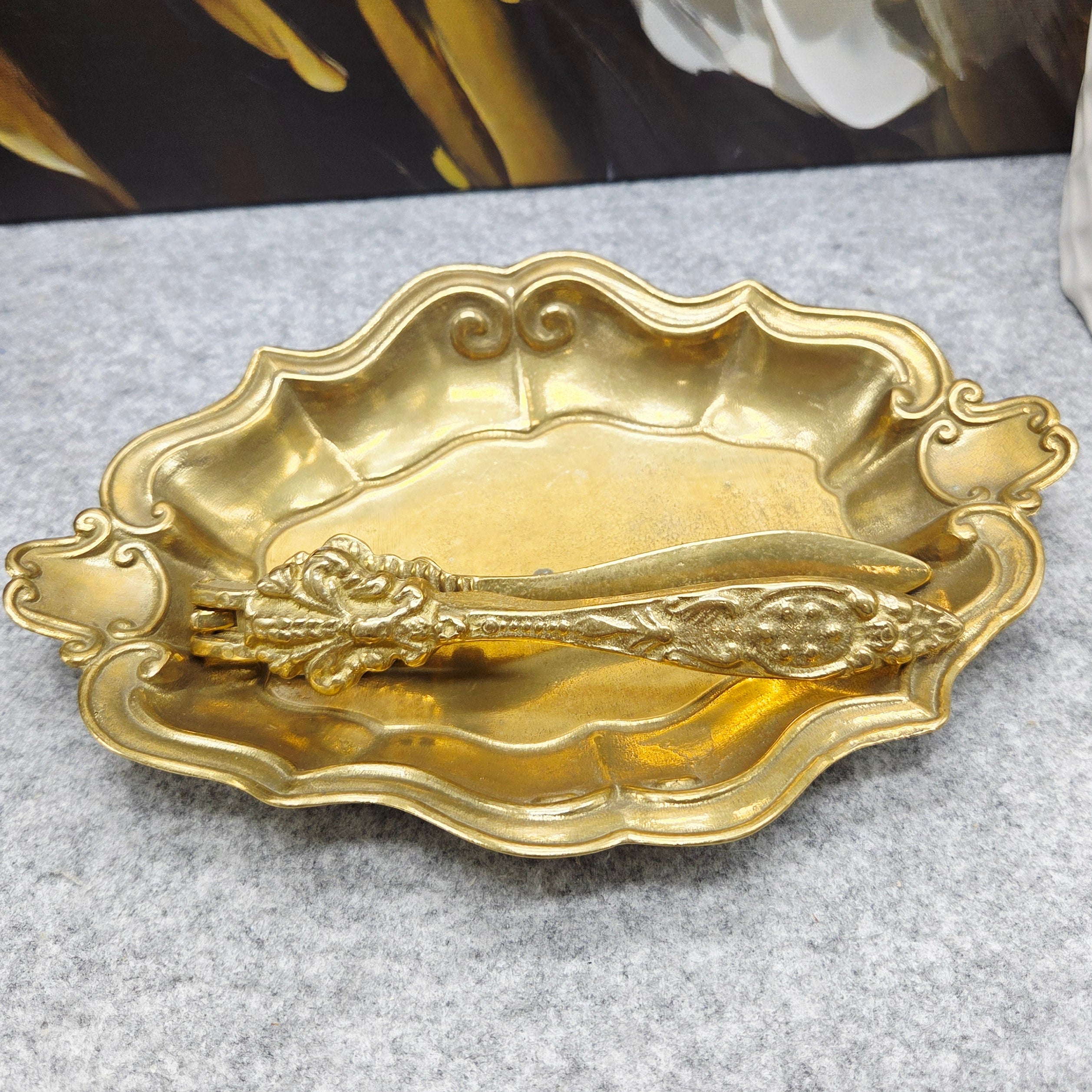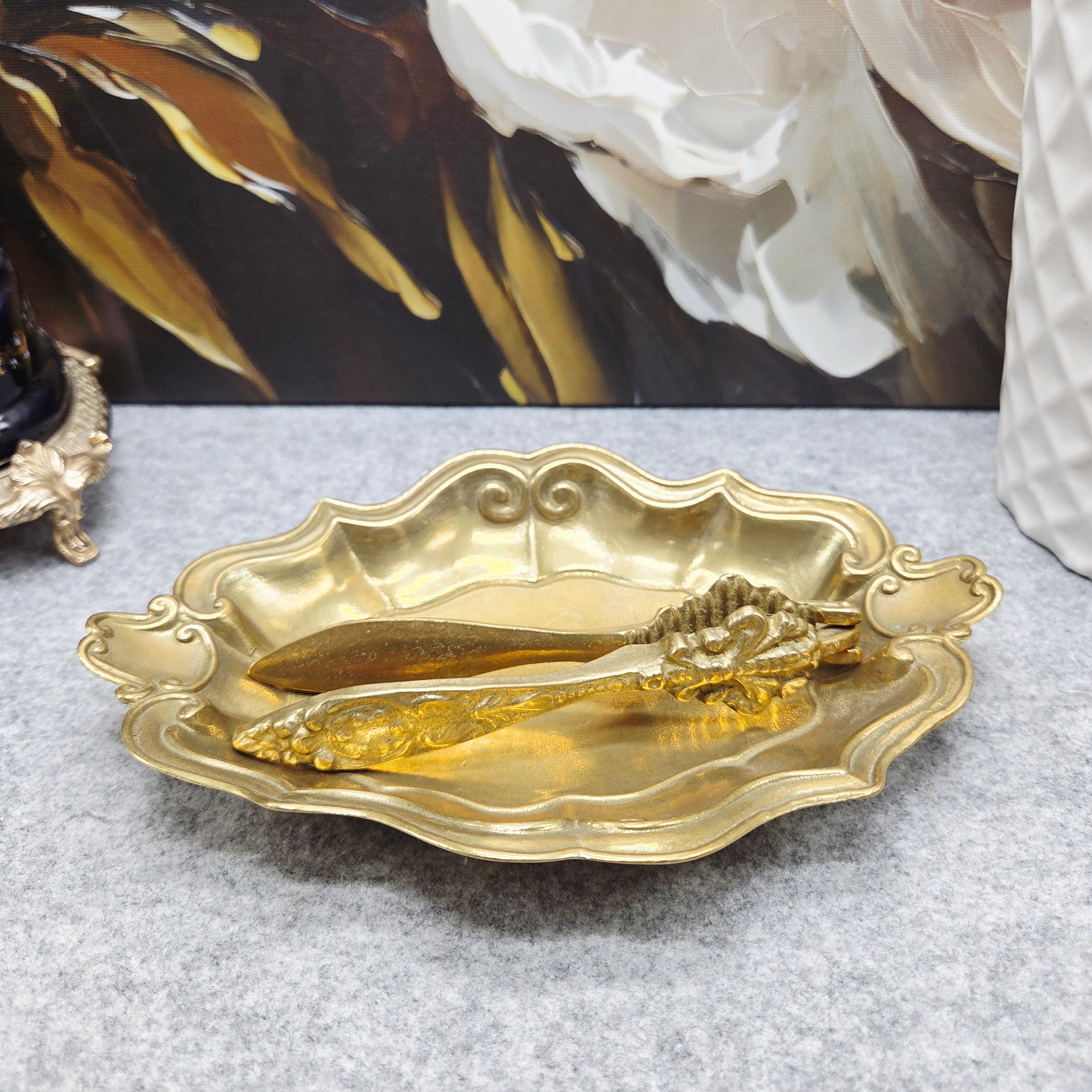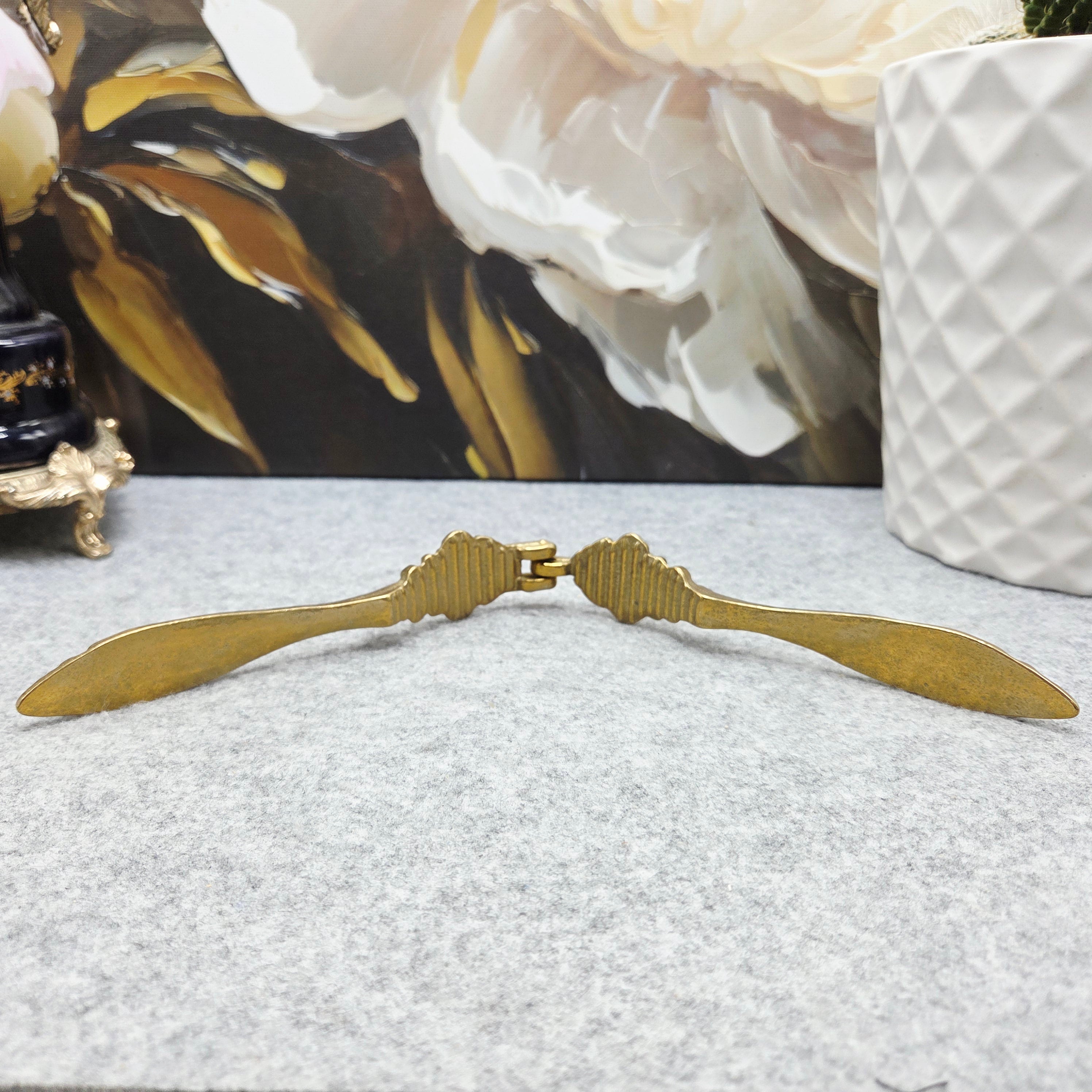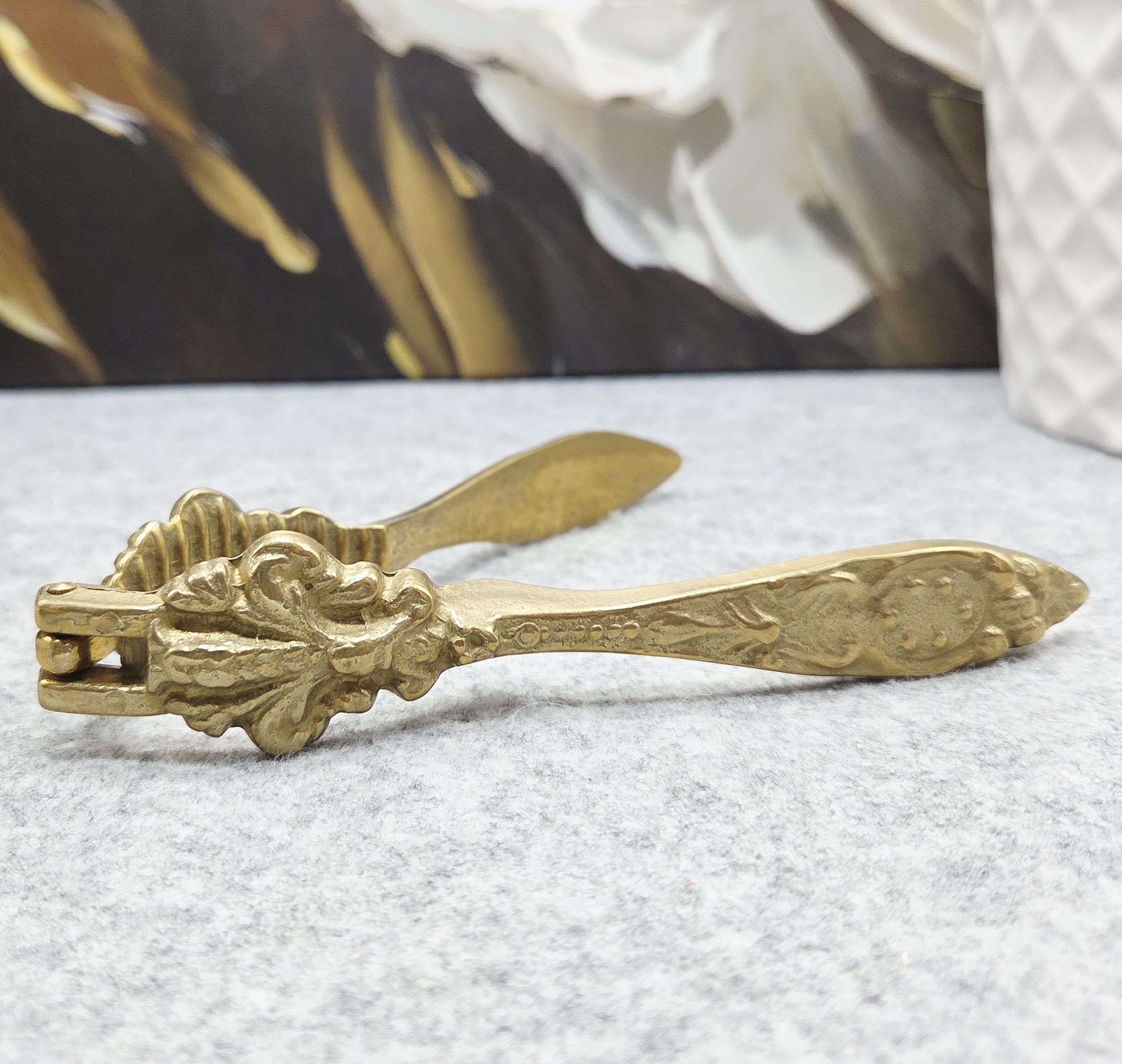 Elegantiškas vintažinis riešutų rinkinys, pagamintas iš žalvario, kurį sudaro dekoratyvus dubenėlis ir rankinis riešutų spaustukas. Dubenėlis išsiskiria banguotu, ornamentuotu kraštu ir subtiliais dekoratyviniais elementais, suteikiančiais jam klasikinio, šiek tiek rokoko įkvėpto žavesio.