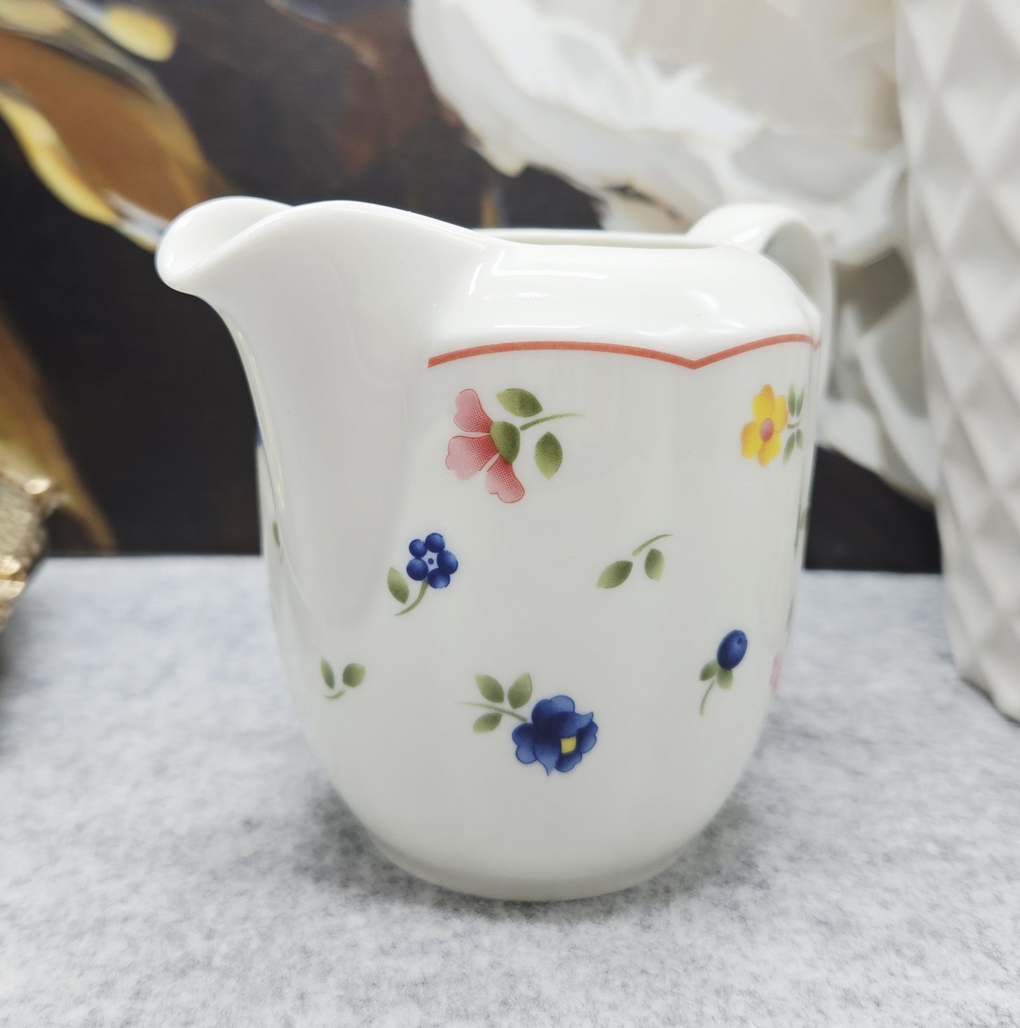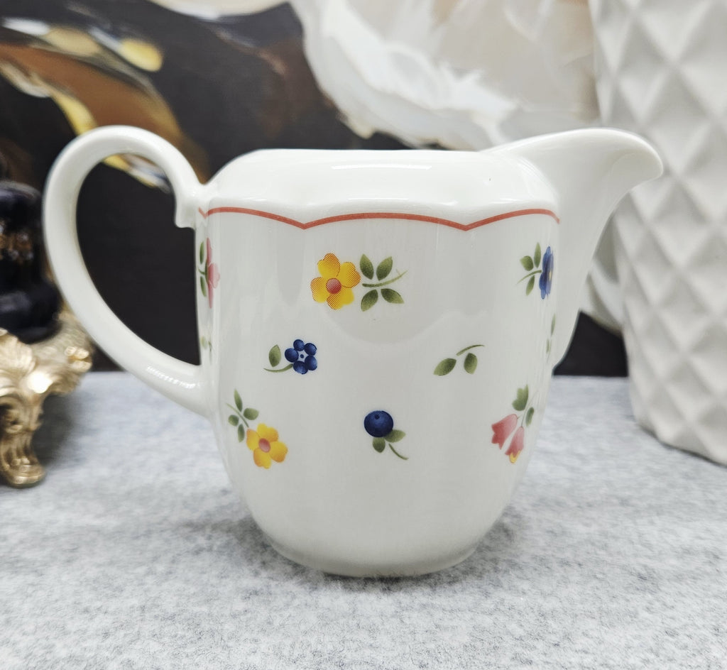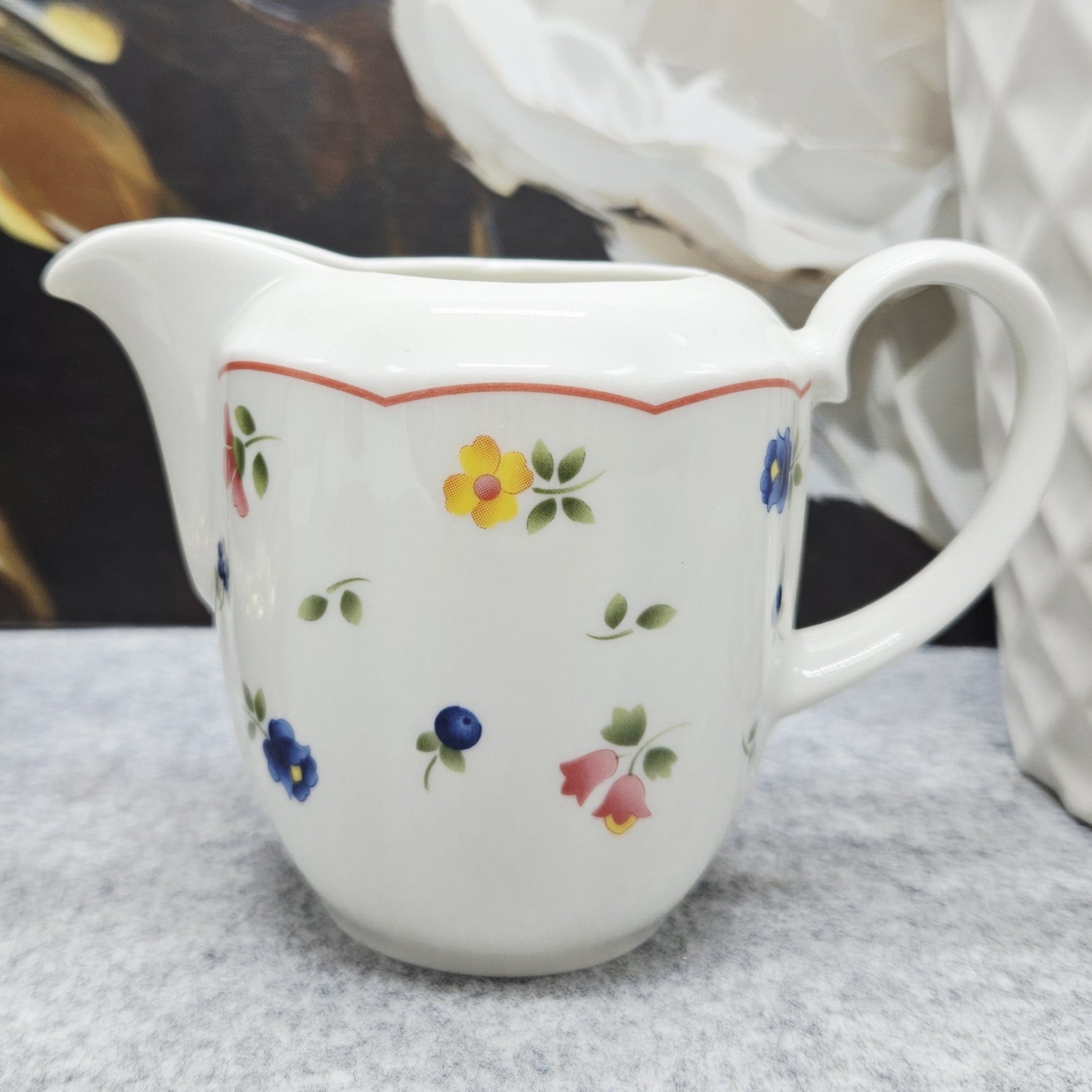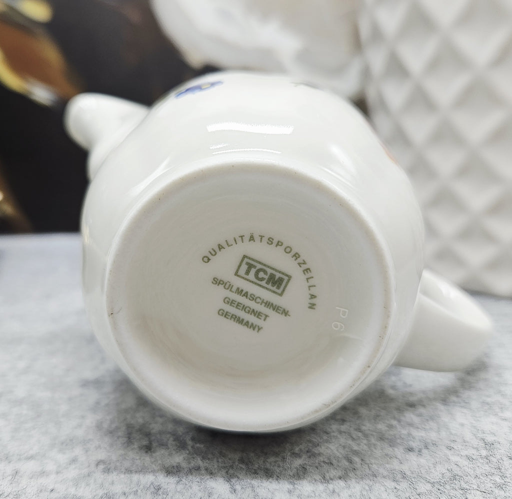 Vokiško porceliano „TCM Qualitätsporzellan Germany“ ąsotėlis. Ąsotėlis dekoruotas spalvotais gėlių motyvais ir subtiliu rausvu krašteliu.