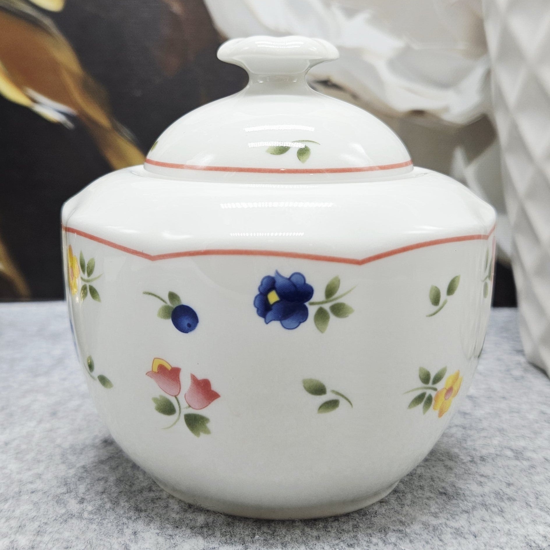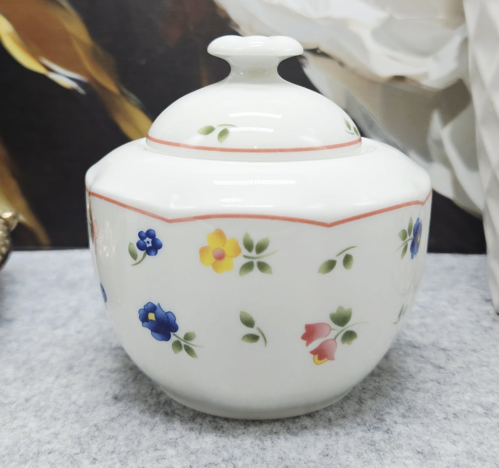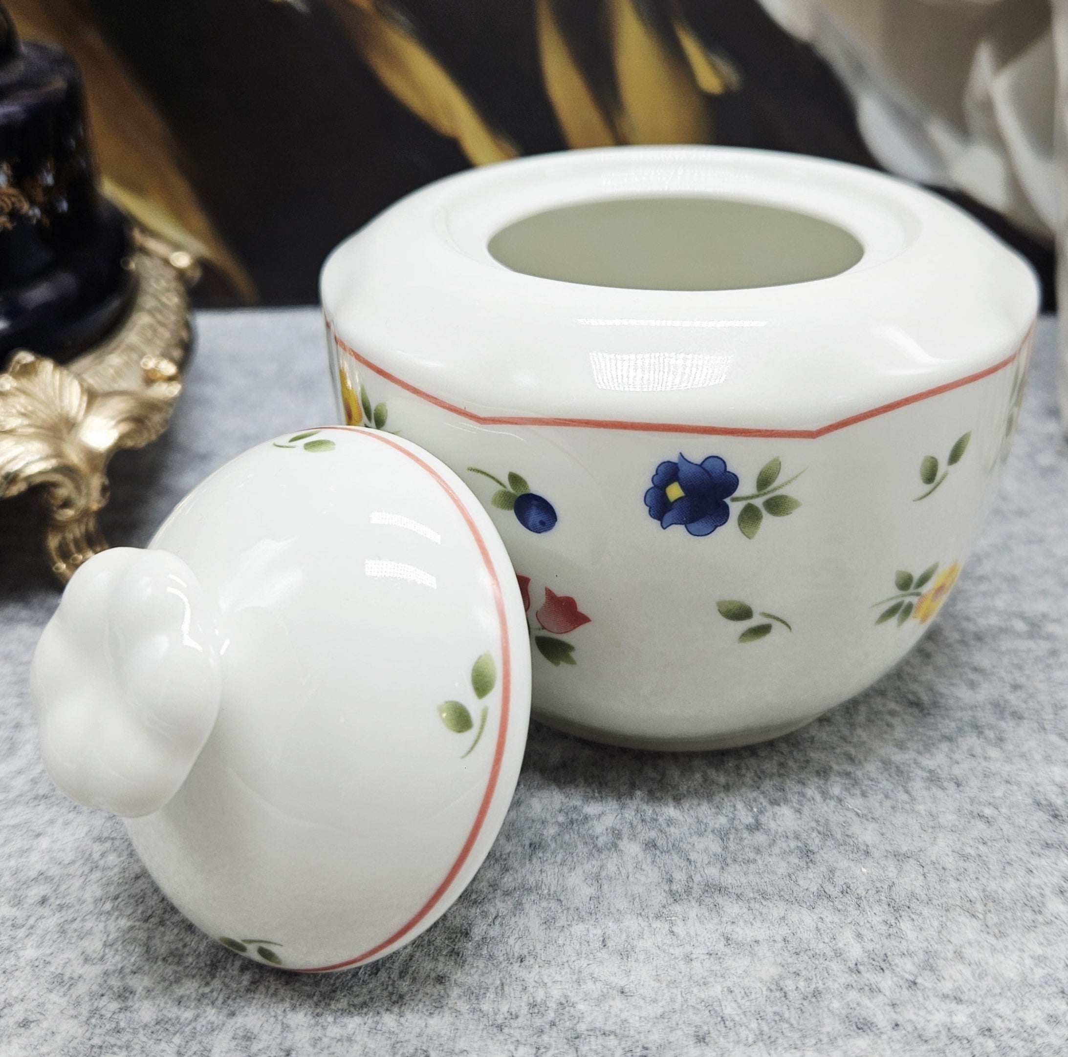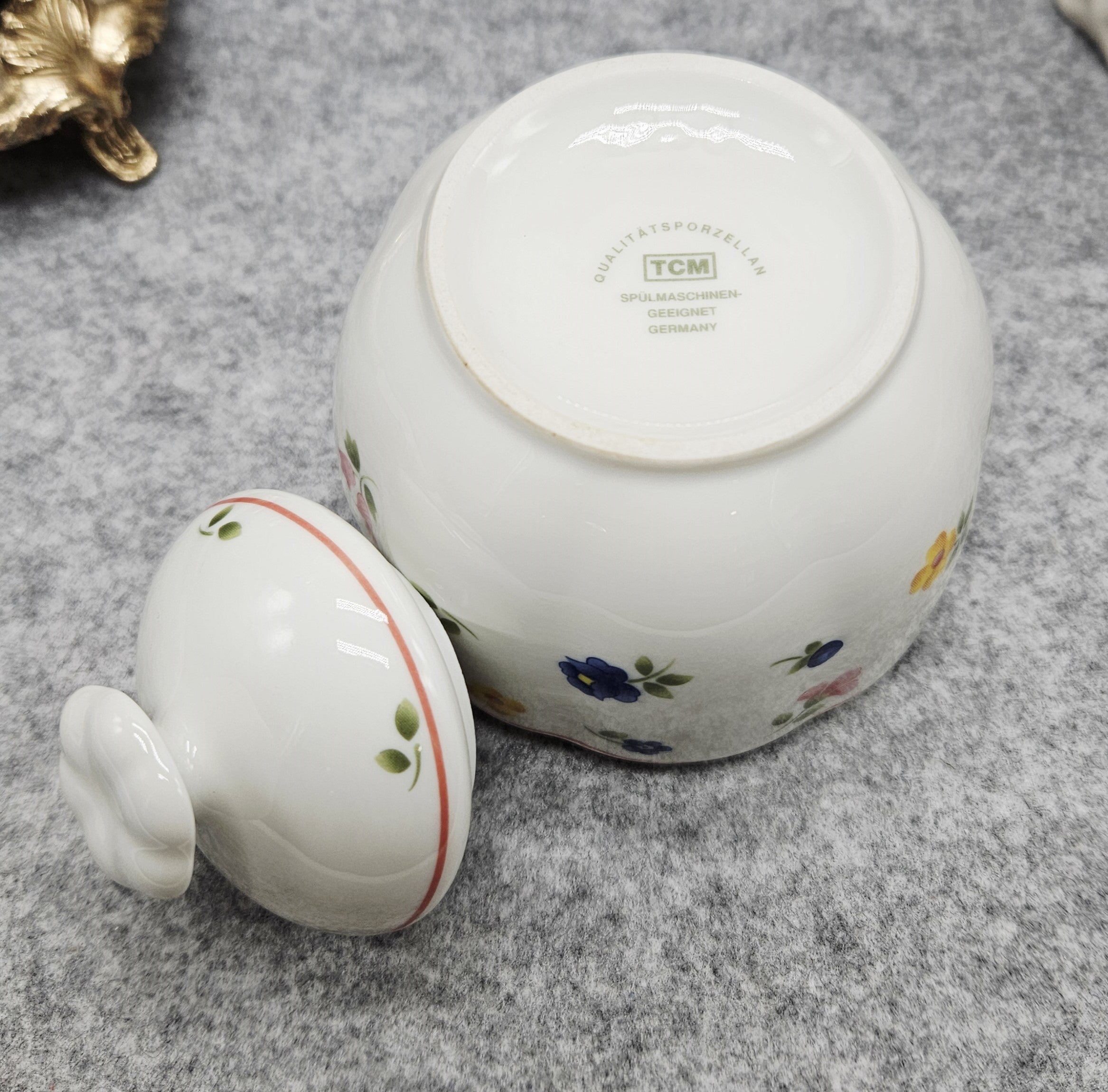 Vokiško porceliano „TCM Qualitätsporzellan Germany“ cukrinė. Cukrinė dekoruota spalvotais gėlių motyvais ir subtiliu rausvu krašteliu.