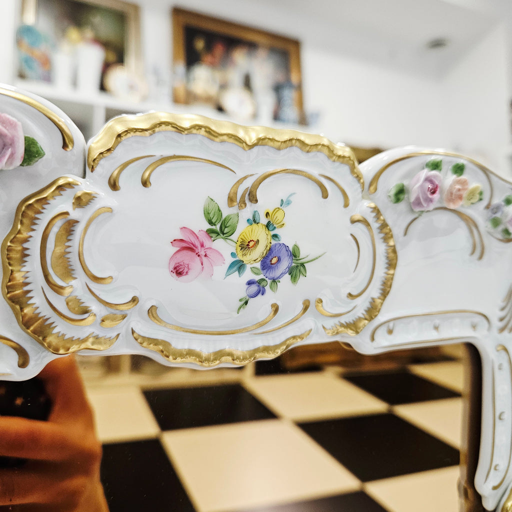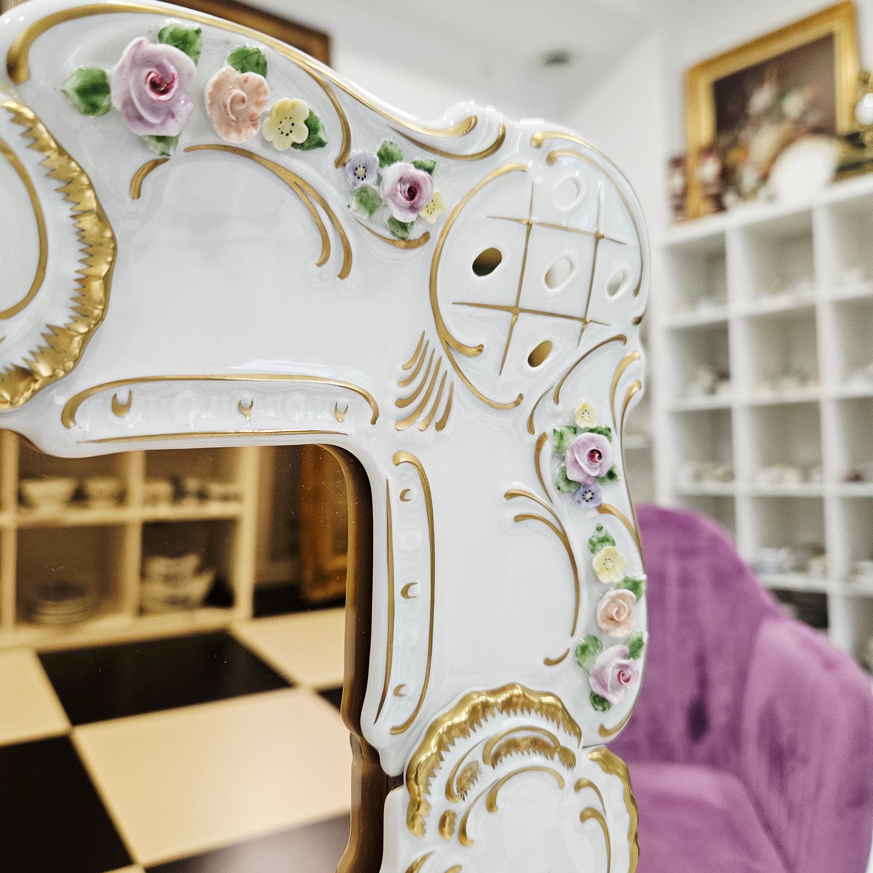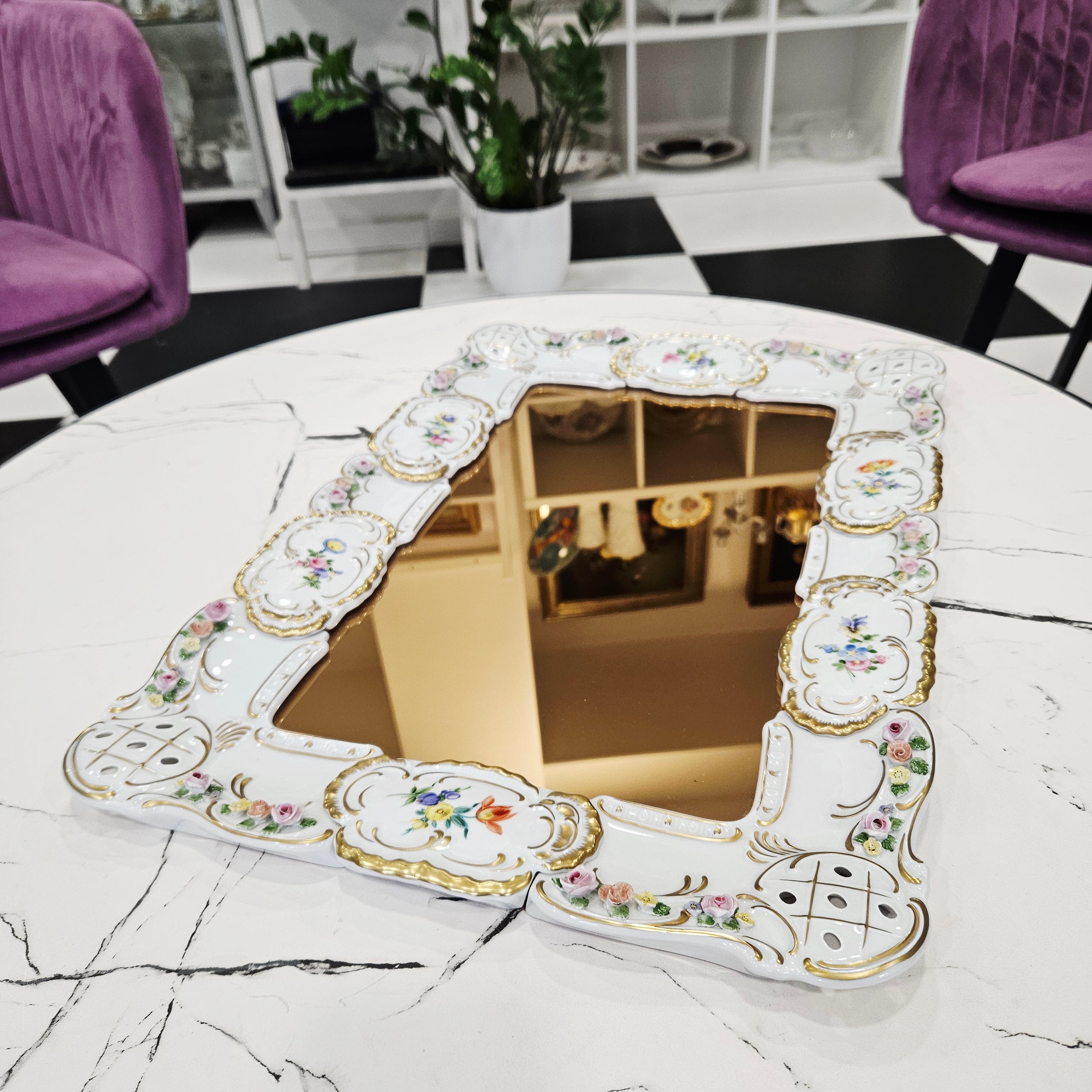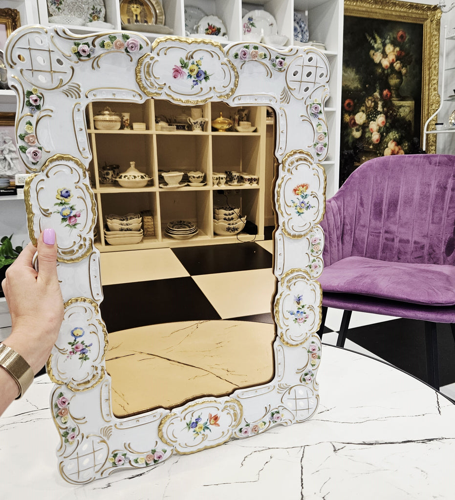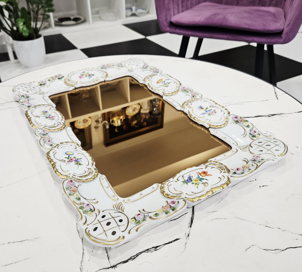 Išskirtinio grožio porcelianinis sieninis veidrodis, sukurtas garsiosios Lindner porceliano manufaktūros Bavarijoje, garsėjančios savo precizišku meistriškumu ir aukščiausios kokybės dekoru.