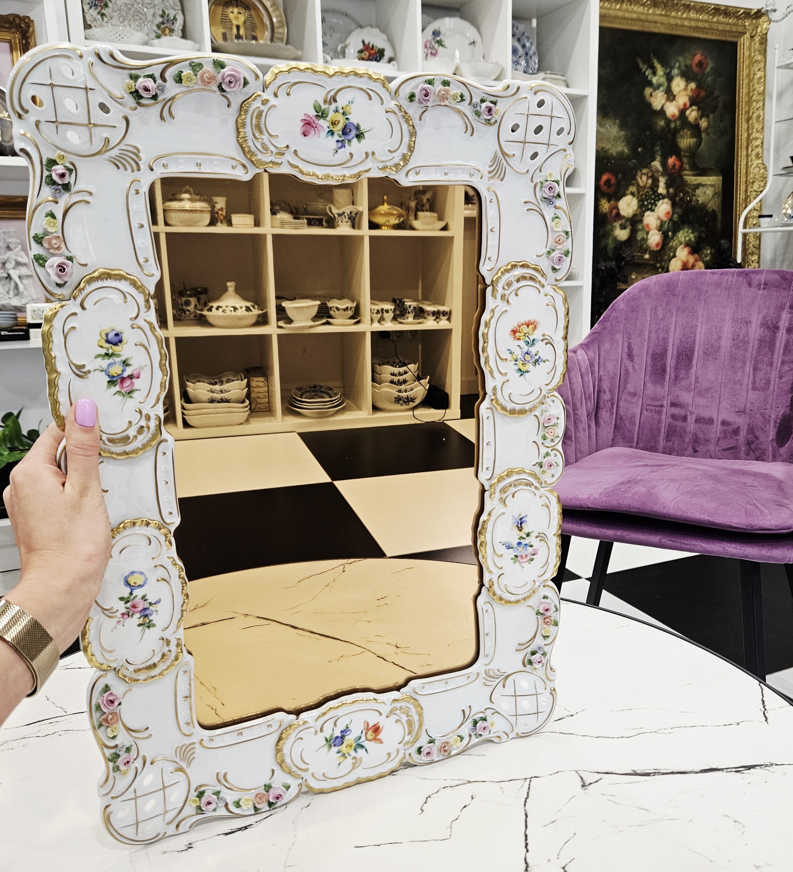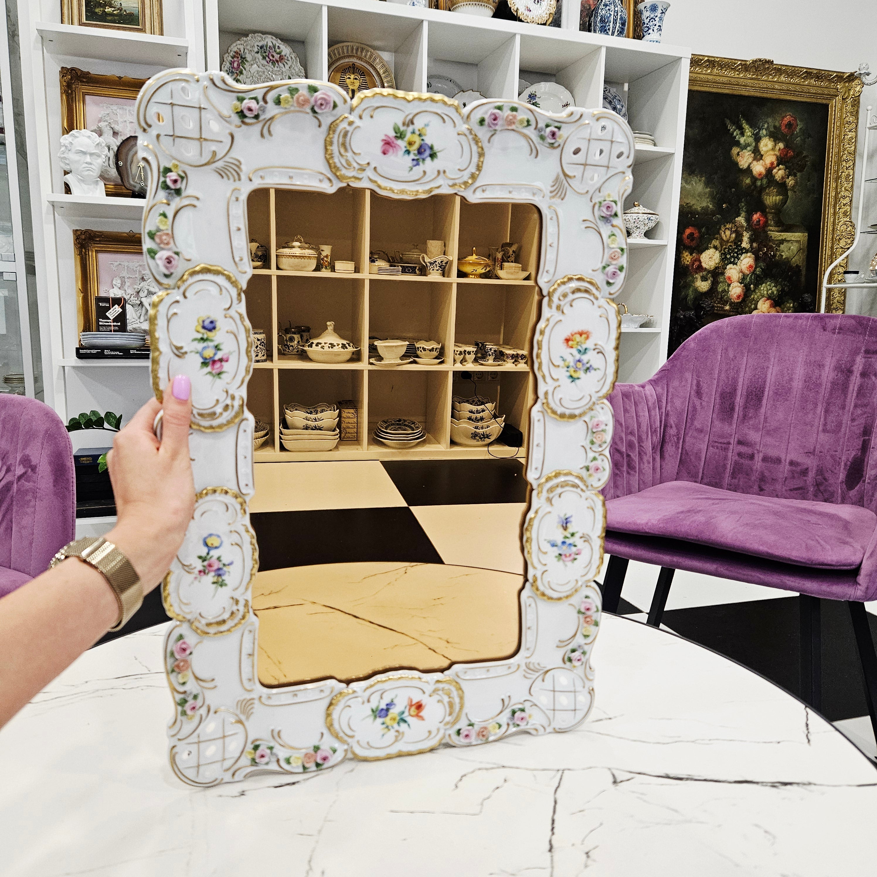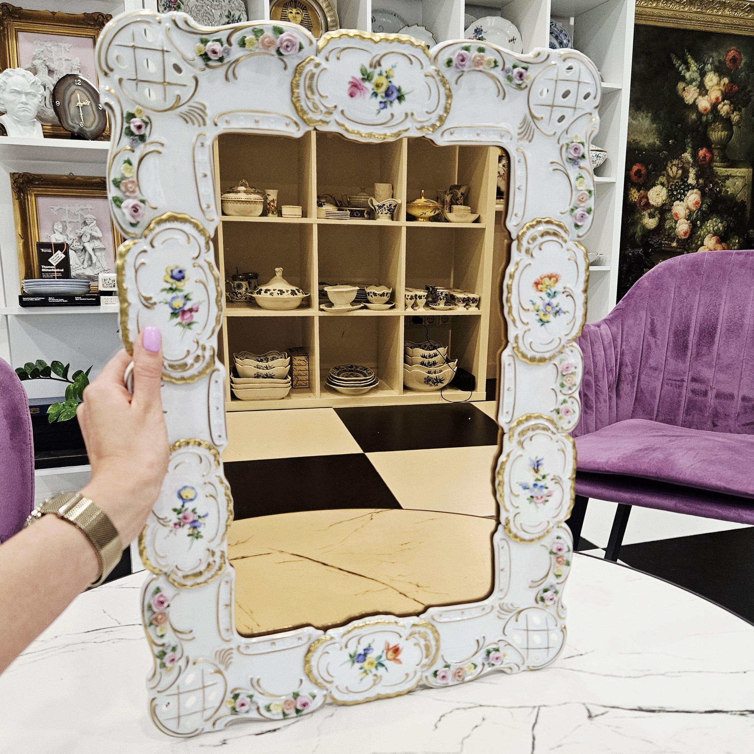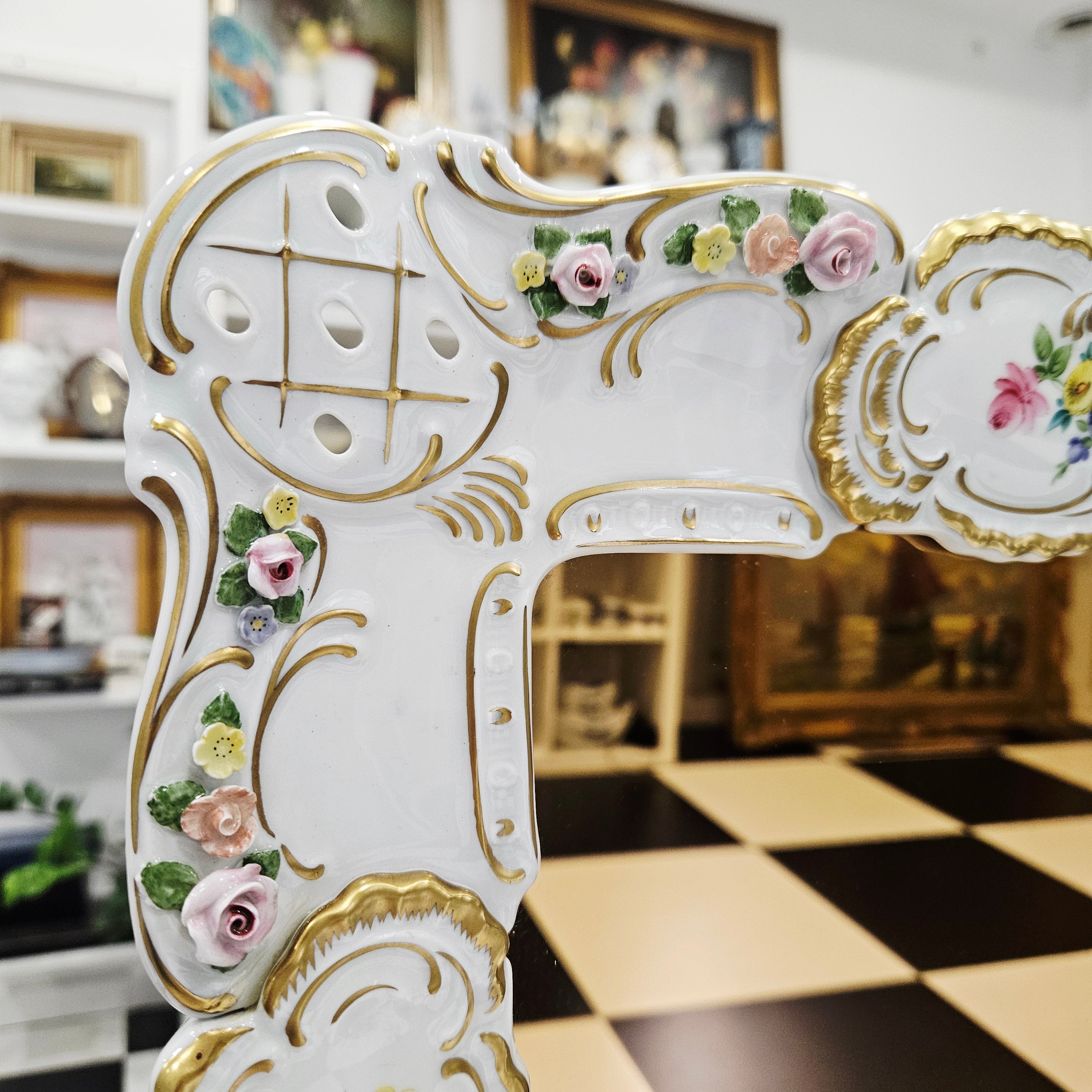 Išskirtinio grožio porcelianinis sieninis veidrodis, sukurtas garsiosios Lindner porceliano manufaktūros Bavarijoje, garsėjančios savo precizišku meistriškumu ir aukščiausios kokybės dekoru.