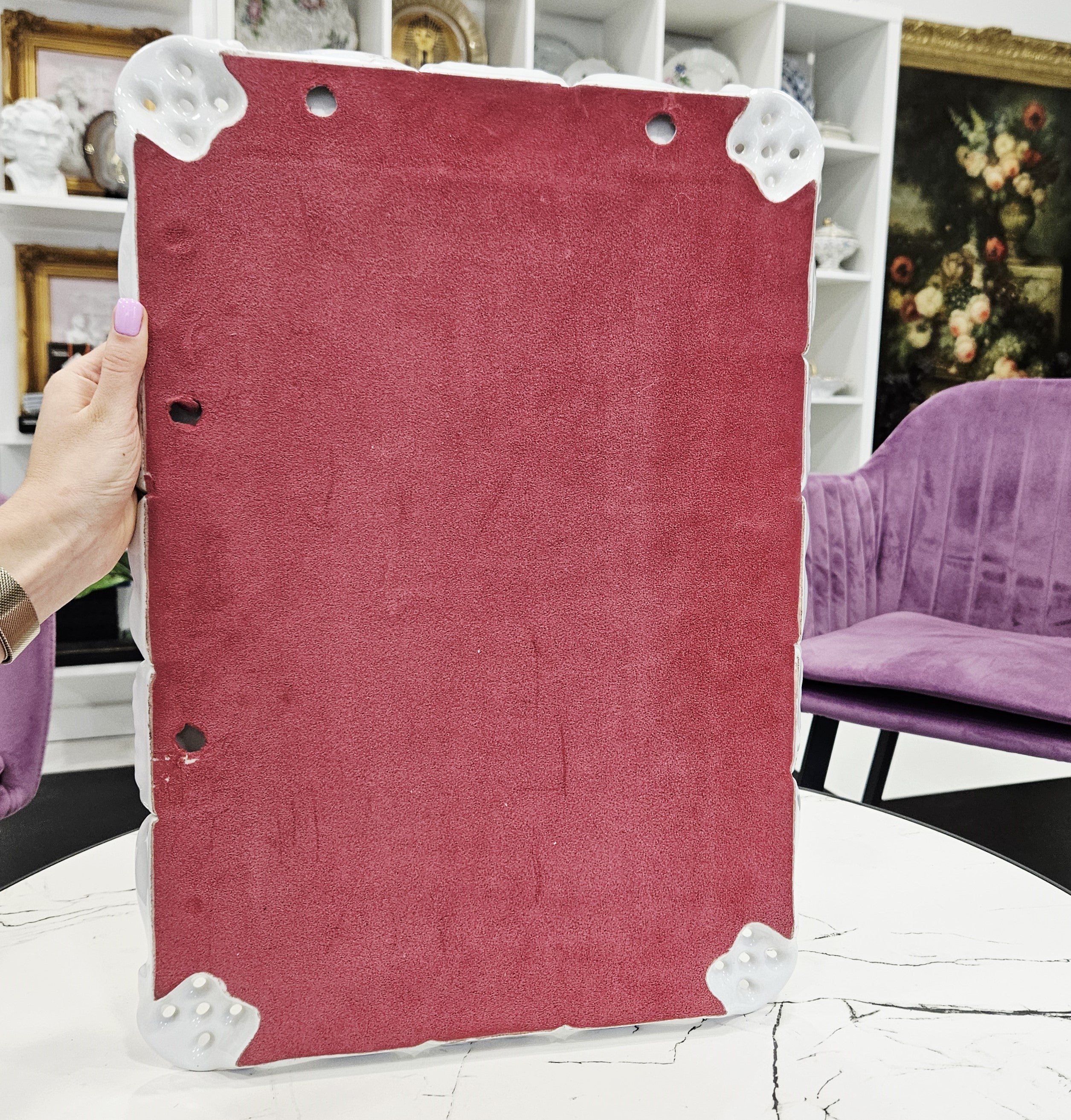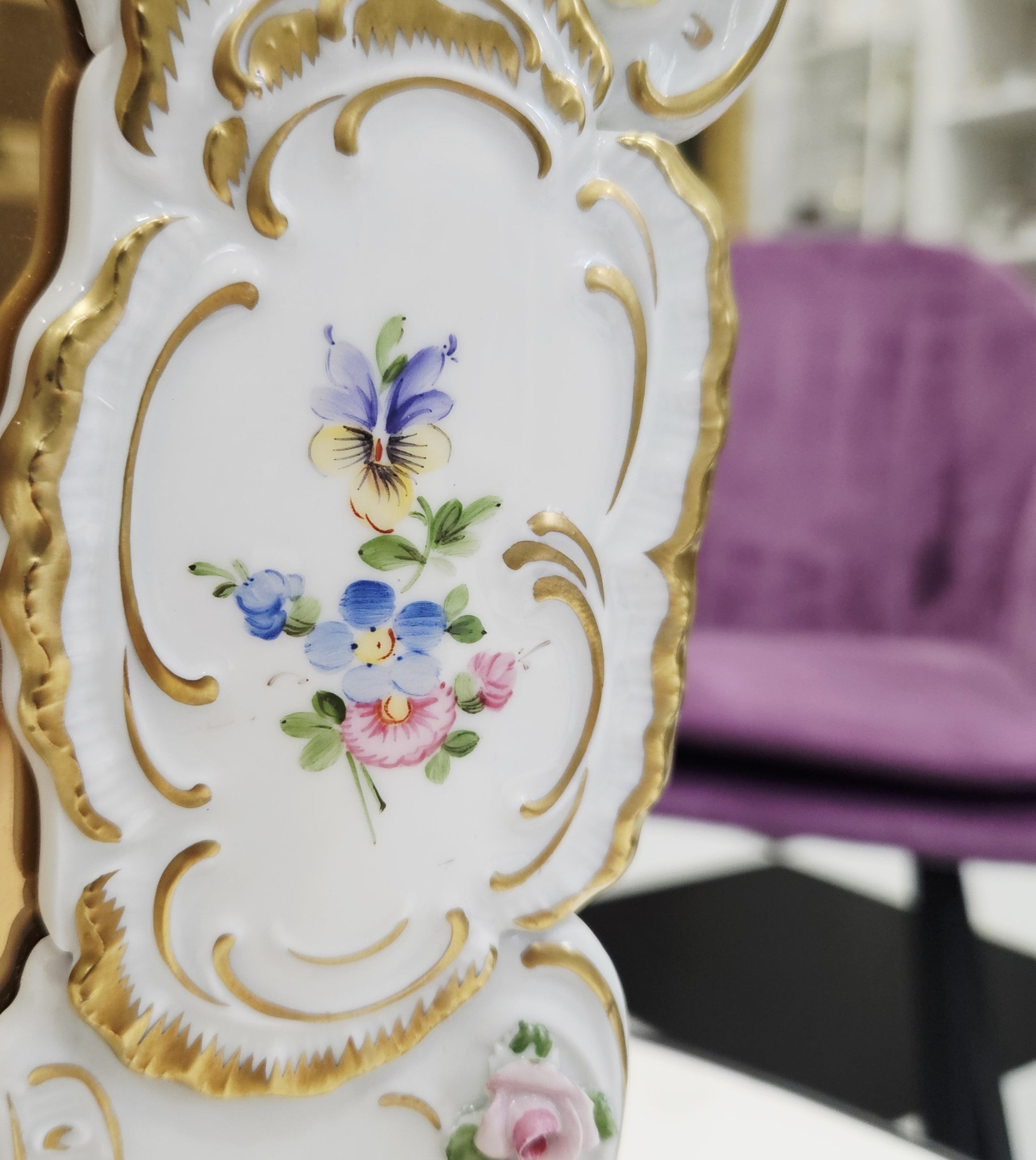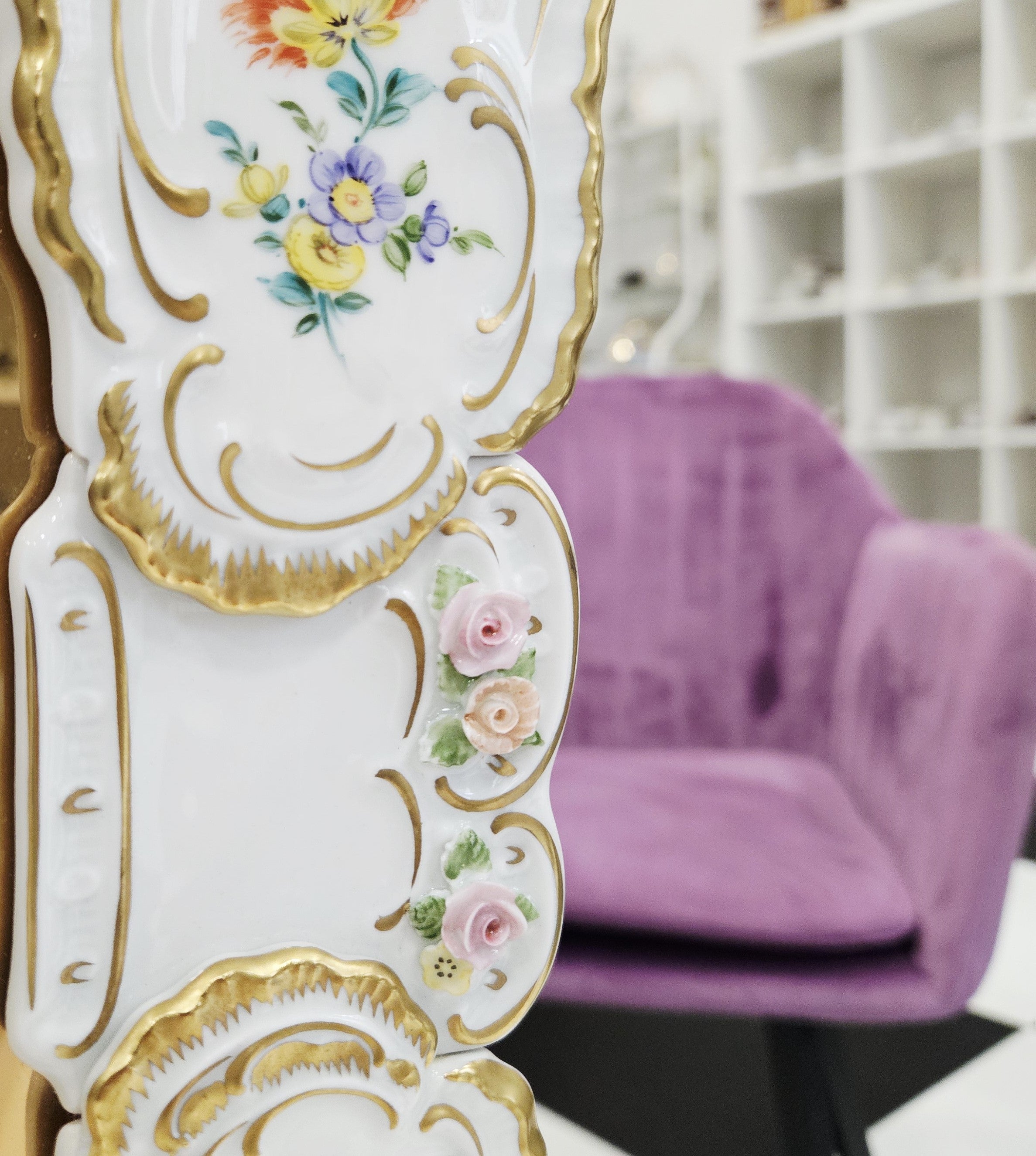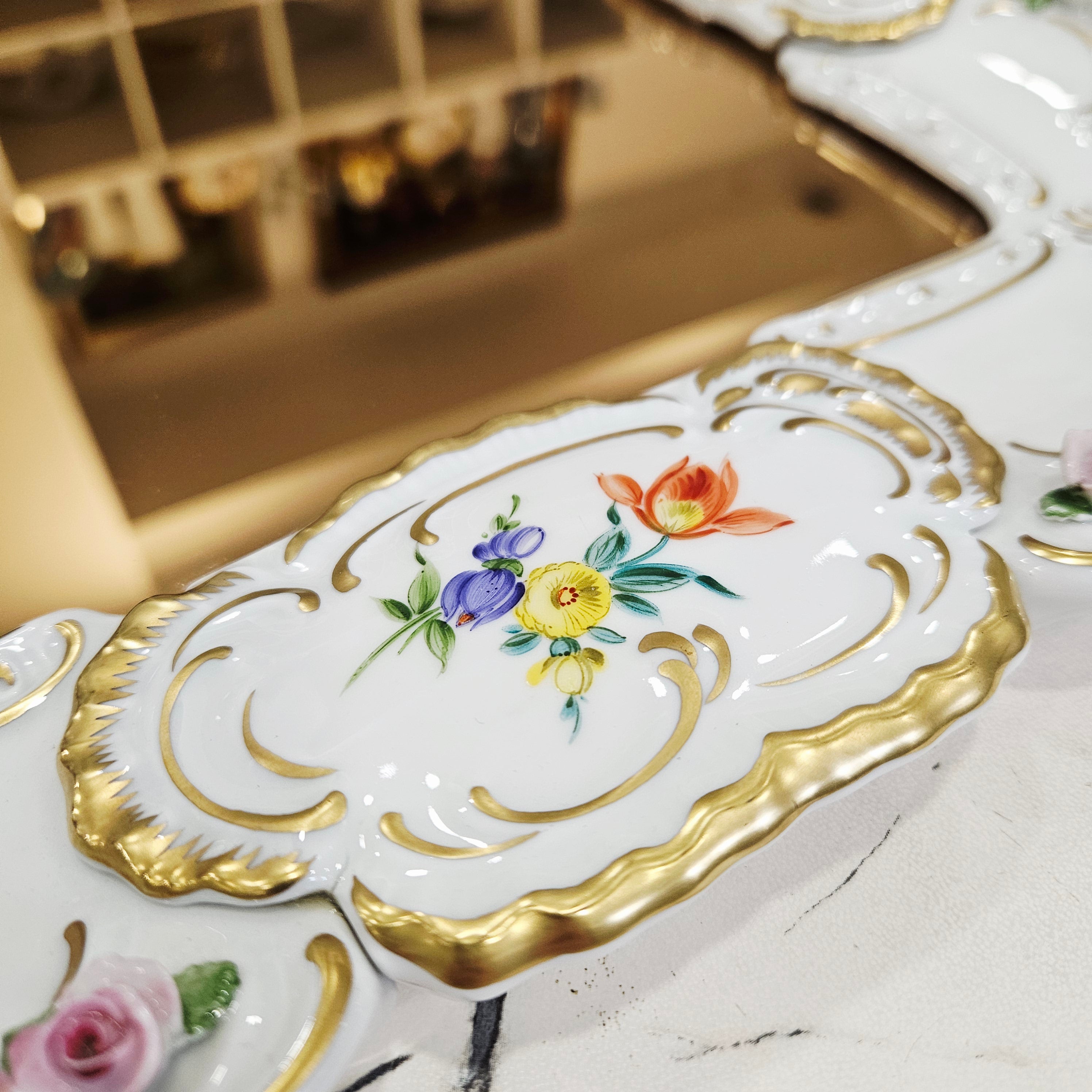 Išskirtinio grožio porcelianinis sieninis veidrodis, sukurtas garsiosios Lindner porceliano manufaktūros Bavarijoje, garsėjančios savo precizišku meistriškumu ir aukščiausios kokybės dekoru.