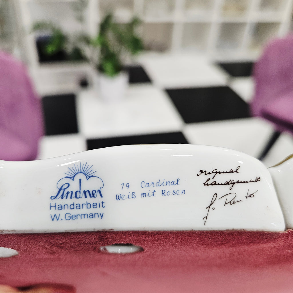 Su autoriaus parašu „Lindner Handarbeit W. Germany – 79 Cardinal Weiß mit Rosen – Original Handmade“.