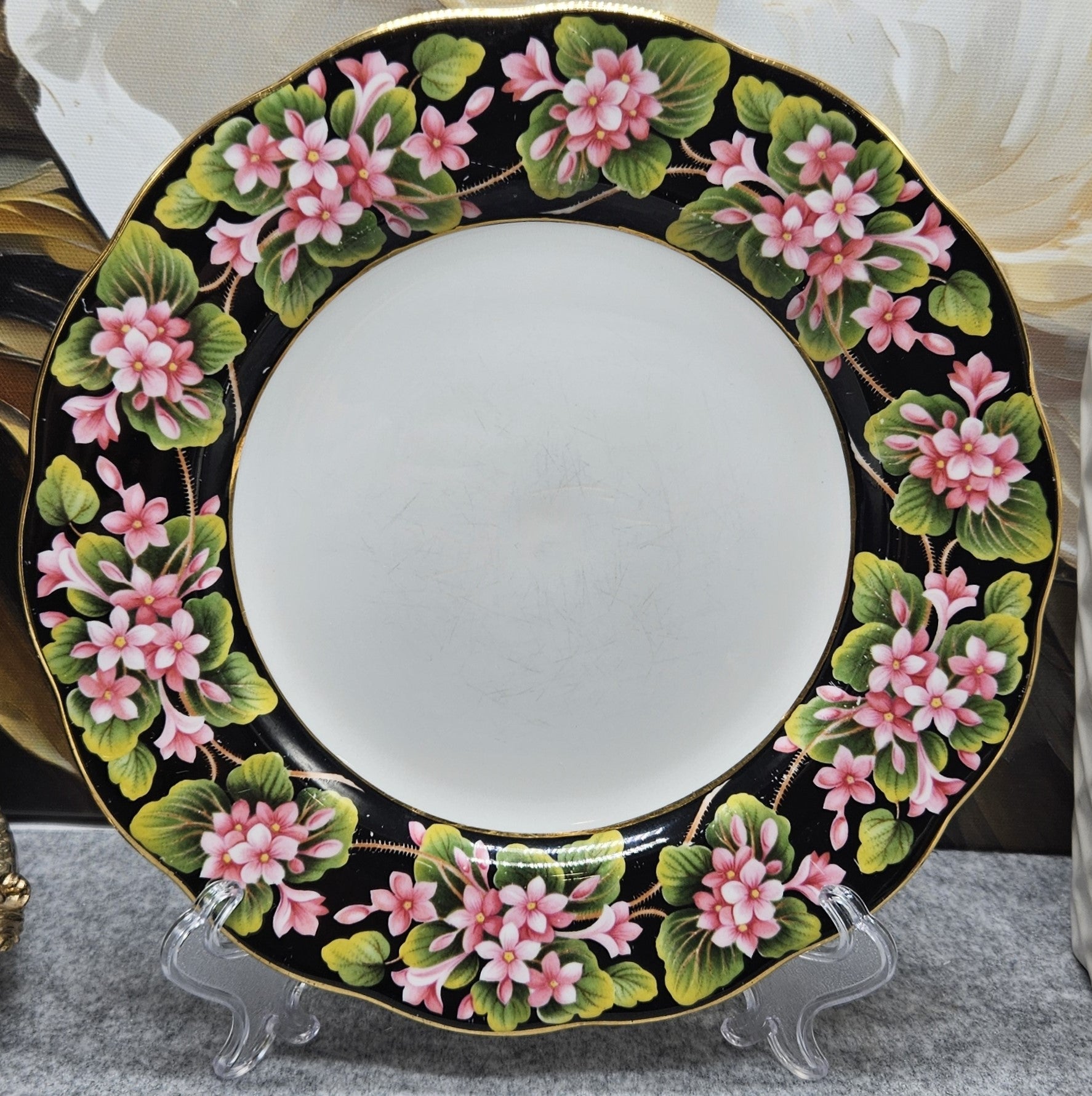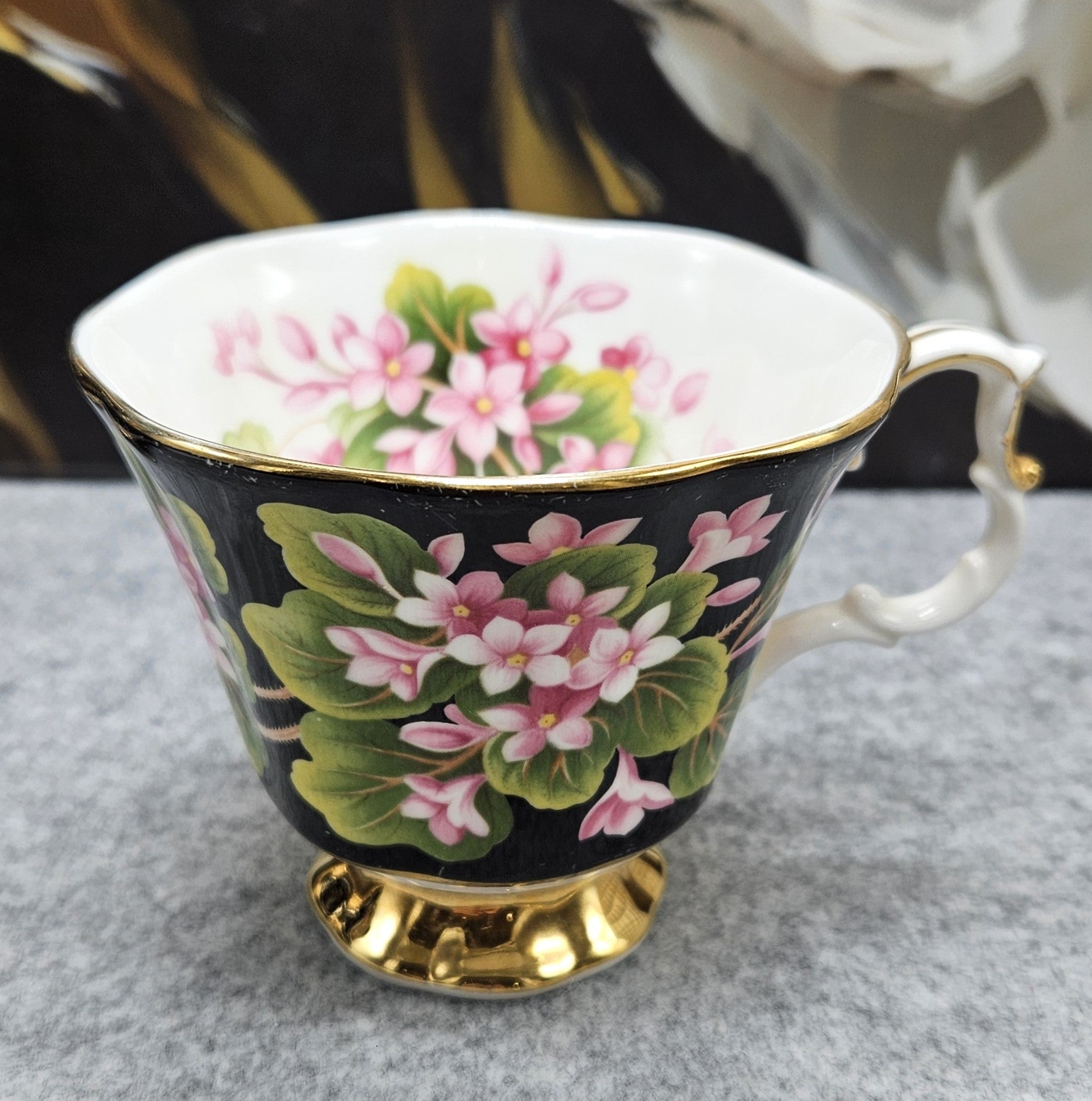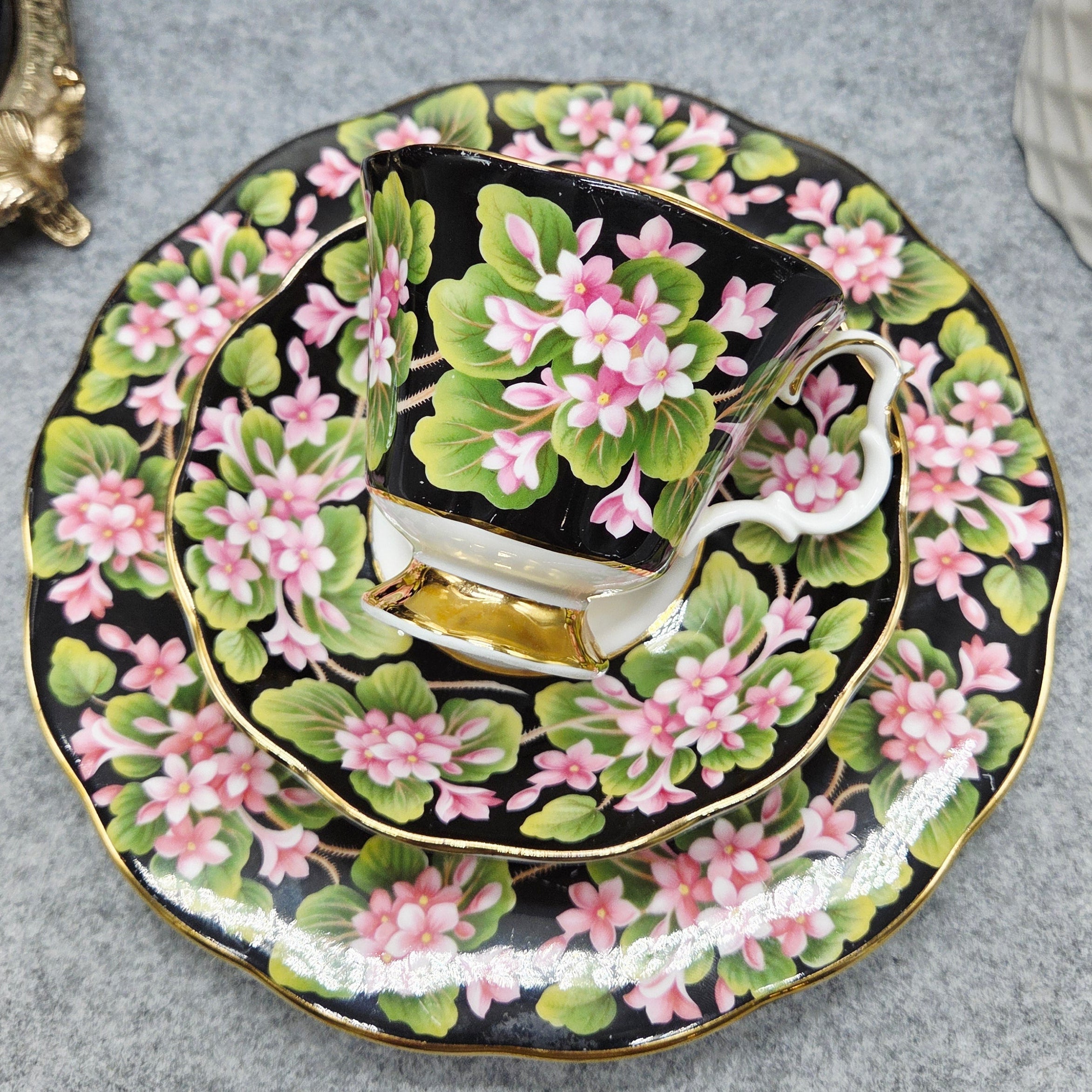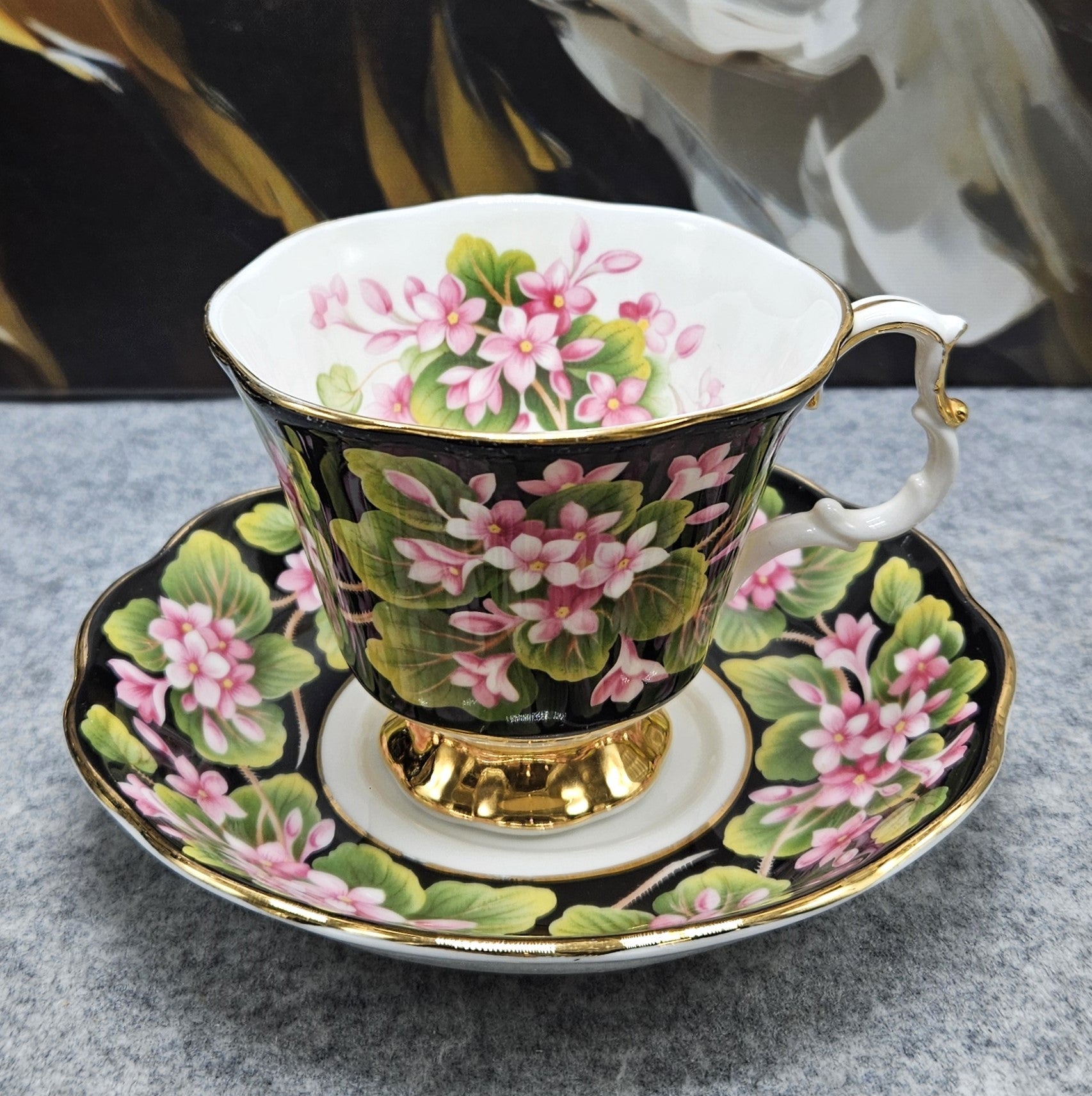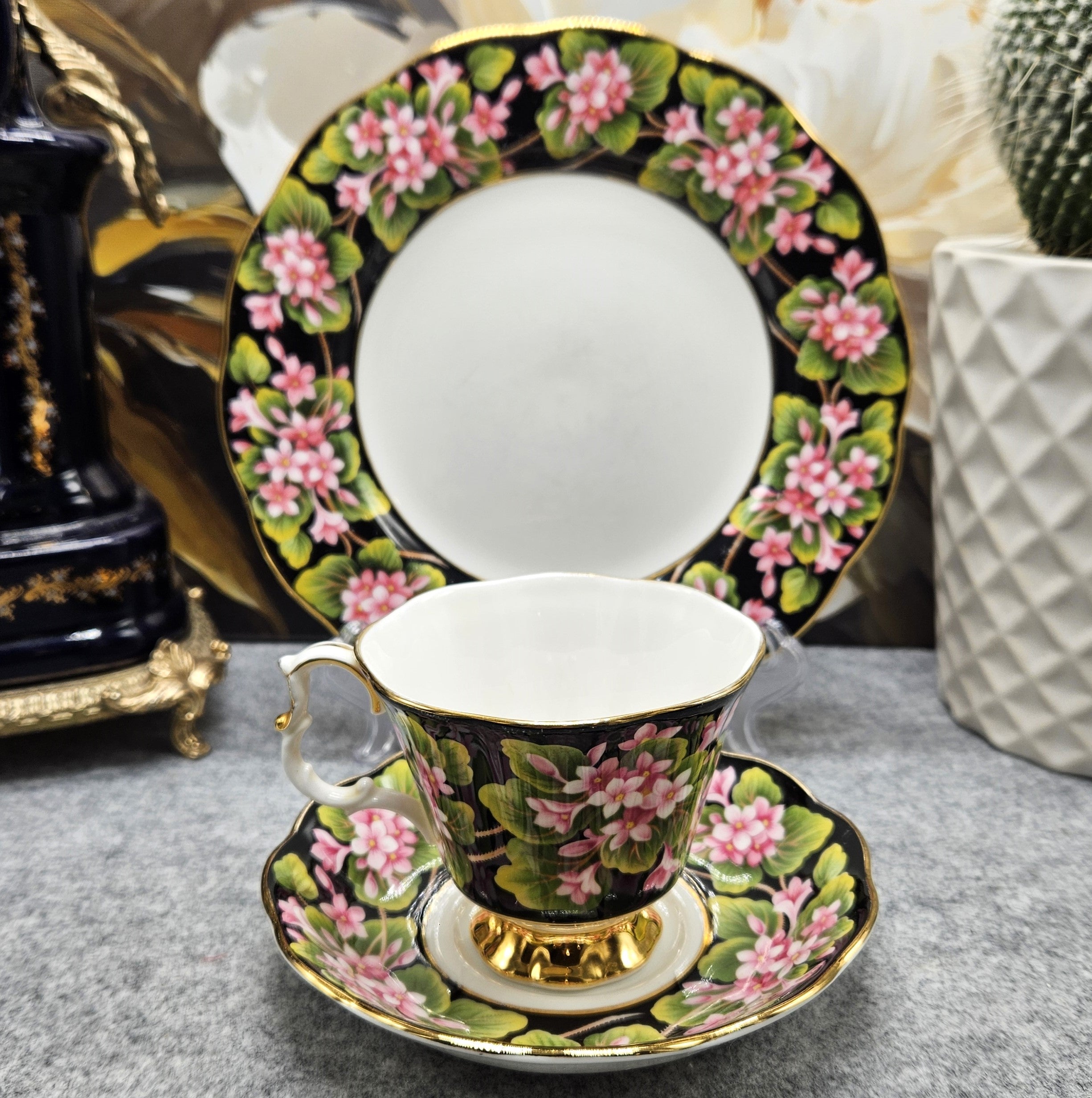 Komplektas dekoruotas sodriais žiedų motyvais tamsiame fone, subtiliai paryškintais auksiniais akcentais. Grakšti puodelio forma, auksu dengta kojelė ir rankenėlė suteikia rinkiniui prabangos pojūtį. Tai išskirtinis, dekoratyvus komplektas, puikiai tinkantis tiek kolekcijai, tiek iškilmingam stalo serviravimui.