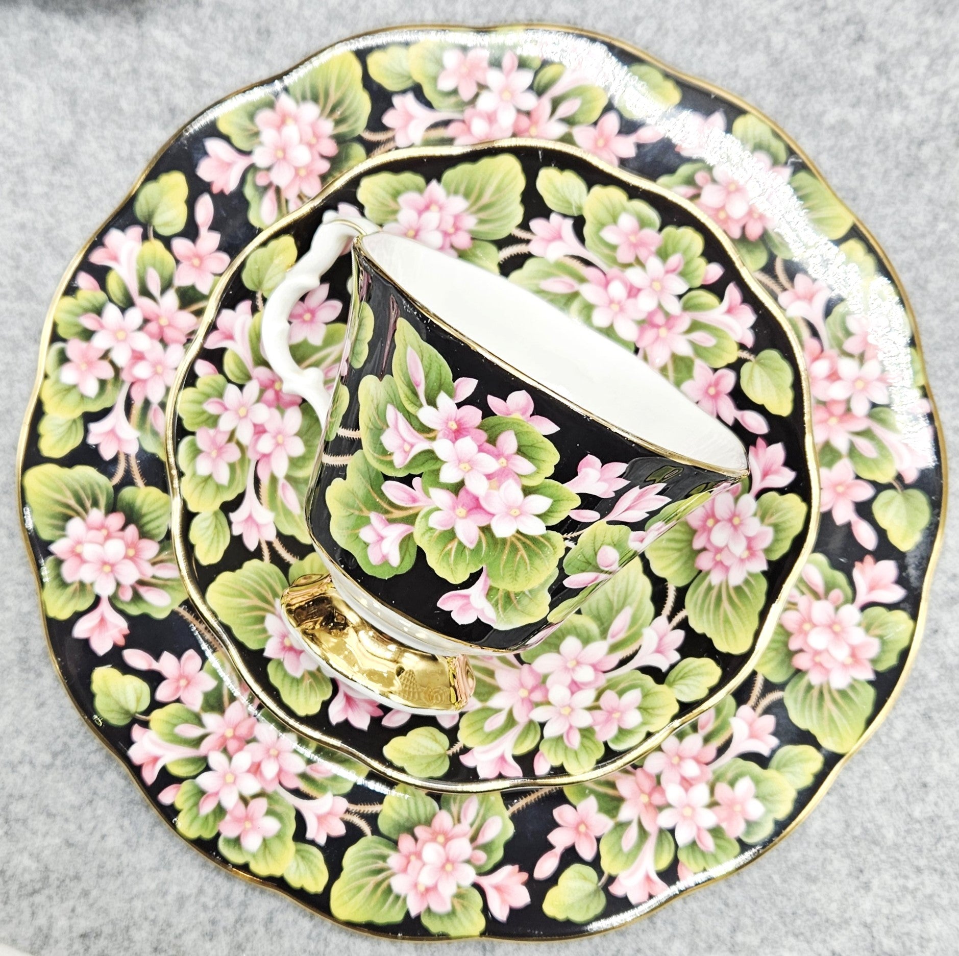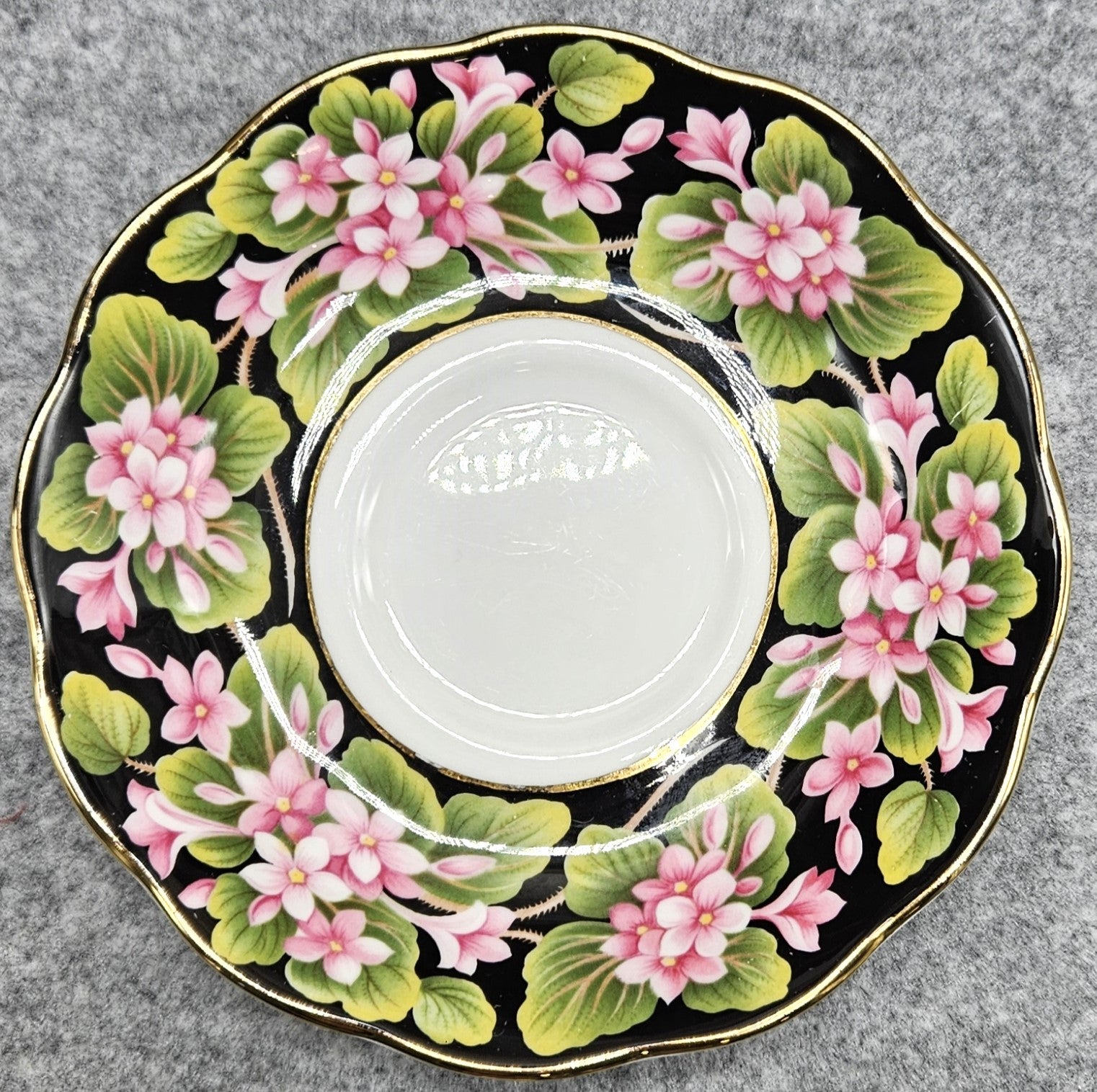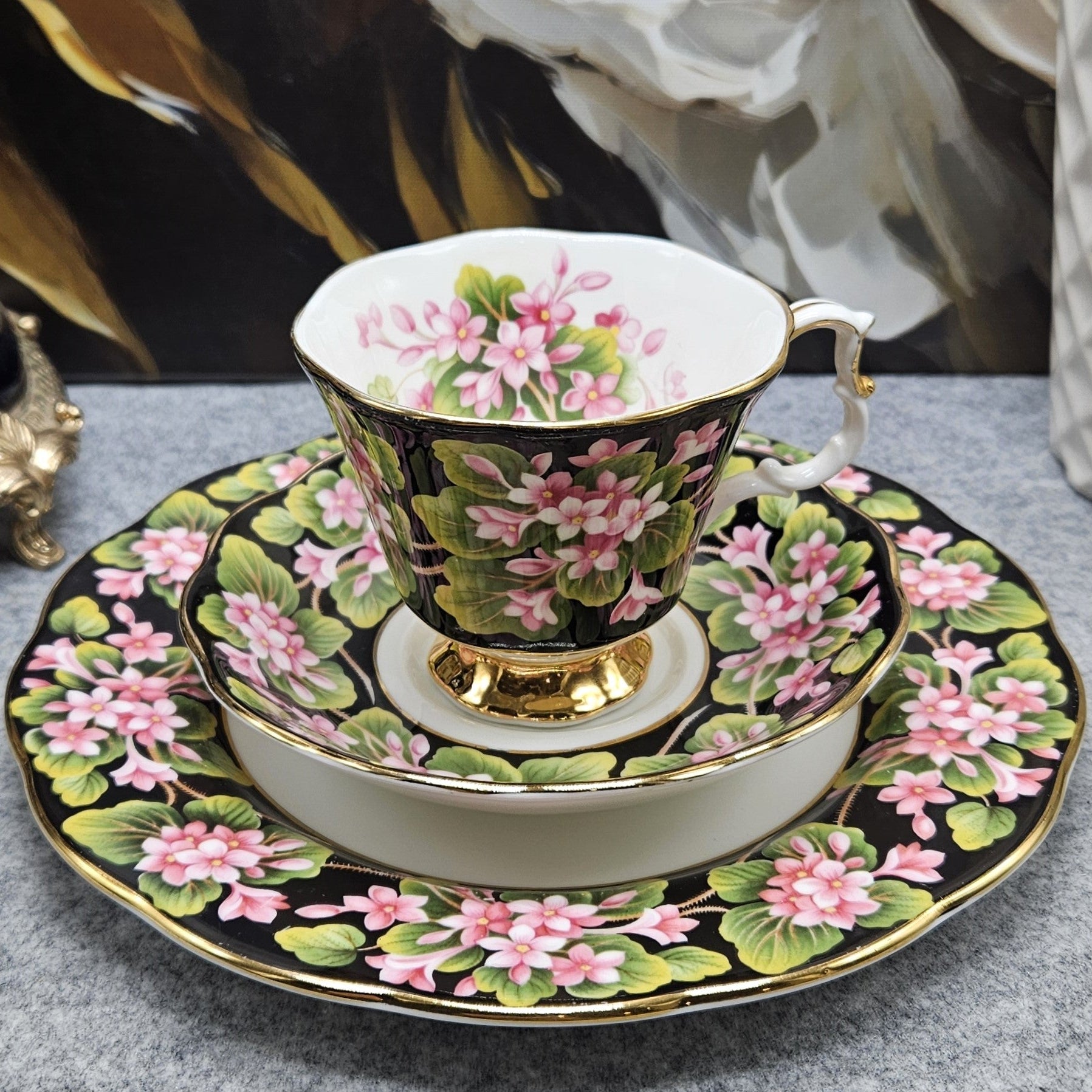 Elegantiškas „ROYAL ALBERT“ „Mayflower“ porceliano kavos/arbatos TRIO (1 puodelis + 2 lėkštutės). (~190 ml)