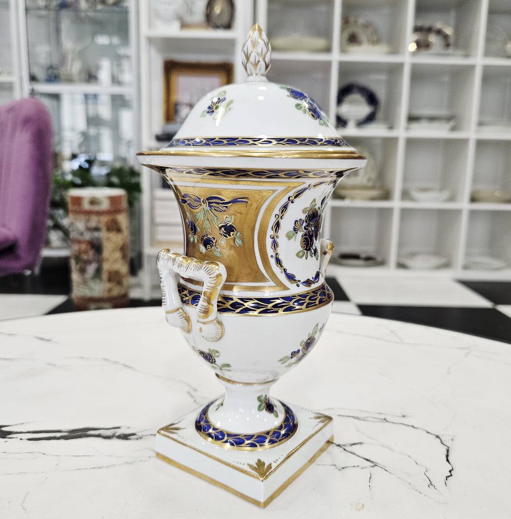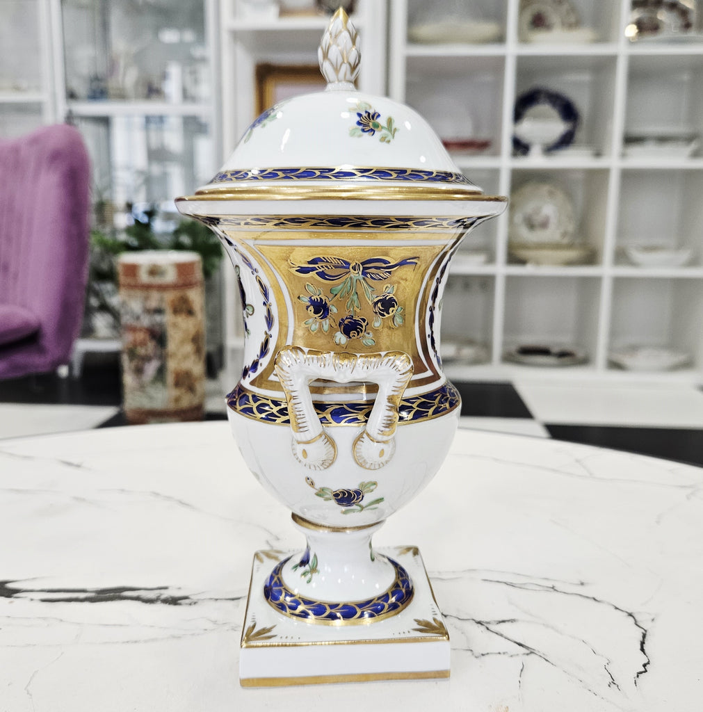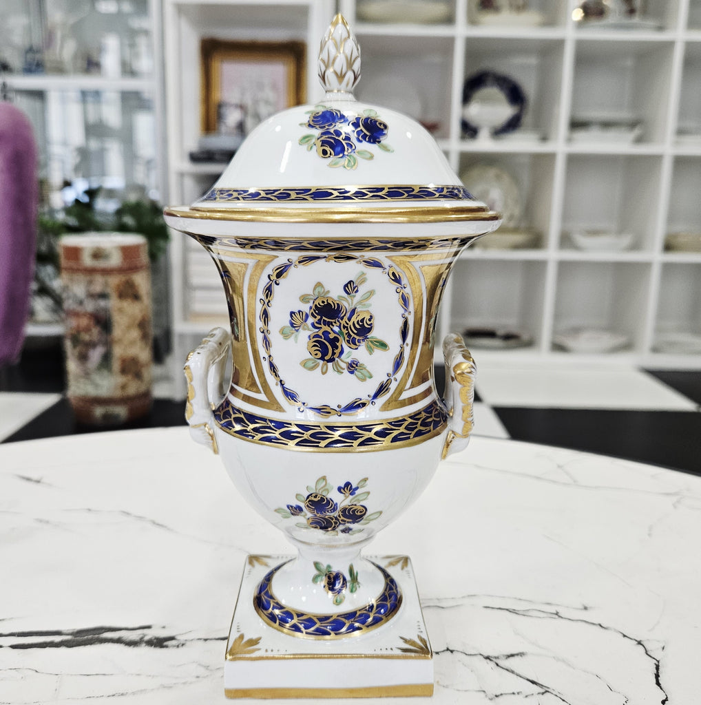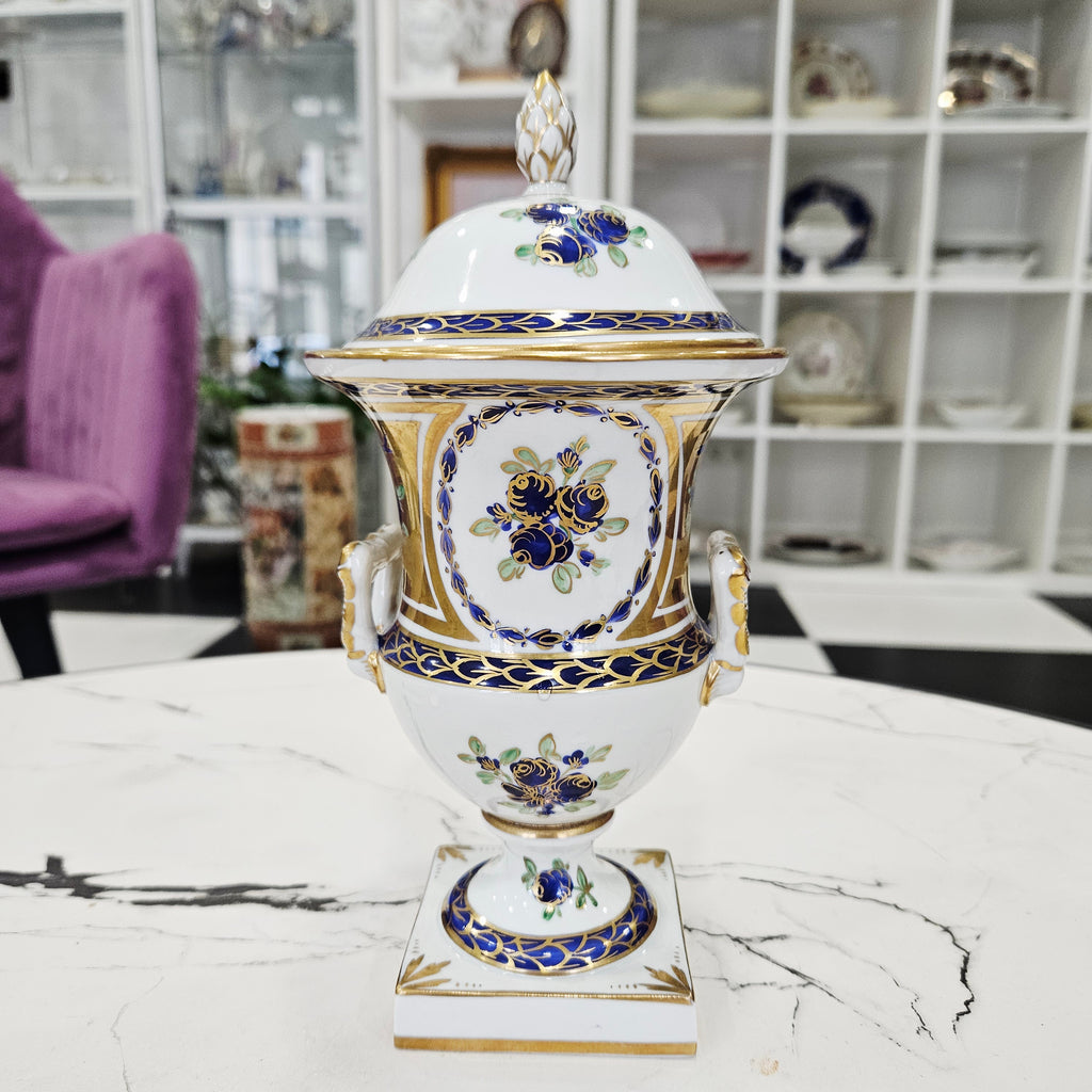 Prabangi porceliano vaza su dangčiu, dekoruota sodria kobalto mėlyna spalva, aukso ornamentais ir ranka tapytomis gėlių kompozicijomis. Vaza amforos formos, stovi ant kvadratinės pagrindo kojelės, šonuose – dvi dekoratyvinės rankenėlės.