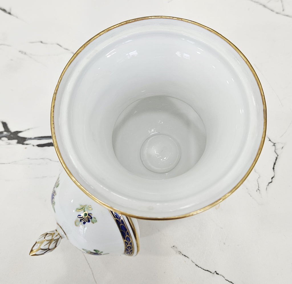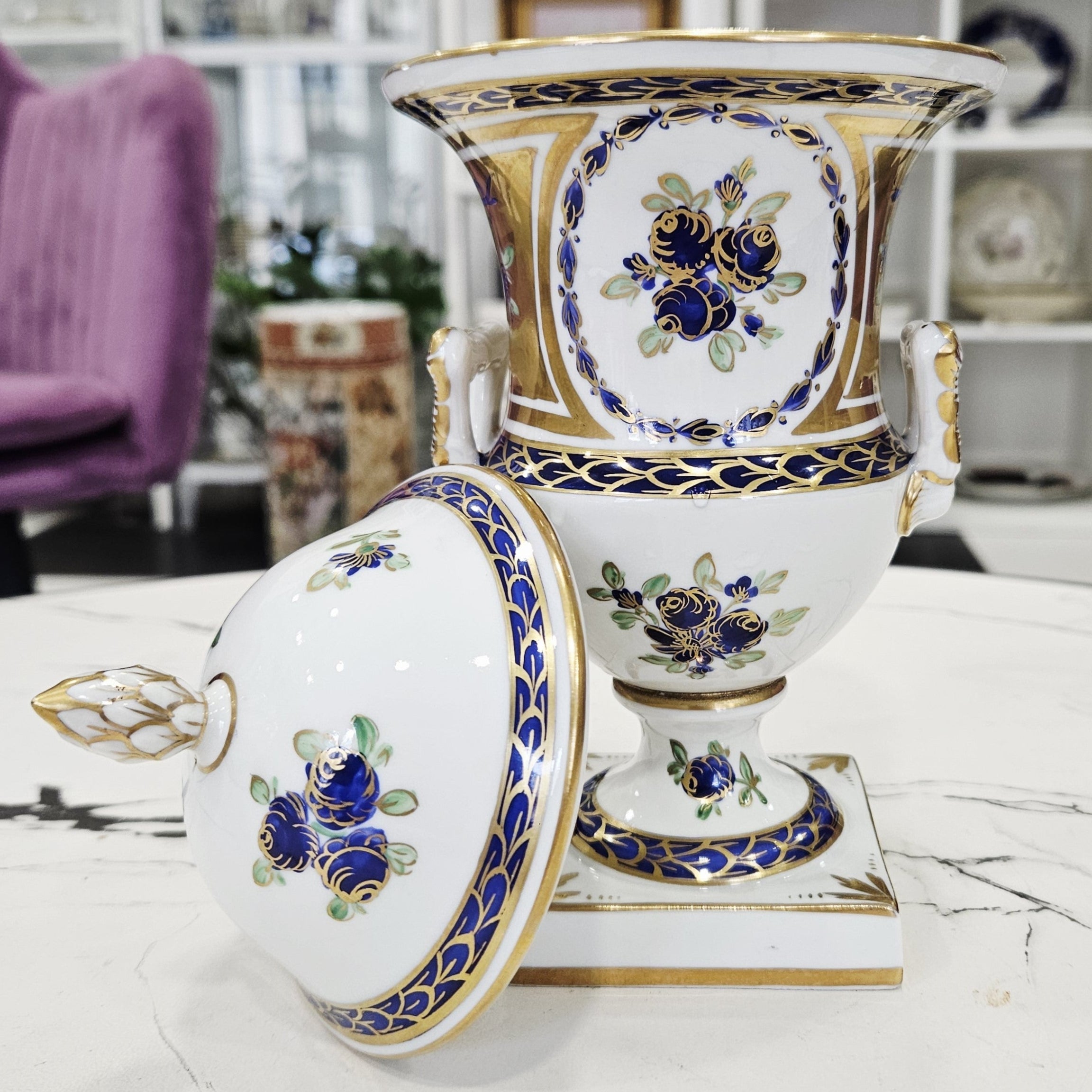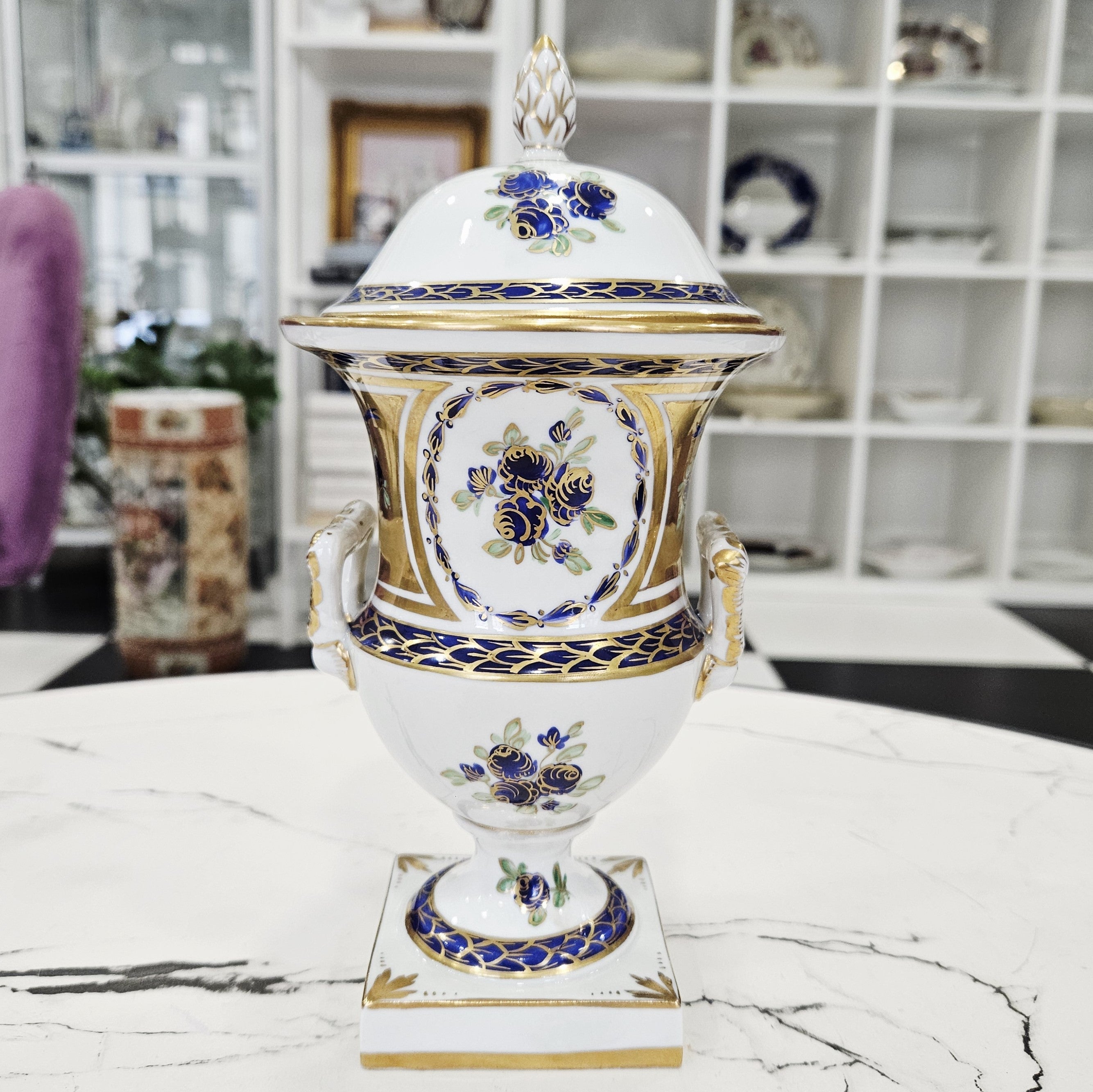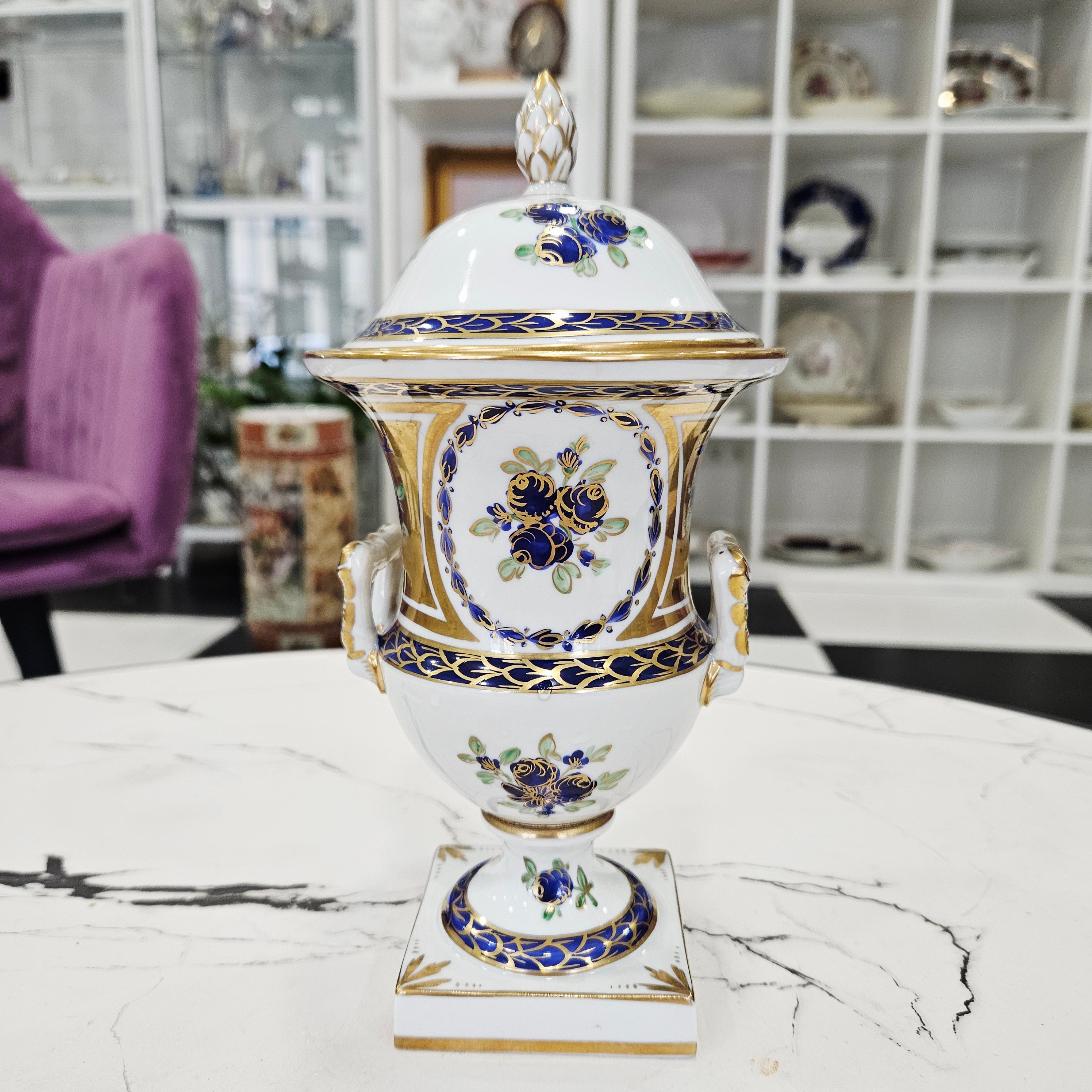 Prabangi porceliano vaza su dangčiu, dekoruota sodria kobalto mėlyna spalva, aukso ornamentais ir ranka tapytomis gėlių kompozicijomis. Vaza amforos formos, stovi ant kvadratinės pagrindo kojelės, šonuose – dvi dekoratyvinės rankenėlės.