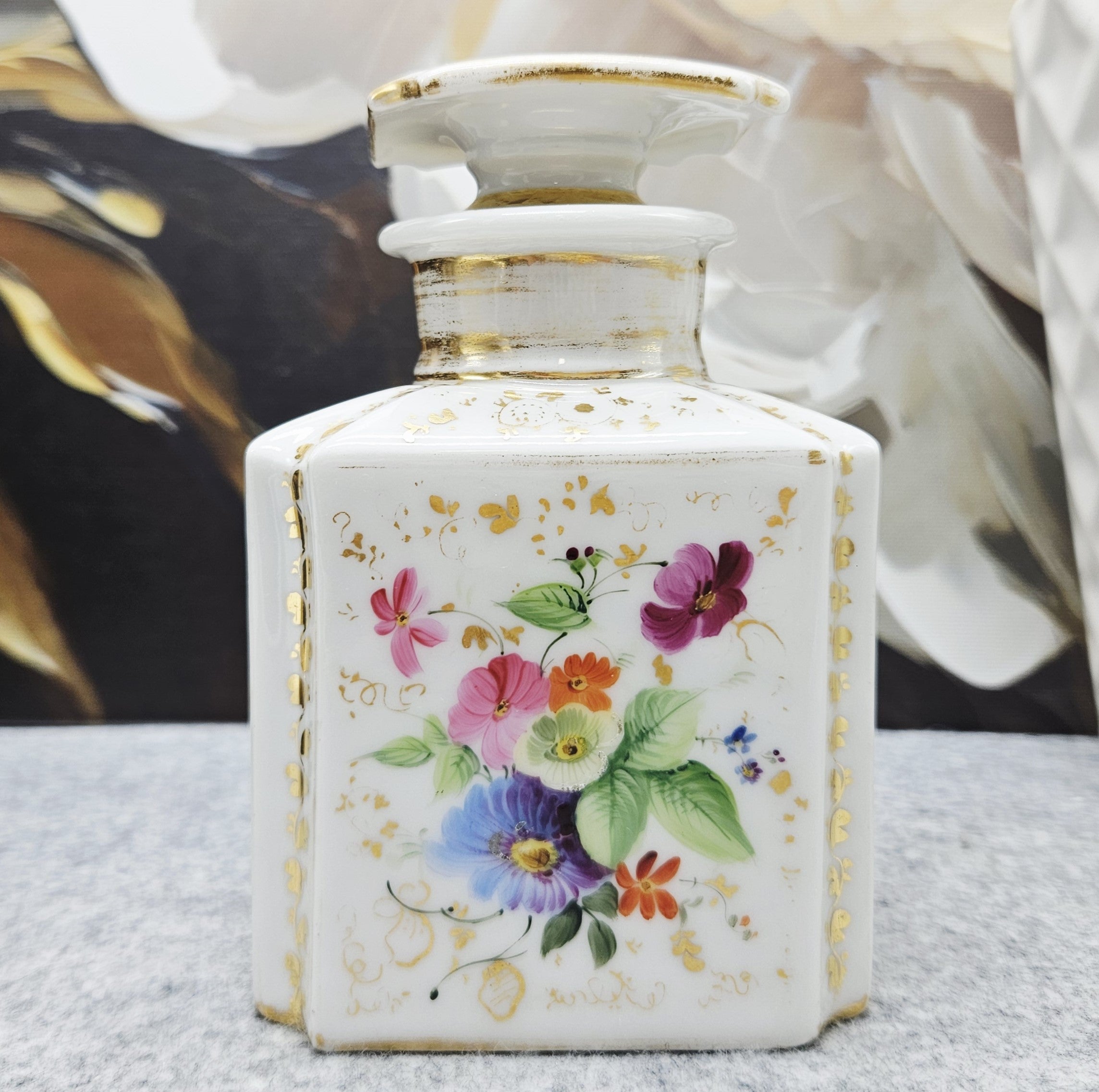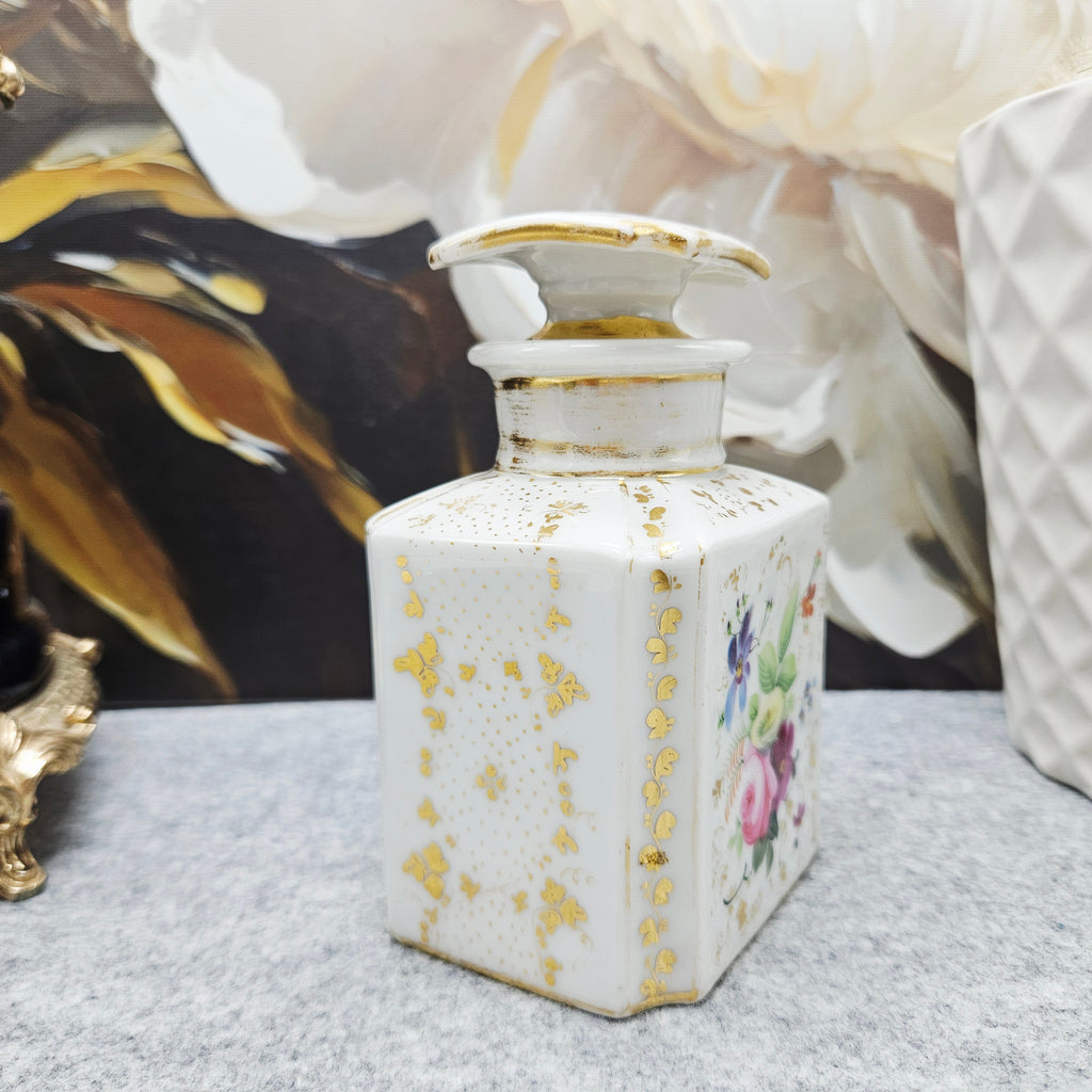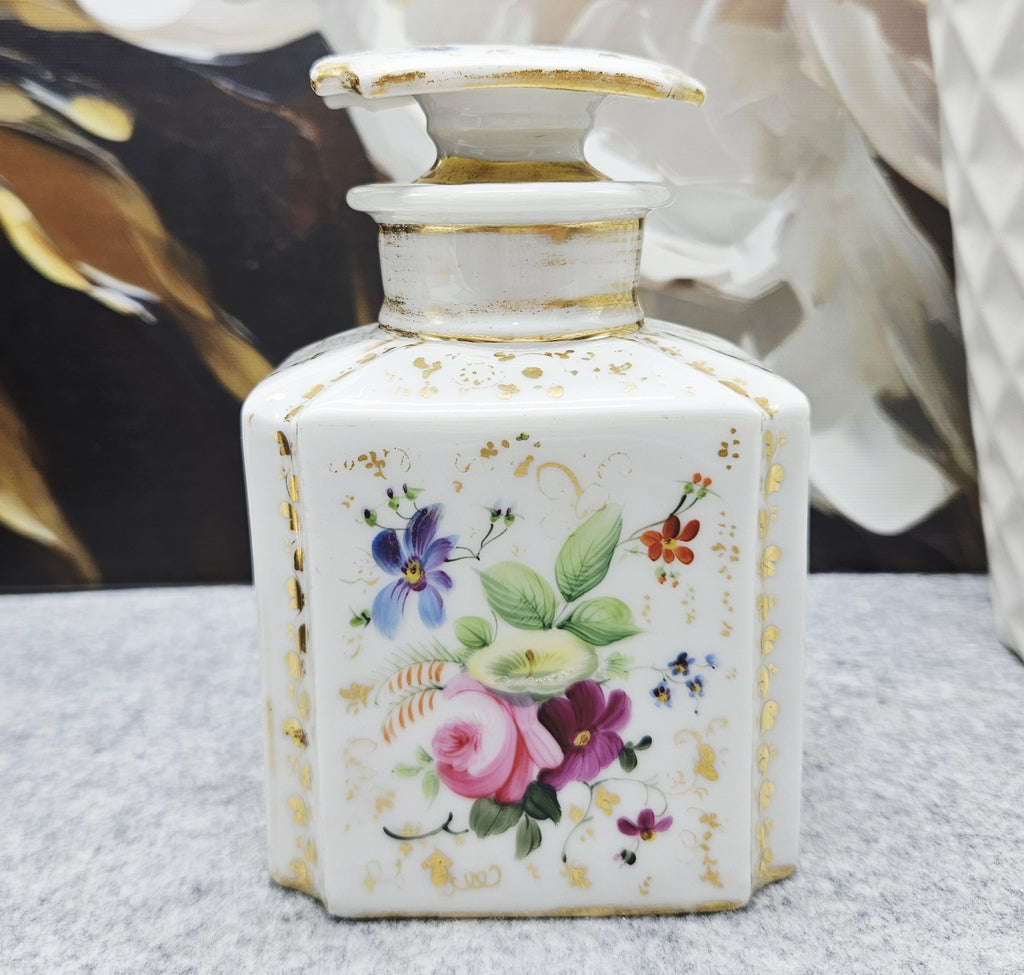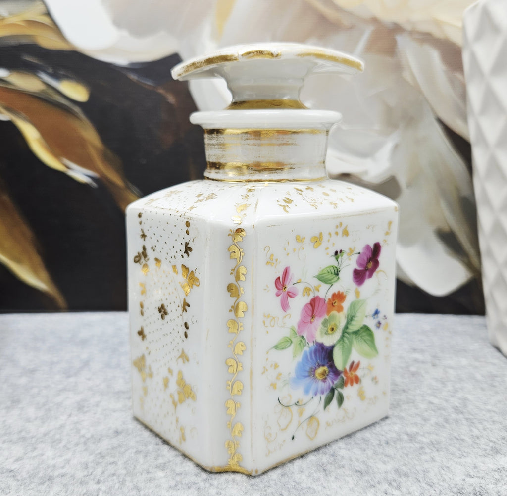 Antikvarinis prancūziškas porcelianinis buteliukas su dangteliu. Pagamintas XIX a. pabaigoje – XX a. pradžioje. Baltas porcelianas dekoruotas rankomis tapytais polichrominiais gėlių motyvais – rožėmis, našlaitėmis, neužmirštuolėmis bei kitais augalais. Kompozicijas papildo subtilūs aukso ornamentai bei rankomis atlikti puošybos elementai, suteikiantys prabangos ir elegancijos. Kvadratinė forma su švelniai užapvalintais kraštais ir originalus dangtelis daro šį buteliuką išskirtiniu kolekciniu eksponatu. Tai puikus prancūziško porceliano meistrystės pavyzdys, tinkantis tiek kolekcionavimui, tiek interjero dekorui.