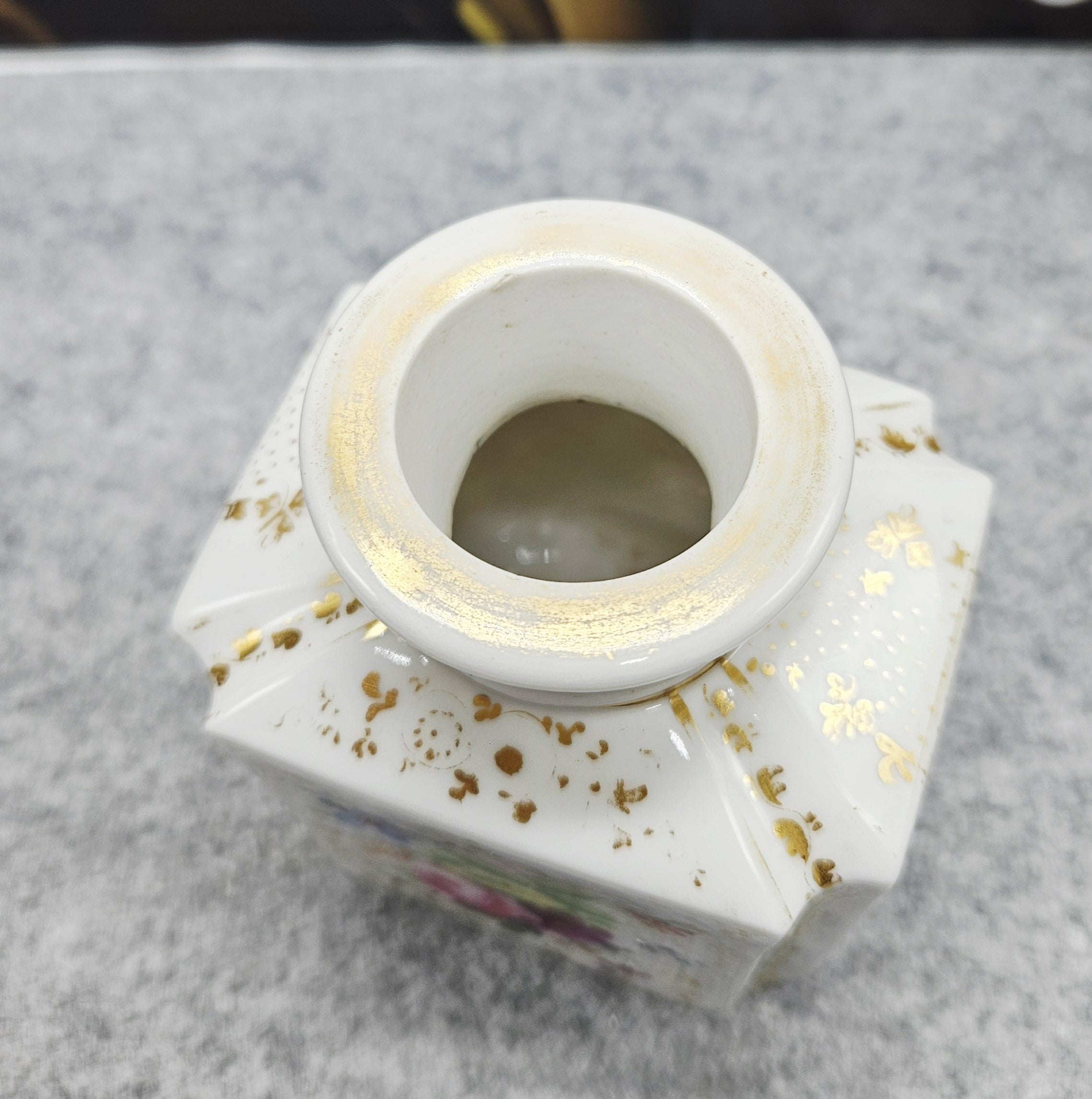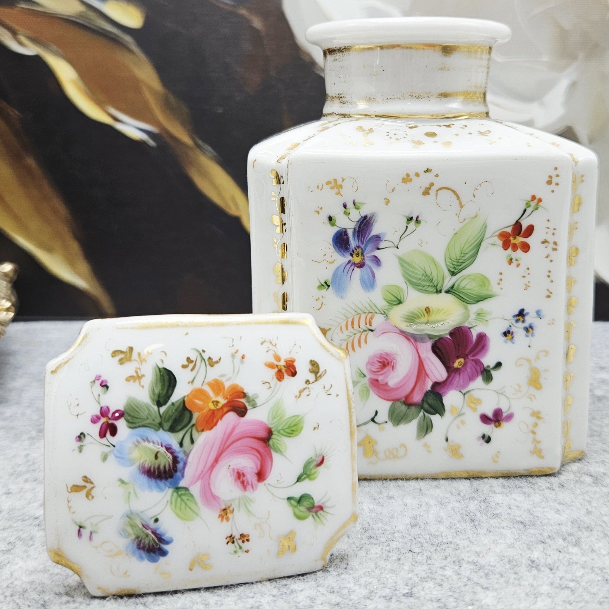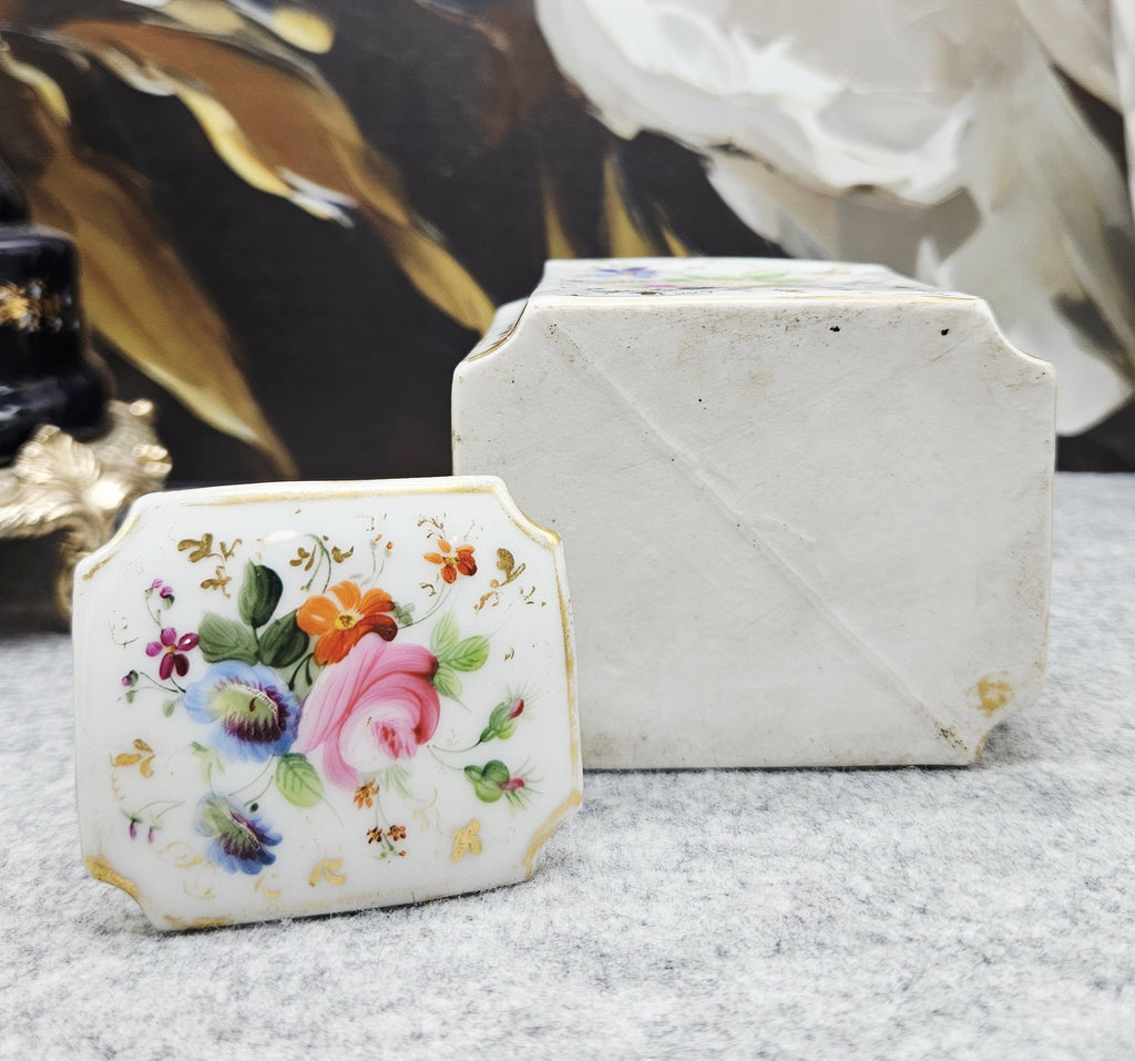 Antikvarinis prancūziškas porcelianinis buteliukas su dangteliu. Pagamintas XIX a. pabaigoje – XX a. pradžioje. Baltas porcelianas dekoruotas rankomis tapytais polichrominiais gėlių motyvais – rožėmis, našlaitėmis, neužmirštuolėmis bei kitais augalais. Kompozicijas papildo subtilūs aukso ornamentai bei rankomis atlikti puošybos elementai, suteikiantys prabangos ir elegancijos. Kvadratinė forma su švelniai užapvalintais kraštais ir originalus dangtelis daro šį buteliuką išskirtiniu kolekciniu eksponatu. Tai puikus prancūziško porceliano meistrystės pavyzdys, tinkantis tiek kolekcionavimui, tiek interjero dekorui.