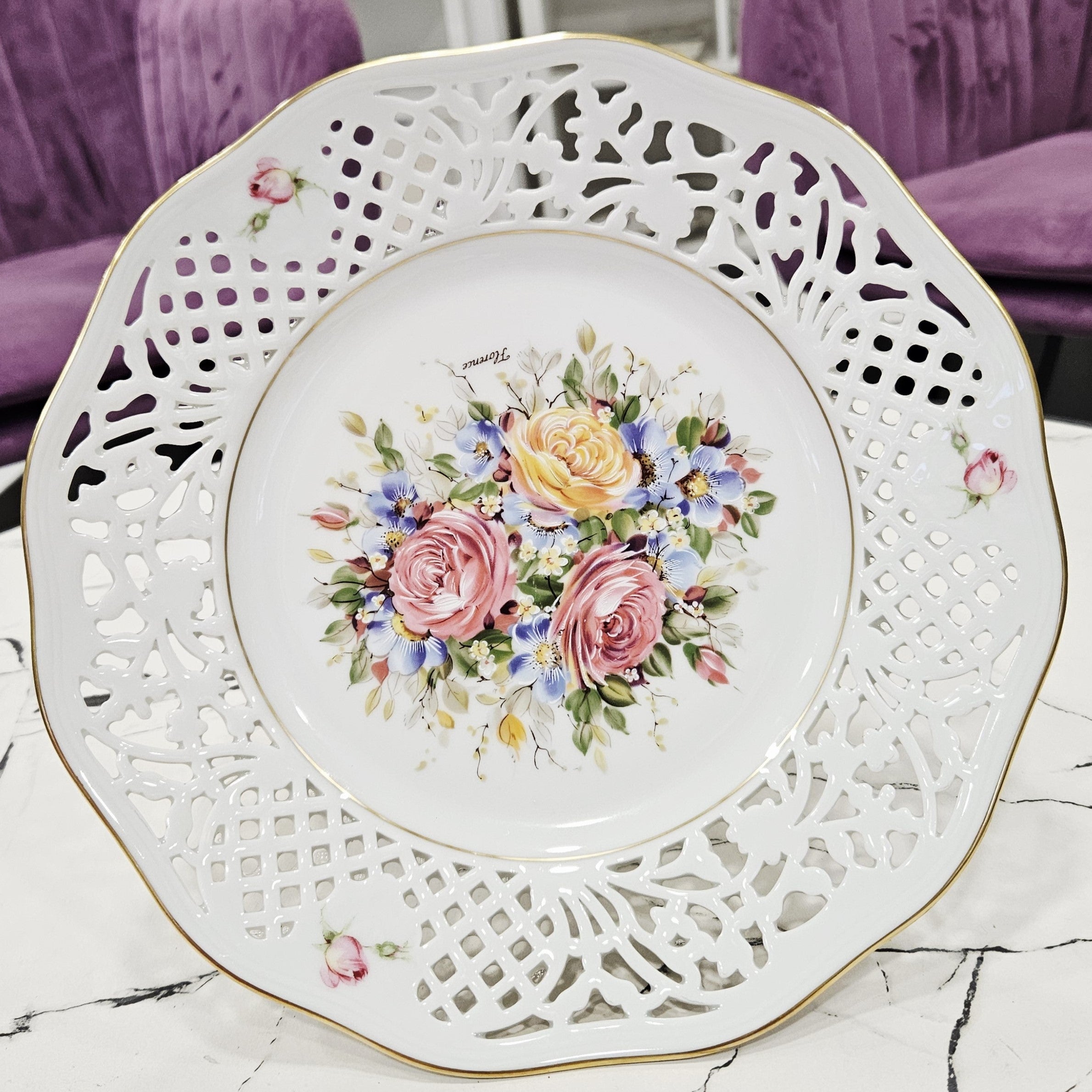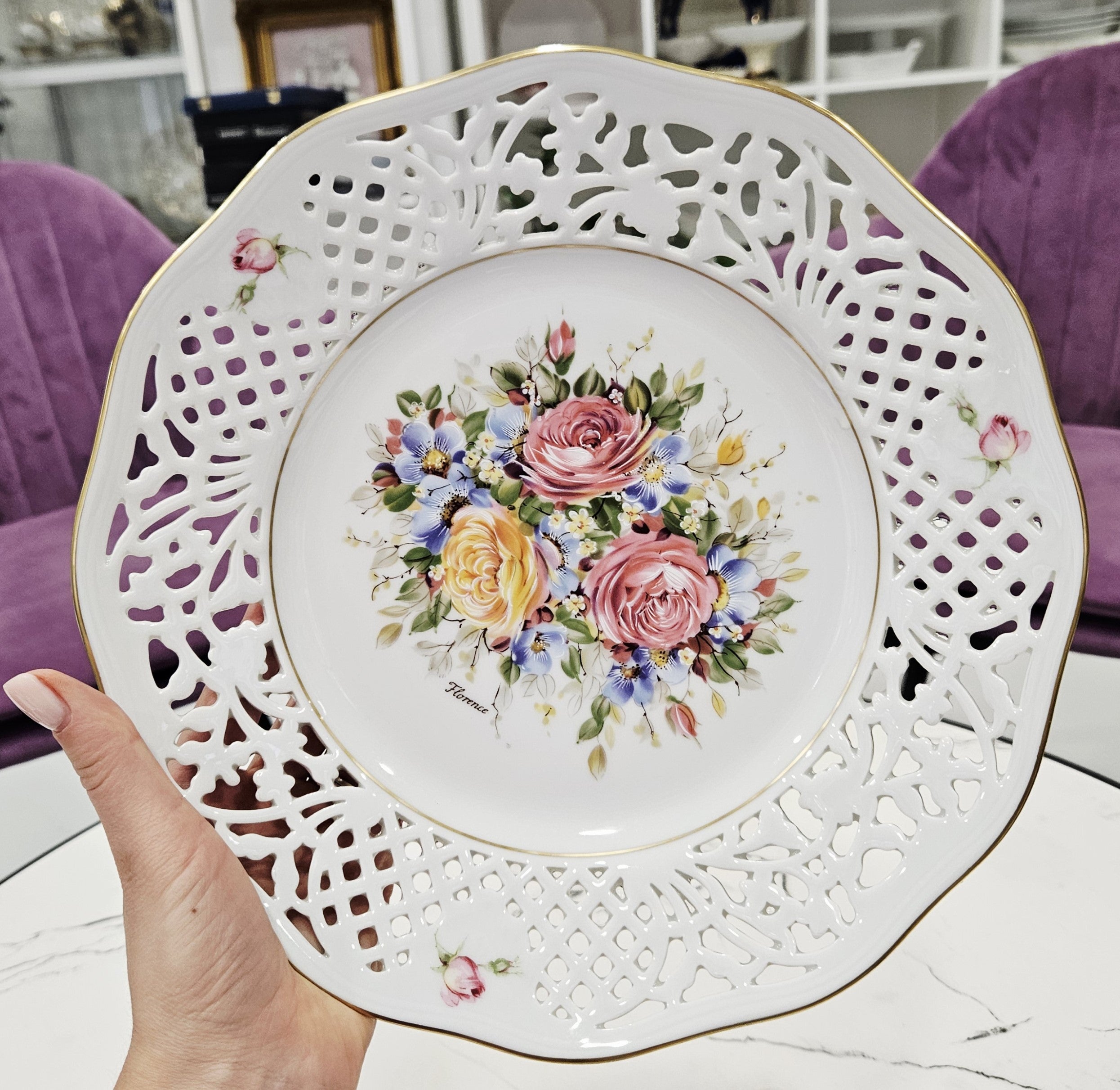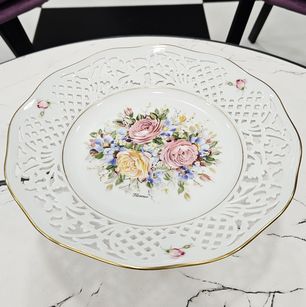 Lėkštės centre įkomponuotas žavingas rankomis tapytų rožių ir gėlių žiedų puokštės motyvas, o kraštai papuošti meistriškai išpjaustytu ažūriniu porcelianu, suteikiančiu lengvumo, elegancijos ir kolekcinės vertės. Švelniai žvilganti auksinė briauna dar labiau išryškina formos grakštumą ir Bavarijos meistrų kruopštumą.