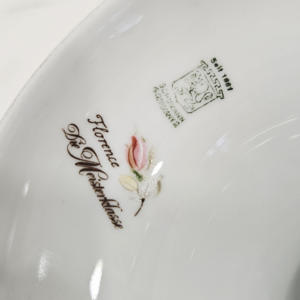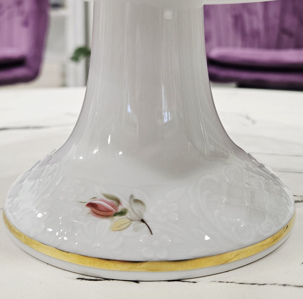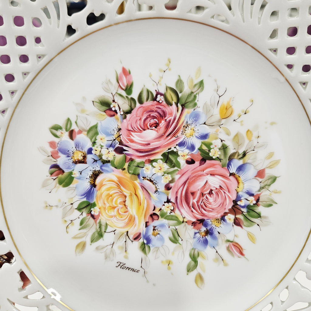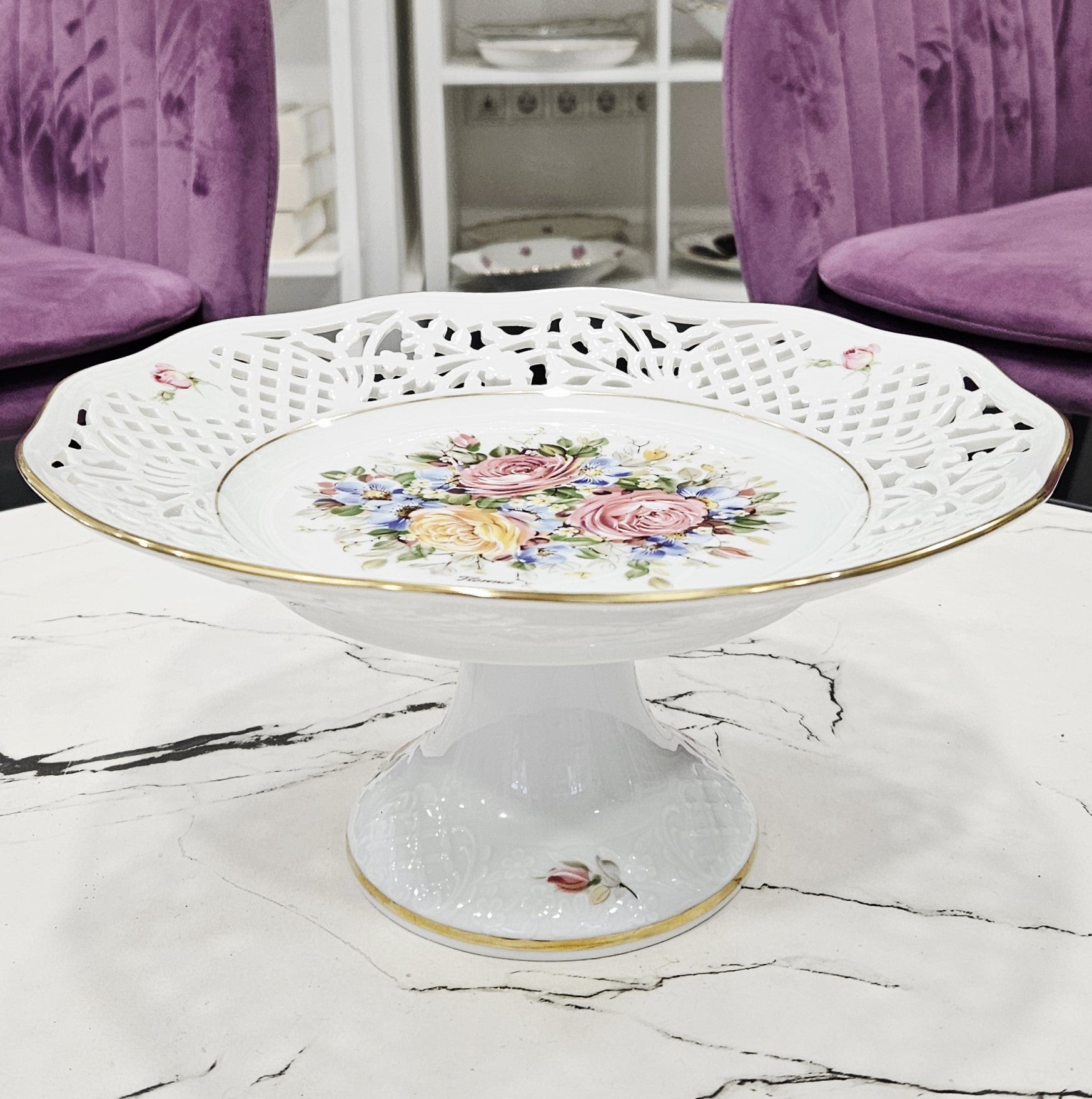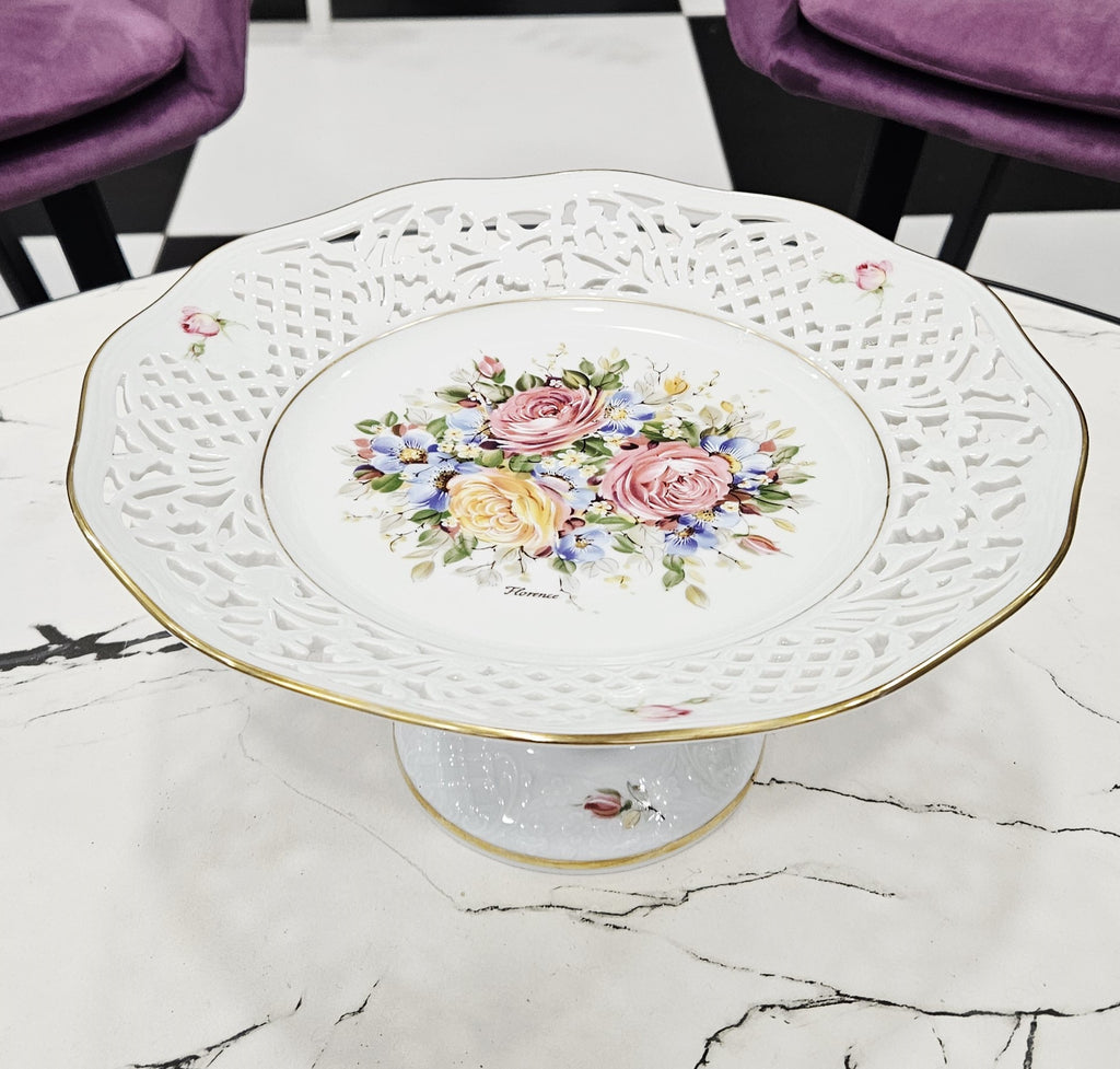 Išskirtinio grožio Schumann Arzberg Germany porceliano desertinė lėkštė ant aukštos, grakščios kojelės – tai tikras vintažinės prabangos akcentas, sukurtas garsiojoje Bavarijos porceliano manufaktūroje. Ši lėkštė priklauso prestižinei „Florence – Die Meisterklasse“ kolekcijai, garsėjančiai ypatinga kokybe, subtiliais ažūriniais ornamentais ir neprilygstamu rankų darbo dekoru.